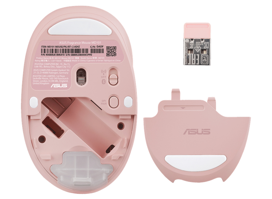 ASUS Fragrance Mouse MD101 оснащена сменным флаконом ароматизатора и тефлоновыми ножками, поддерживает смену разрешений и два способа подключения к компьютеру.