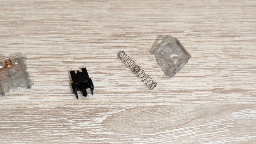 Производитель дополнительно положил четыре переключателя Leobog Ink Crystal: механический тактильный тип, усилие срабатывания 50+-3 г и 64+-3 г до упора, точка срабатывания 1.9+-0.3 м, а полный ход 3.4+-0.3 мм, тяжеленькие и укороченные переключатели. Тоже смазаны аккуратно, как и те, что установлены в клавиатуре.
