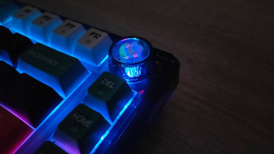Подсветка включается при подключении клавиатуры. Она слепая, т.к. материал колпачков непрозрачен. Впрочем, кириллицы нет, поэтому даже при наличии подсветки легенды, все равно претензия останется. На мой вкус энкодер симпатичный и красиво подсвечивается. Возможно, это радуется всему блестящему внутренняя сорока.