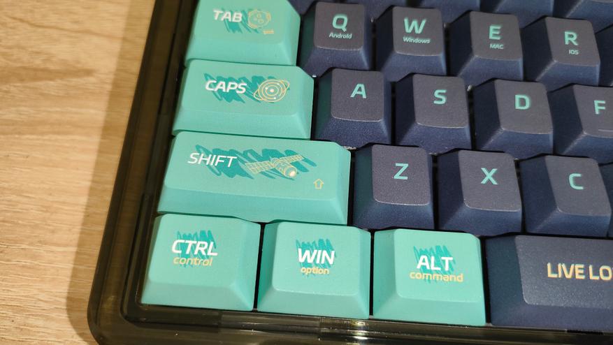 Формат ANSI 75% профиль Cherry/OEM подобный, и даже внешне он подходит к выбранному шрифту. Все клавиши вогнутые, кроме пробела, он выпуклый. Клавиша F1 находится над «2». Шифты широкие, Enter одноэтажный. Стрелки управления курсором отделены. Кроме цифрового блока, клавиатура еще потеряла Ins, End (они во втором слое на Del, Home), а также PrintScr, Scroll Lock и Pause/Break.