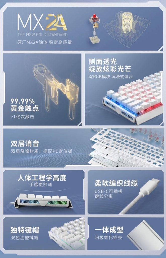 Подключение клавиатуры осуществляется через съемный USB-C кабель в оплетке. Переключатели MX2A, используемые в этой клавиатуре, отличаются стабильностью и высоким качеством, имеют технологию золотых перекрестных контактов и новую бочкообразную структуру шумоподавляющей пружины.