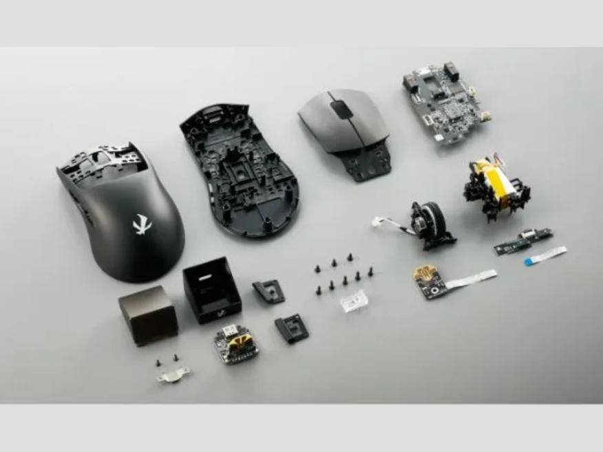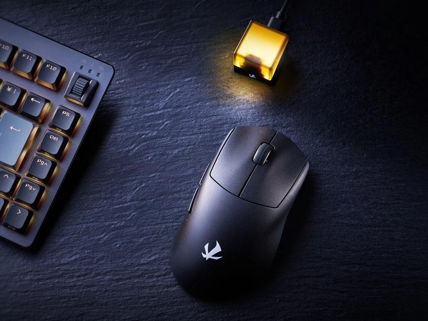 Мышь построена на сенсоре PixArt PAW3950 с чувствительностью до 30 000 DPI, скоростью отслеживания 750 IPS и ускорением 50G. Вариант среднего размера весит всего 59 г при габаритах 122x66x41 мм, а крупный — 64 г при размерах 130x70x43 мм. Конструкция эргономичная, с асимметричным изгибом и шестью кнопками. Для скольжения используются ножки из ПТФЭ толщиной 1 мм, а ресивер выполнен в виде куба с RGB-подсветкой.