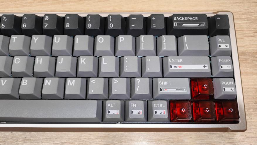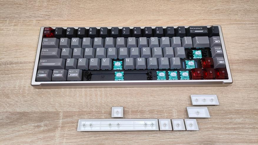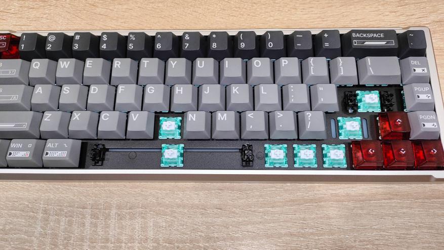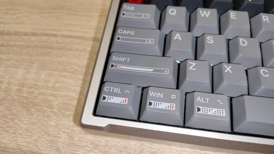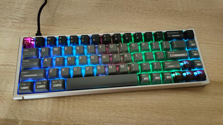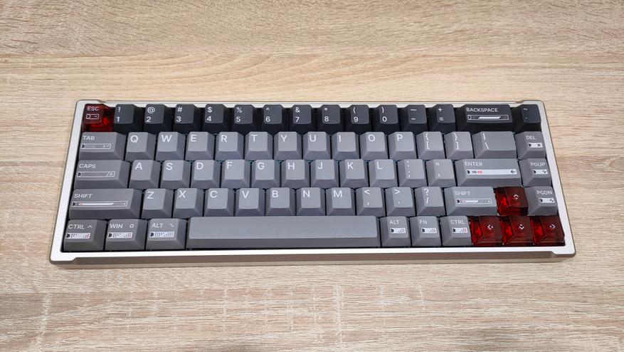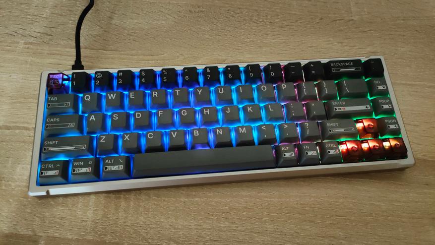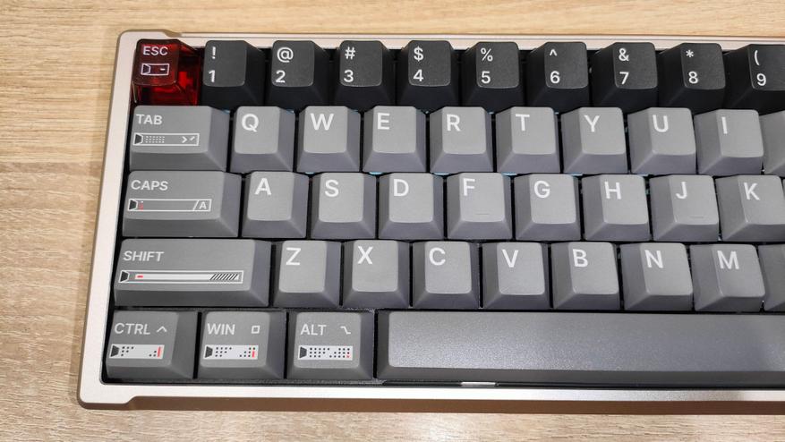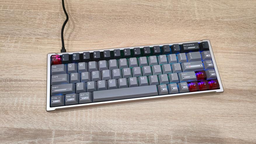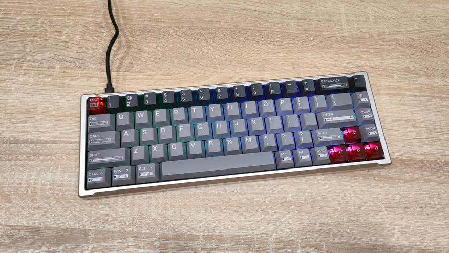 Формат клавиатуры 68% вызовет у многих негодование, т.к. многие тоскуют по цифровому блоку, так тут нет и блока редактирования и F-ряда. В продолжение добавлю, что раскладка ANSI, шифты широкие, Enter одноэтажный. Профиль колпачков распространенный OEM, все вогнутые, кроме пробела.