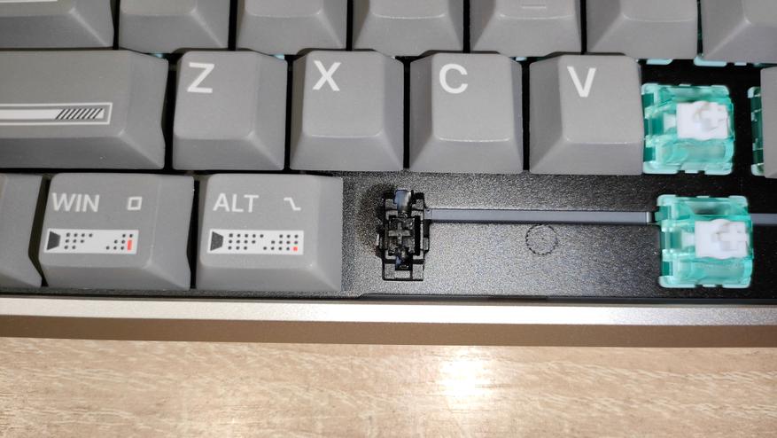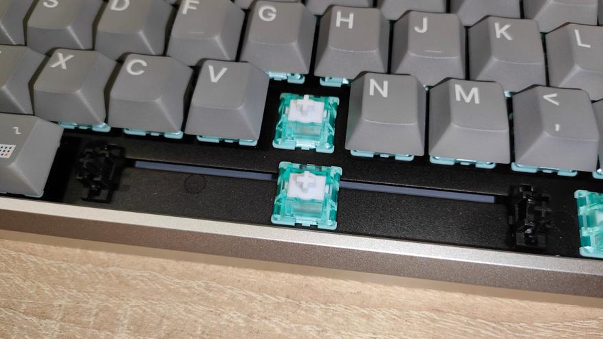В работе самой клавиатуры никаких нареканий нет. Скрежета, песка, звона, я не услышал и не почувствовал. Нажатия на удивления глухие, не какой-нибудь заветный «Thocky/Poppy», но чувствуется, что над клавиатурой работал. Каких-то дребезгов внутри неслышно, в принципе для этого и силиконовая прокладка и нужна, чтобы гасить такие штуки. А вот болезнь простых стабилизаторов никуда не делась и с одной стороны проявляется, я, конечно же, дам послушать. Клавиатура далеко не бюджетная, и почему бы не поставить туда стабилизаторы более продвинутого уровня — загадка. Но учитывая, что кто-то рад клавиатуре за 1.5-2.5 тыс. рублей, то стоит понимать, что проблема иногда высасывается из пальца, но и не сказать об этом нельзя. По сути, кроме пробела у меня вопросов к устройству ввода нет, разве что, нет и прокладок, на которой клавиатура прогибается.