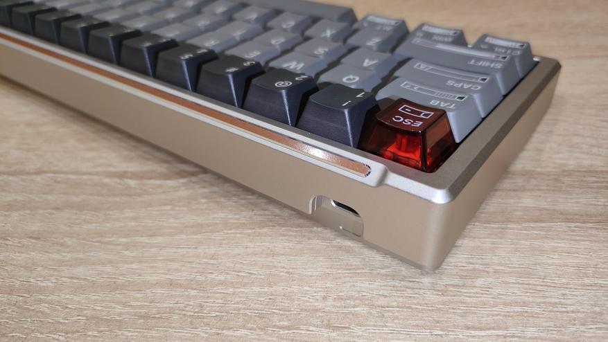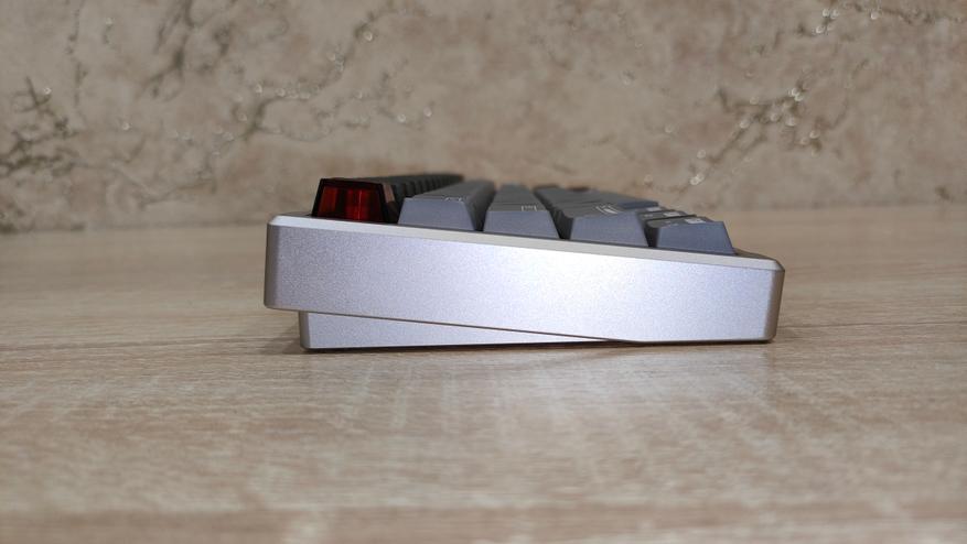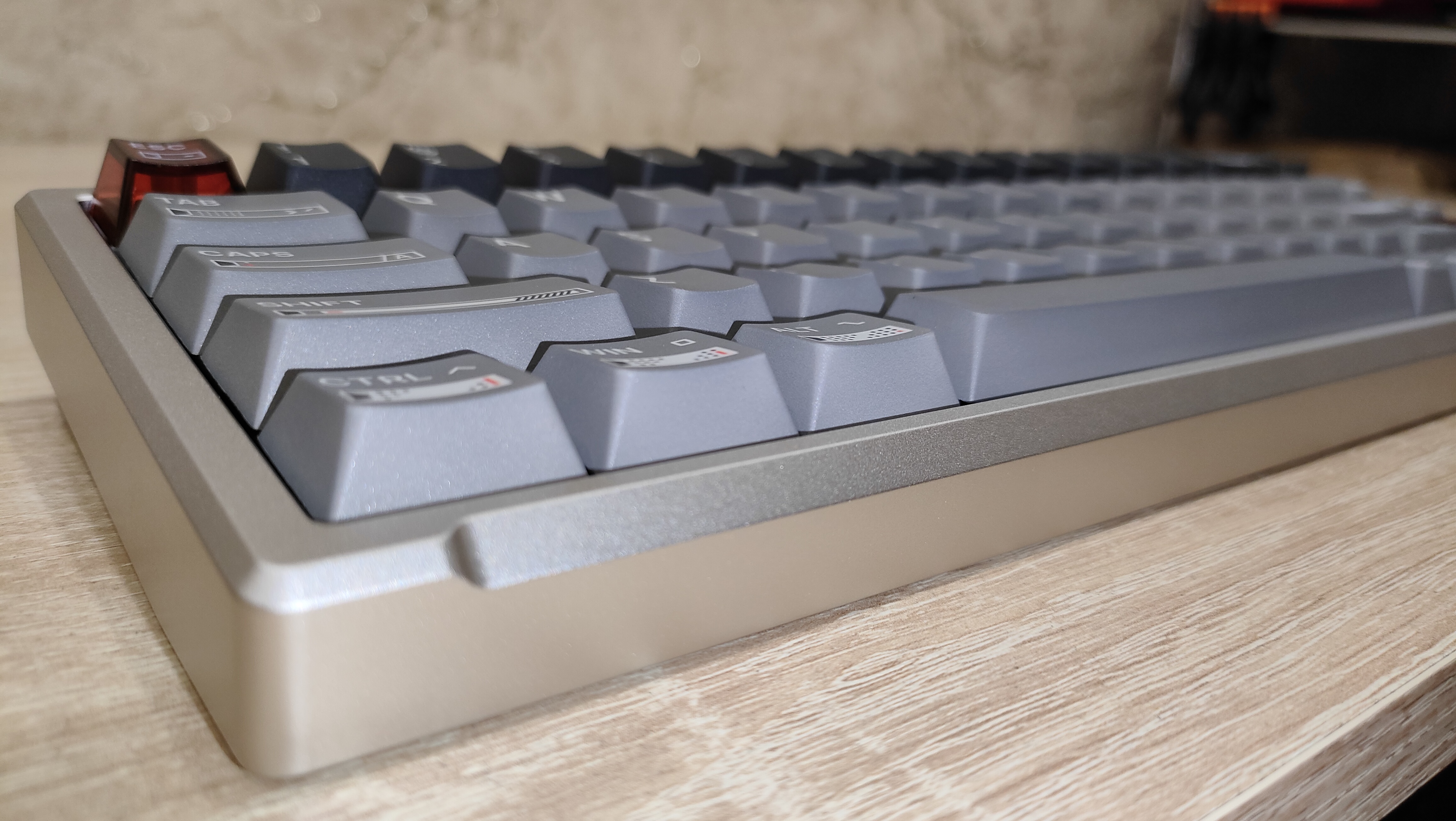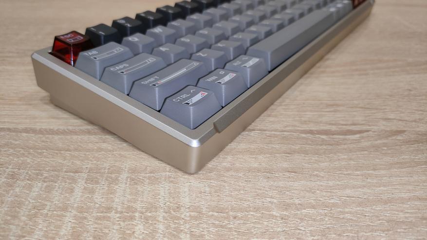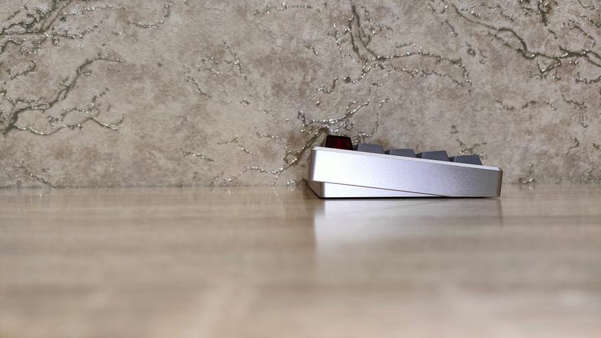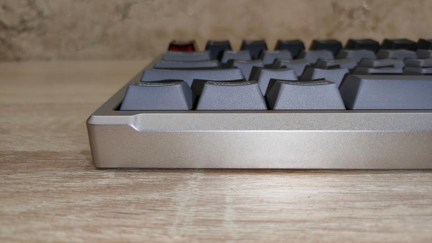 Клавиатура очень компактная, увесистая и в целом симпотная, возможно, из-за красных акцентов, а может из-за корпуса цвета «шампань». Спереди и сзади есть что-то типа фаски, которая есть только в версии Pro, она как раз и обозревается. На тыловой фаске есть вставка рыжего цвета, что-то вроде меди, любопытная деталь, которую пользователь, наверное, никогда не увидит, но будет знать о ее существовании. Красные колпачки, как обычно это и бывает у прозрачных колпачков в последнее время, изготовлены из поликарбоната. Почему-то мне не видятся они тут инородным элементом дизайна, в общем, пойдет, все интереснее, чем всякие клавиатуры в ч/б гамме.
