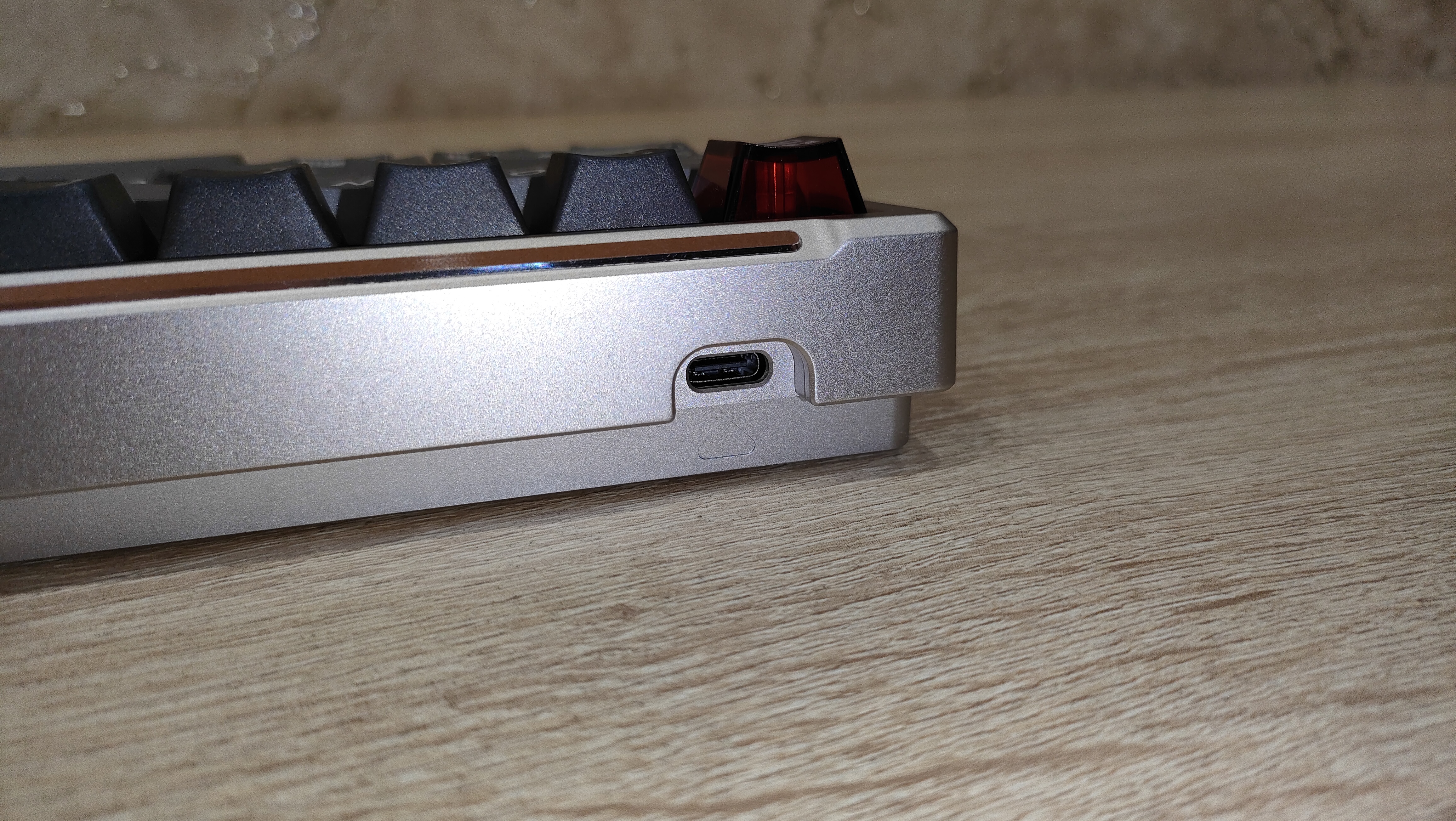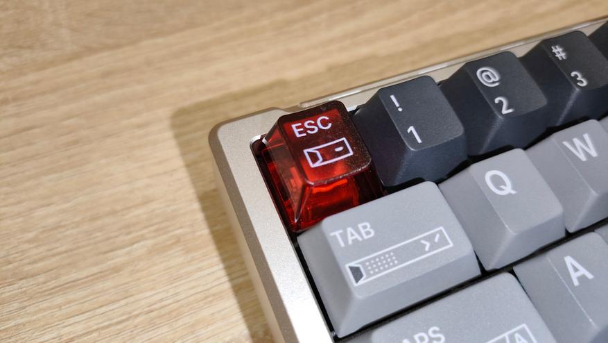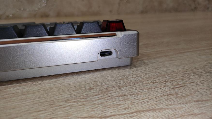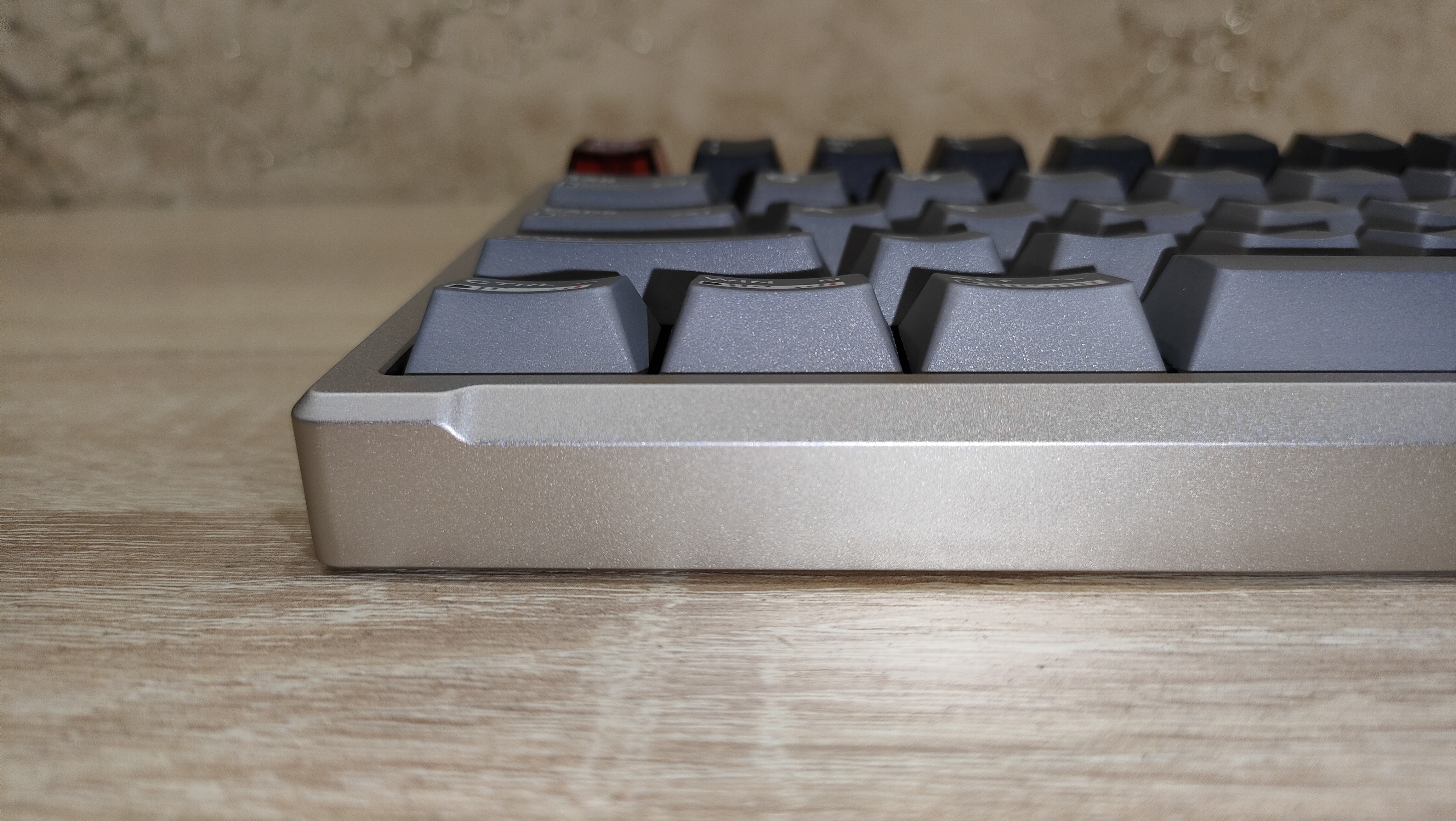 Клавиатура очень компактная, увесистая и в целом симпотная, возможно, из-за красных акцентов, а может из-за корпуса цвета «шампань». Спереди и сзади есть что-то типа фаски, которая есть только в версии Pro, она как раз и обозревается. На тыловой фаске есть вставка рыжего цвета, что-то вроде меди, любопытная деталь, которую пользователь, наверное, никогда не увидит, но будет знать о ее существовании. Красные колпачки, как обычно это и бывает у прозрачных колпачков в последнее время, изготовлены из поликарбоната. Почему-то мне не видятся они тут инородным элементом дизайна, в общем, пойдет, все интереснее, чем всякие клавиатуры в ч/б гамме.