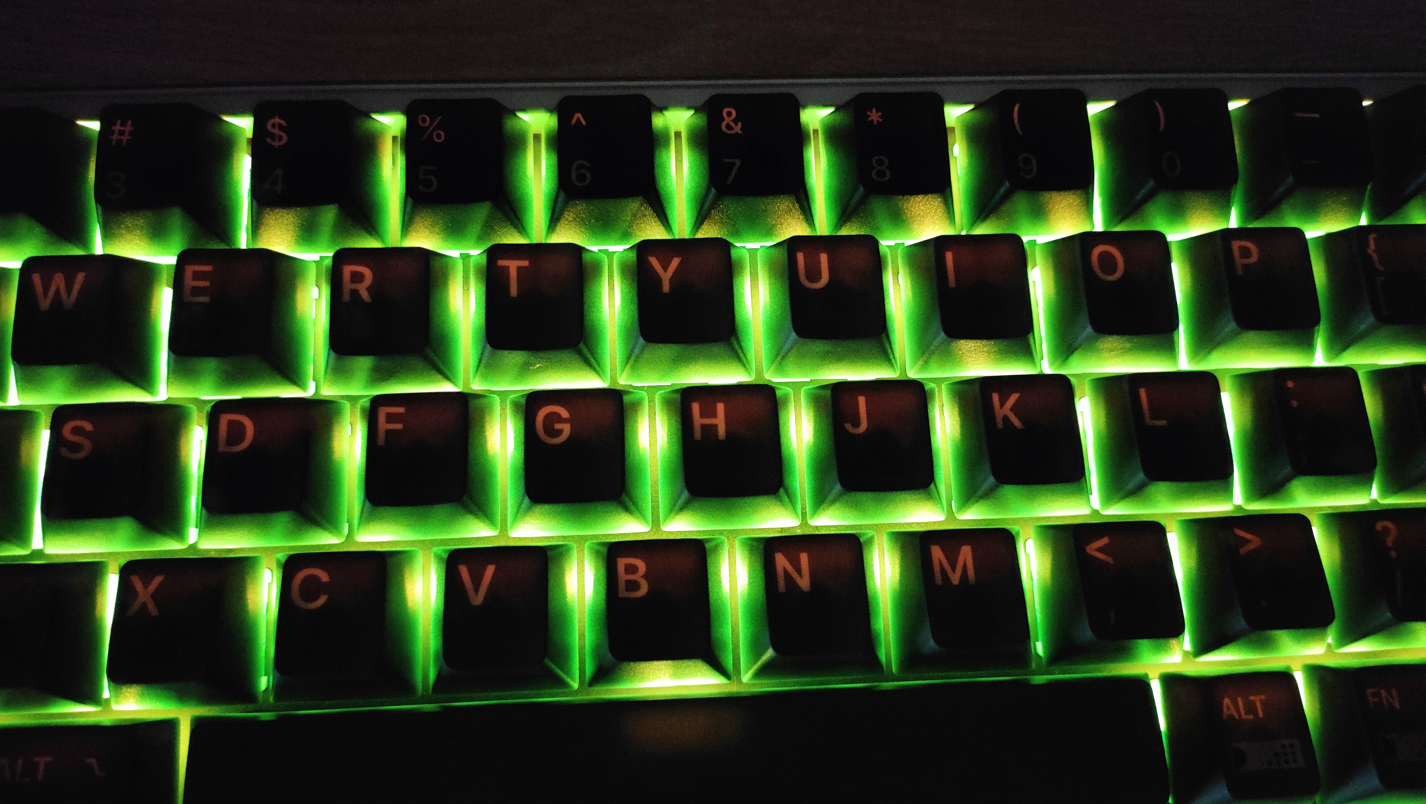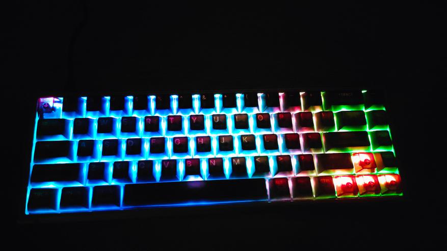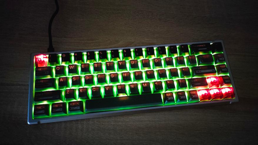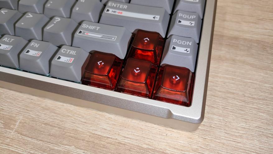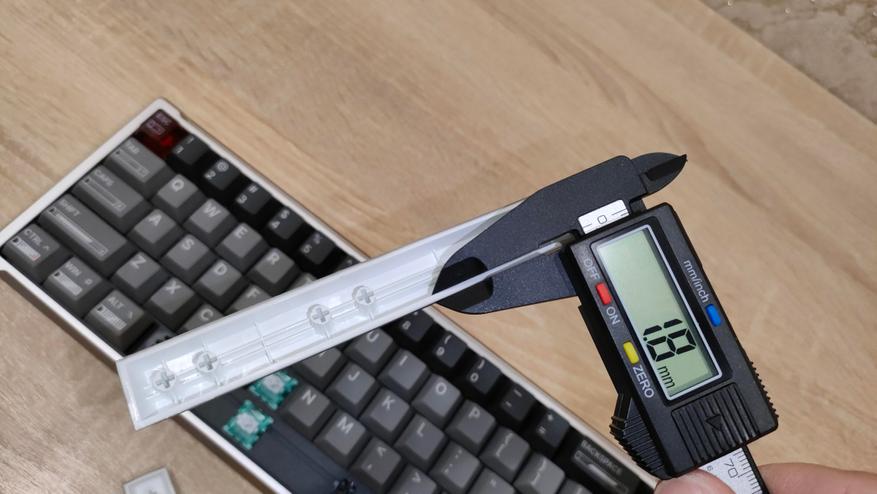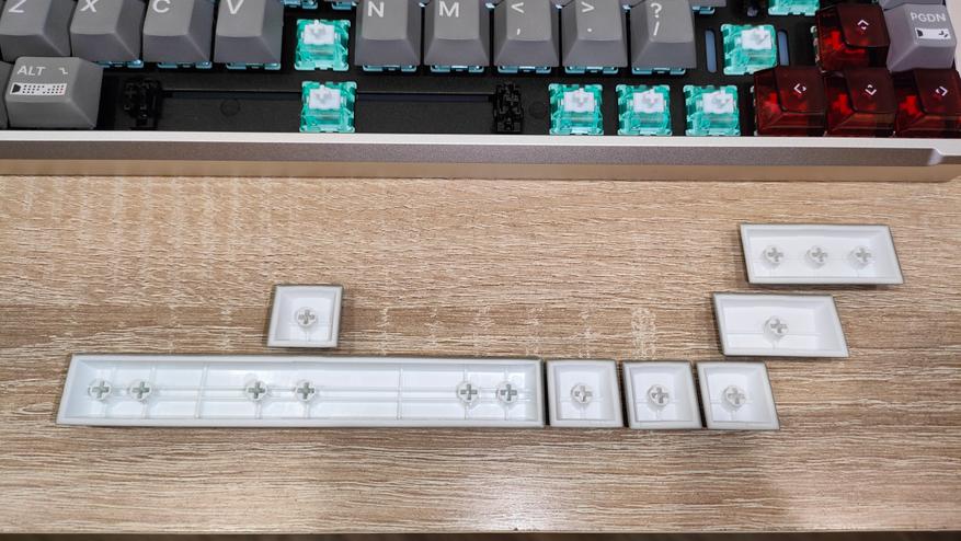Колпачки из PBT пластика, оба слоя, соответственно двойное литье и соответственно не прозрачные, толщина огромная, примерно 1.8 мм, забегая вперед скажу, что с просветом что-то не так. Как-то у меня в памяти отпечатался момент, что этот материал никак не подсвечивается и не просвечивается. Взяв пару колпачков с других клавиатур, оказался прав, колпачок глухой. Причем встречаю я этот колхоз на далеко не дешевых клавиатурах, то ли материал с примесями, то ли я не знаю. Колпачки из поликарбоната красного цвета потоньше, около 1.5 мм, что тоже немало. Стабилизаторы смазаны и установлены в пластину позиционирования, а значит есть потенциальная вероятность услышать паразитный грохот, но обычно в определенном месте при определенном клике/стуке.