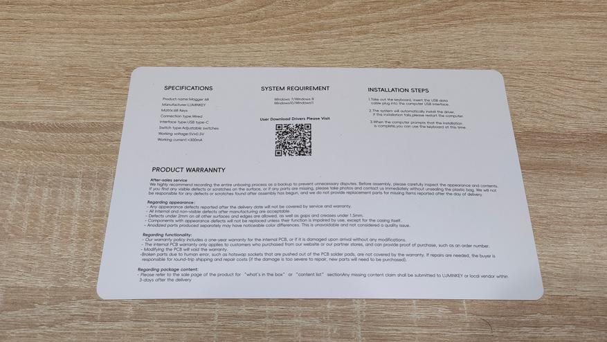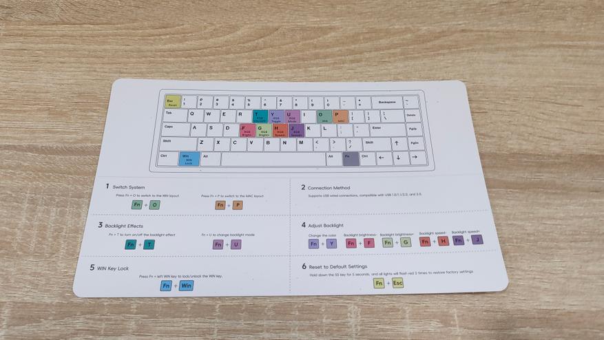 Из полезного на ней, разве что указание модели, а также версия и цвет, на этом все. Внутри набор почти стандартный: клавиатура, инструмент, кабель, запасной переключатель, руководство пользователя. Можно обратить внимание, что крышки-пыльника нет, экономия на спичках, не иначе. Буду надеяться, что все деньги пошли целиком в устройство.