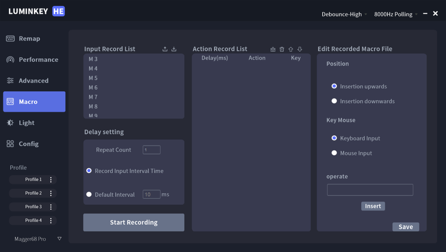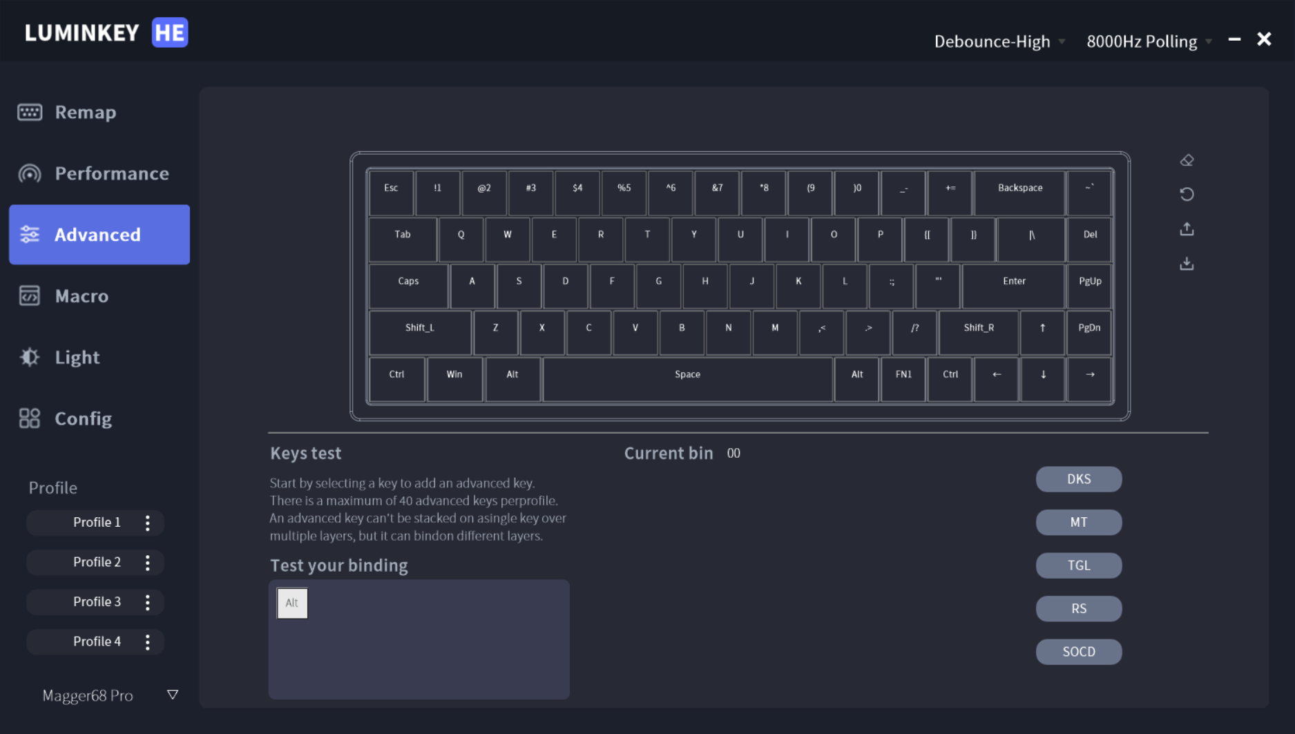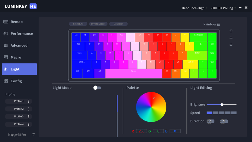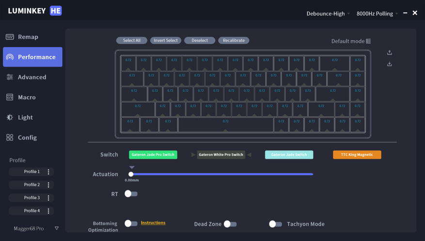 Возможности программного обеспечения типичные для данного рода устройств. Можно настроить: подсветку, переназначить клавиши, макросы, есть разные слои для переназначения, а также та самая настройка переключателей. Если вкратце, можно настраивать два параметра. Во-первых, установить точку срабатывания на свое усмотрение. Да, хочется быстрой реакции для динамичных шутеров — ставим точку активации на 0,9-1,2 мм; хочется печатать, прожимая клавишу полностью — ставим точку срабатывания от 2 мм и дальше. Все это настраивается налету, без перезагрузок и на любой клавише. Для особых ценителей, можно установить разный момент срабатывания на всех. Во-вторых, можно настраивать диапазон повторного нажатия без полного отпускания клавиши.