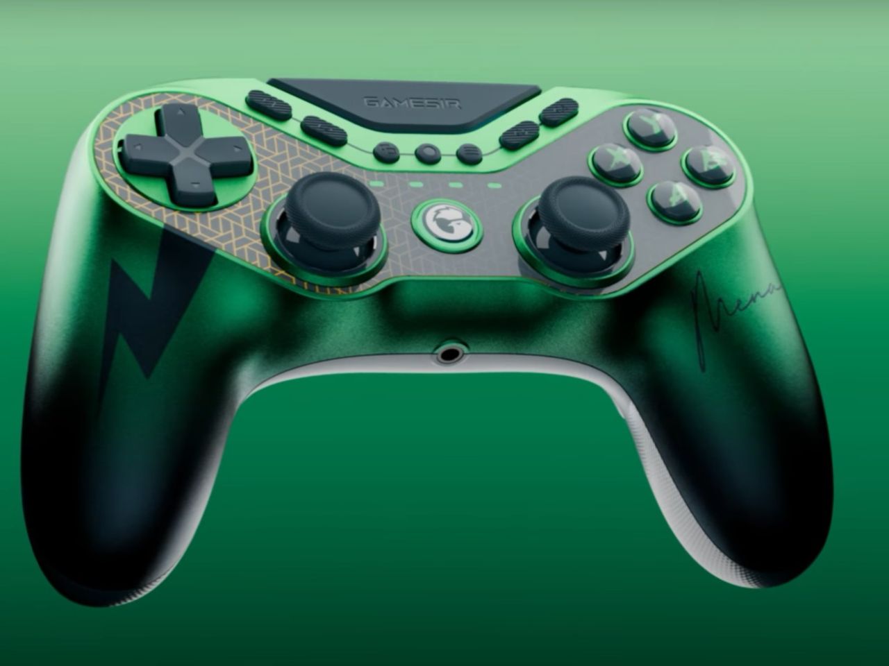 Особенностью устройства стал уникальный темно-зеленый окрас с градиентным переходом в черный цвет на рукоятках. На правой стороне нанесена личная подпись игрока, на левой — логотип в виде молнии. Лицевая панель украшена геометрическим узором, а кнопки Action получили стилизованные китайские иероглифы.