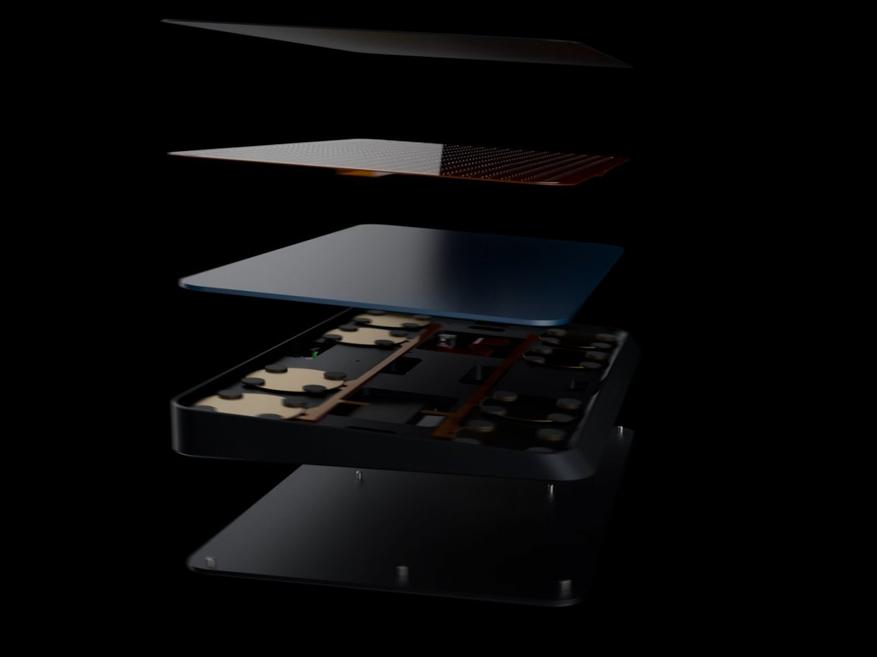 В трекпаде используются пьезоэлектрические тактильные приводы третьего поколения, обеспечивающие одинаковую обратную связь по всей площади сенсора. Технология работает без механических переключателей, что исключает появление «мёртвых зон» по краям устройства. Система измерения силы нажатия распознаёт изменения давления в любой точке поверхности.