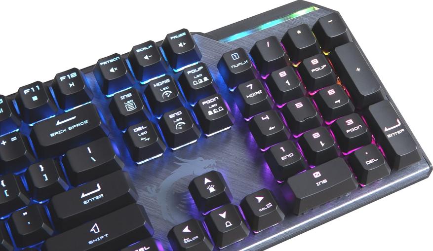Все настройки хранятся в памяти клавиатуры и не сбрасываются при ее подключении. К тому же присутствует возможность быстрой настройки оттенка свечения и выбора предустановленных динамических эффектов с помощью комбинаций клавиш, а если установить фирменное приложение MSI Dragon Center, то можно настраивать подсветку индивидуально для каждой клавиши.