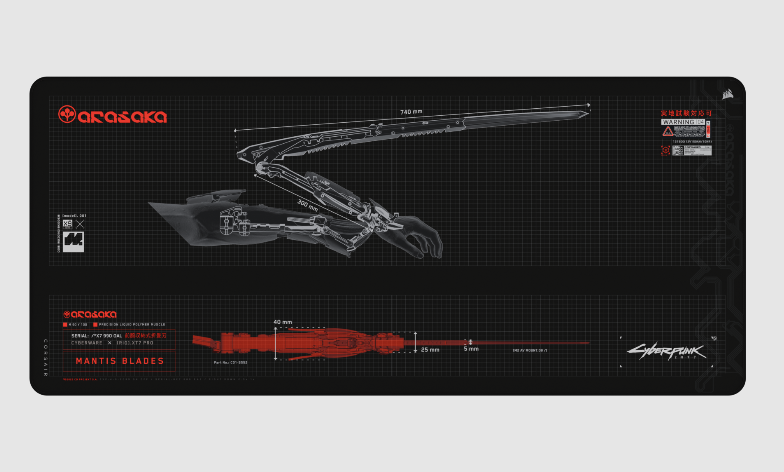 Также в коллекцию вошел коврик MM300 2XL Anti Fray Cloth, рассчитанный на рабочие столы большой площади. Его поверхность дополнена графическими иллюстрациями кибернетического клинка Mantis Blade. Края коврика дополнительно обработаны для защиты от износа.