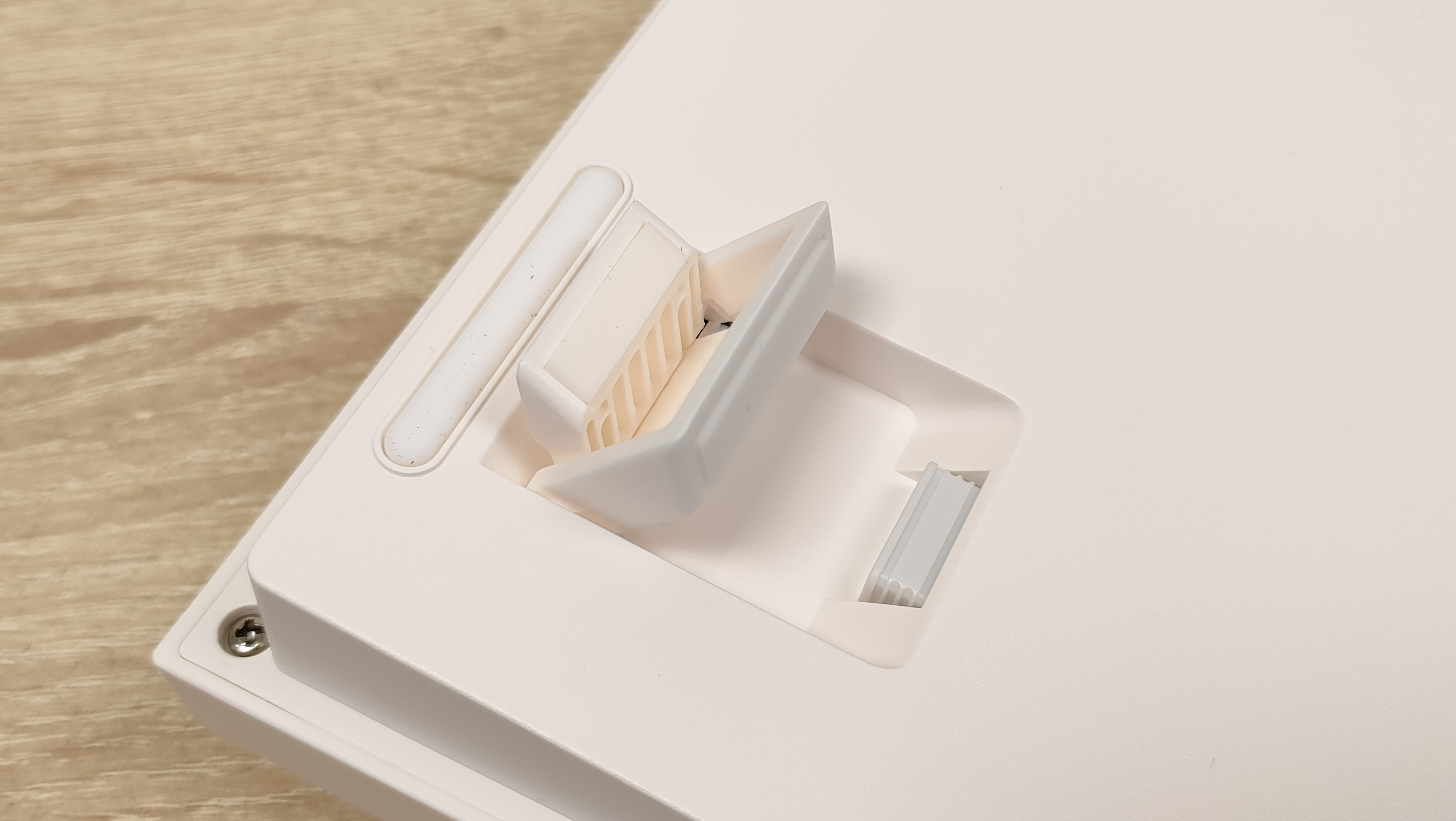 На дне всё стандартно и местами скучно. С другой стороны, это поддон, эта часть находится на столе и её в 99% не видно. Наклейка, силиконовые упоры и выдвижные ножки на месте, здесь же находится и ниша для приёмо-передатчика.