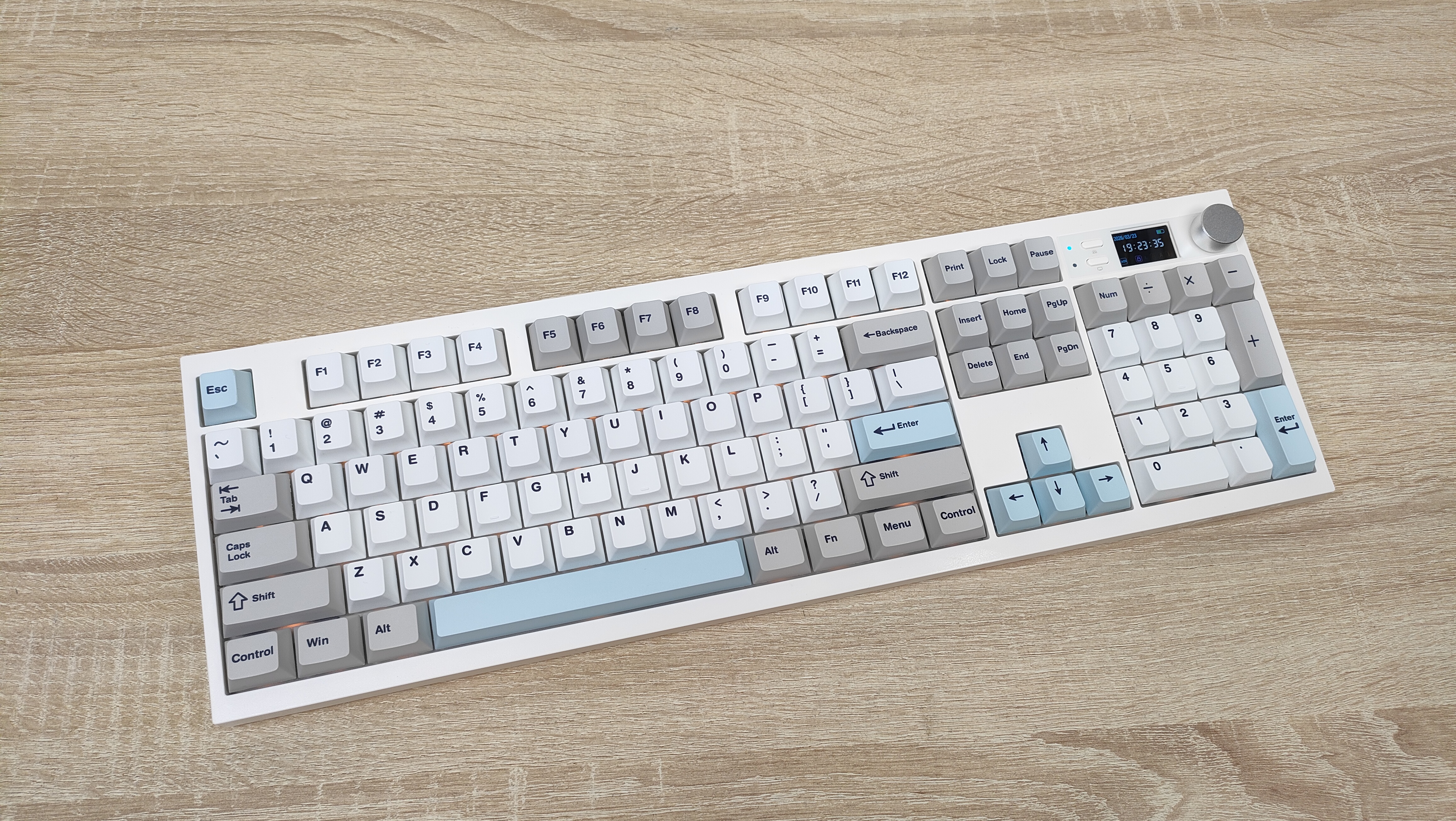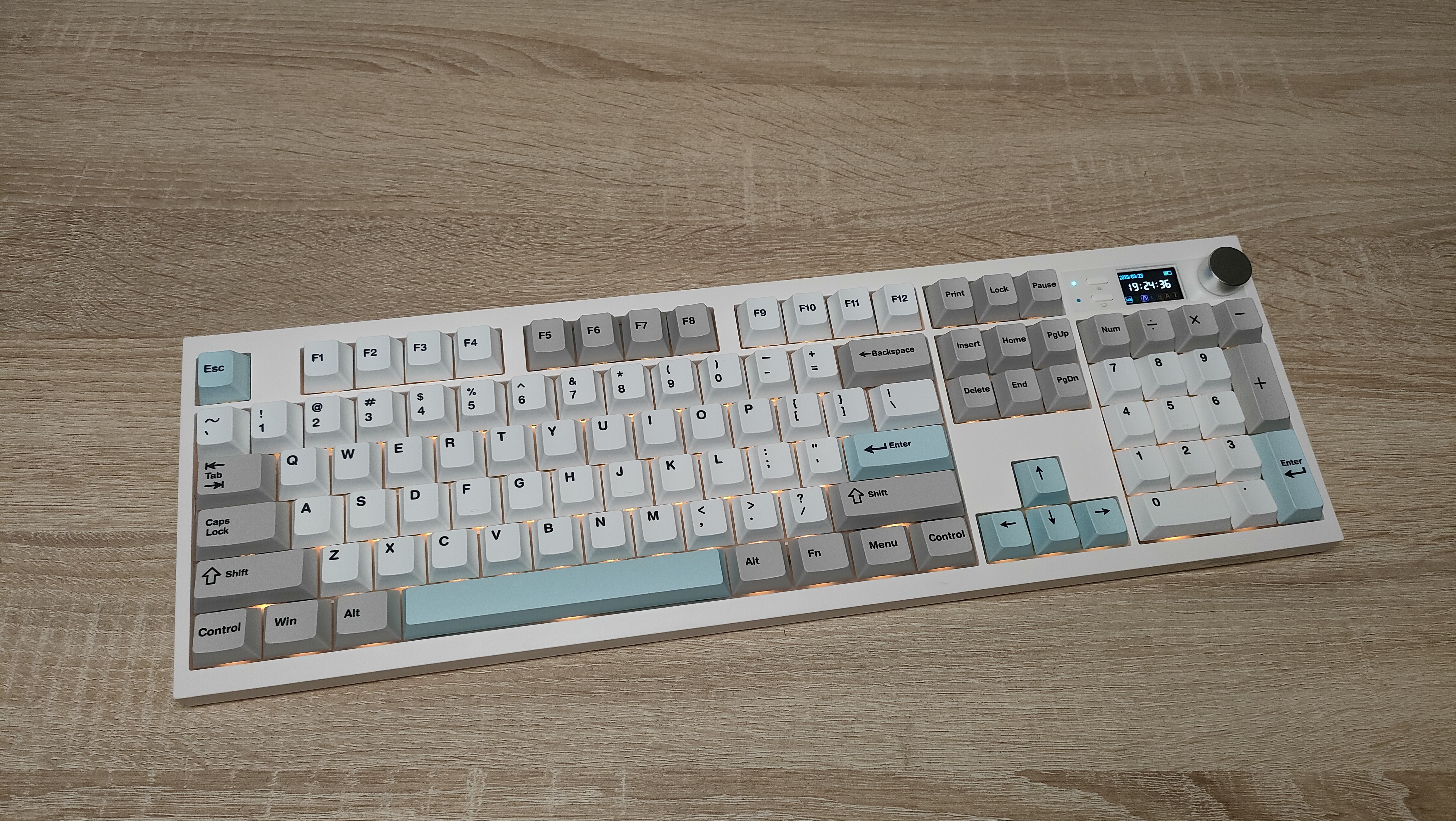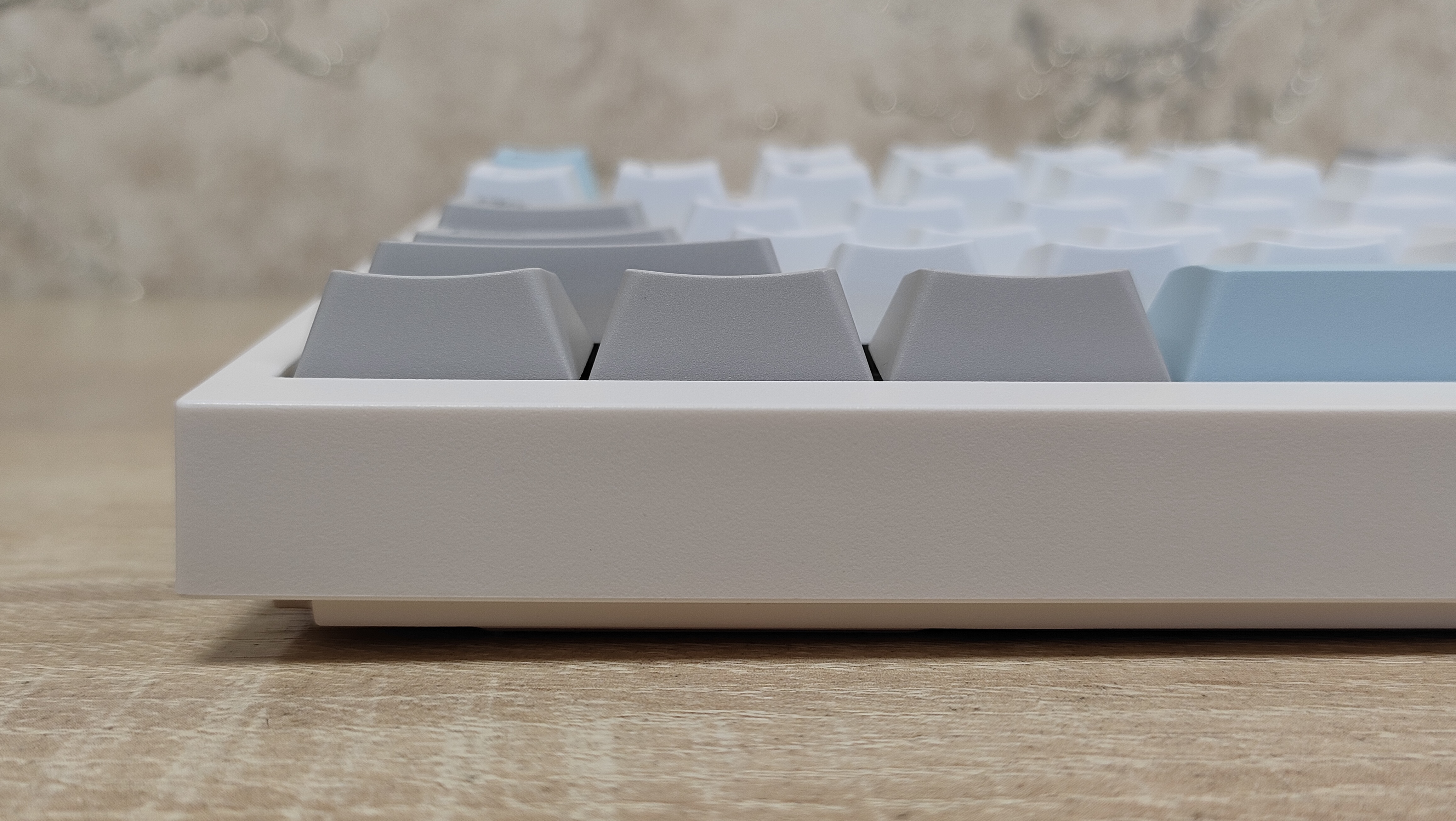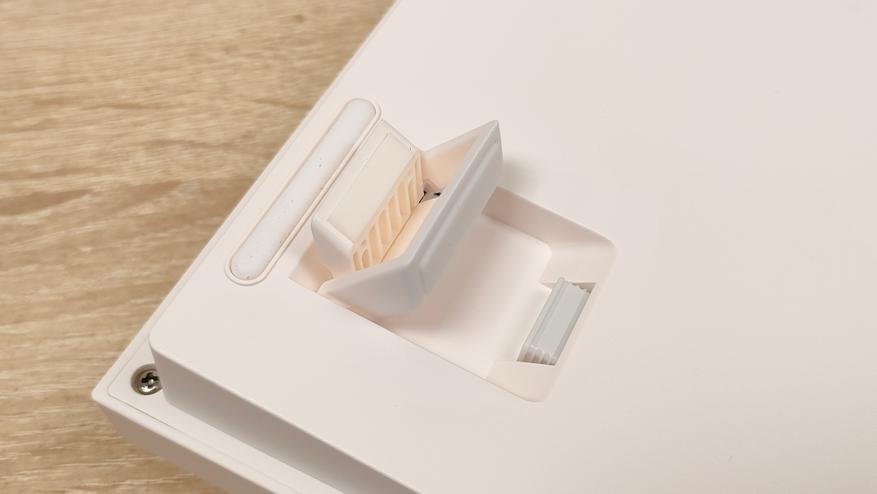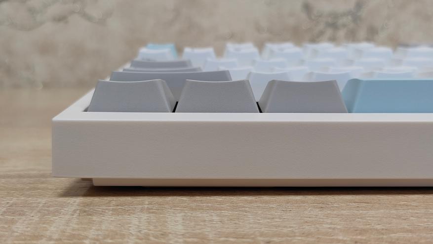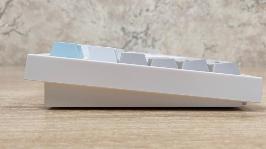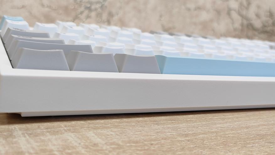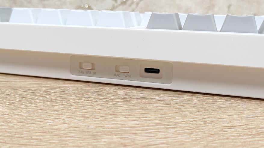 Клавиатура имеет пластиковый корпус, что в общем-то, не так плохо, кто регулярно или по стечению обстоятельств попадает на мои обзоры клавиатур и другой техники, знают, что я не питаю трепета перед металлом, важнее как сделано всё остальное в устройстве. А на первый взгляд сделано всё очень даже неплохо, цвета максимально спокойные, я бы даже сказал нежные. Цвет корпуса не кипельно белый, а как будто, с ооочень легким розовым оттенком, даже не теплый оттенок, а именно розовым. Основные клавиши с более явным голубоватым отливом, что усиливает общую гамму пастельных тонов. Сзади сосредоточены два переключателя режимов и раскладки, а также разъём USB-C для подключения и зарядки.