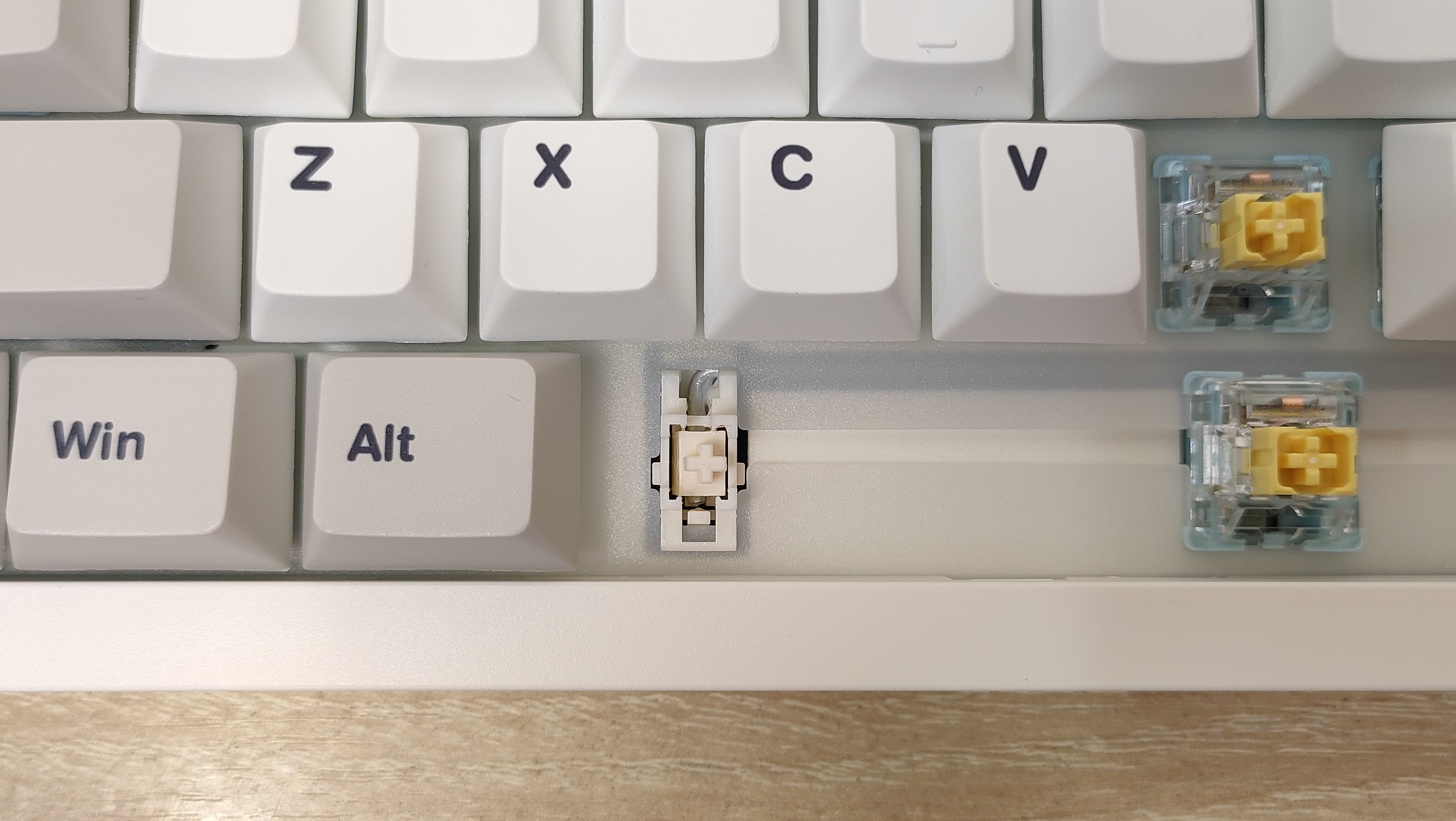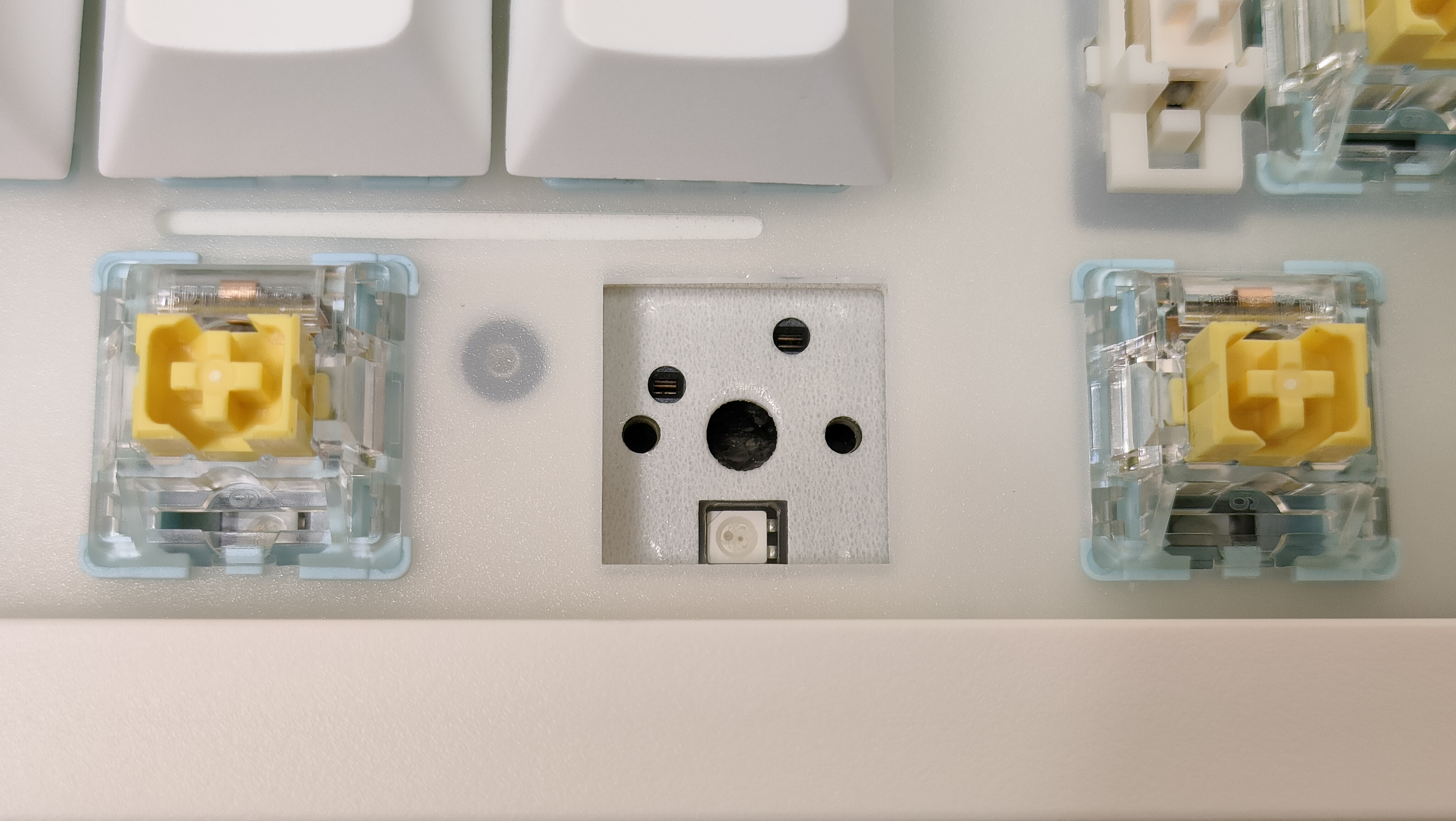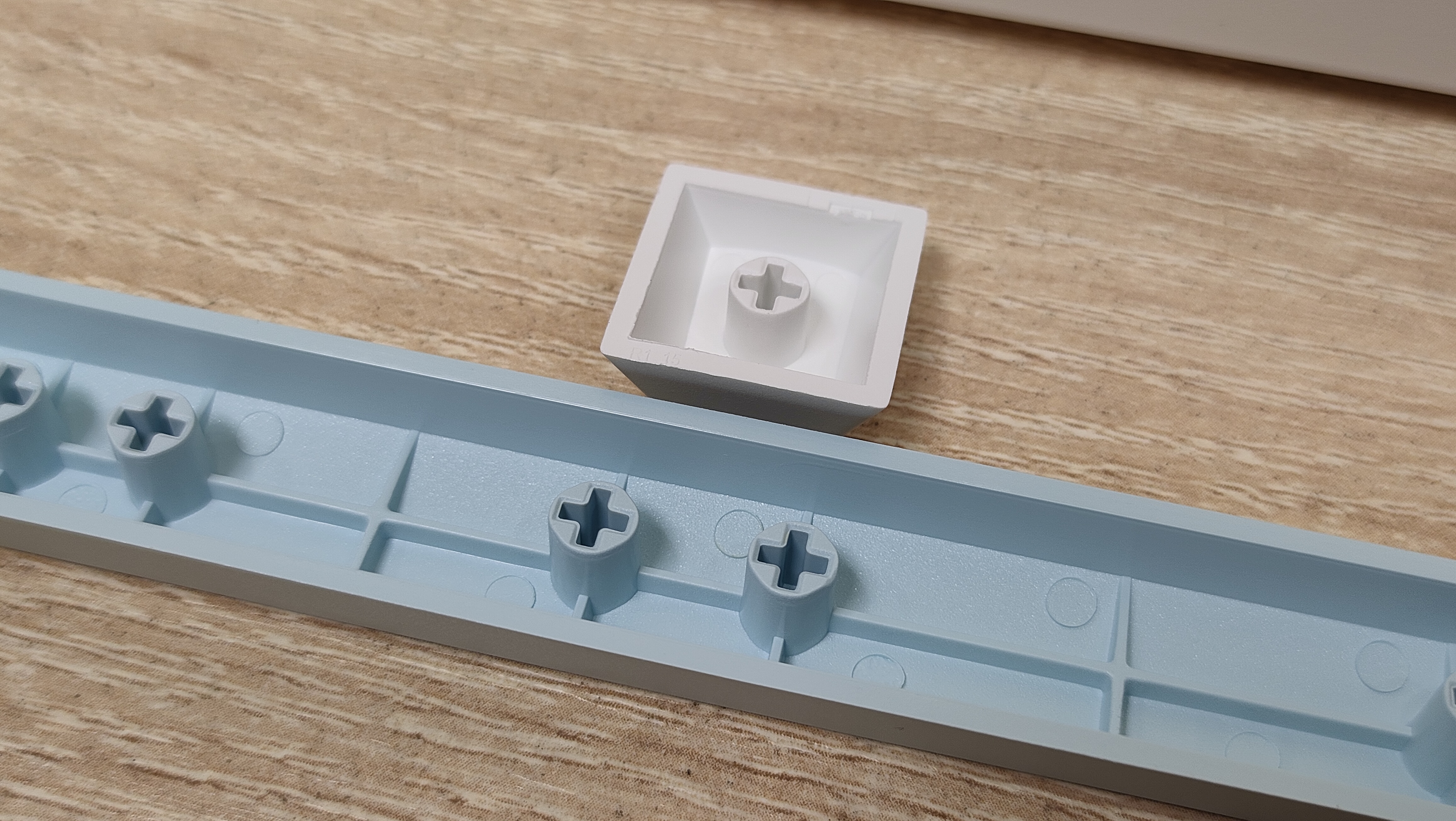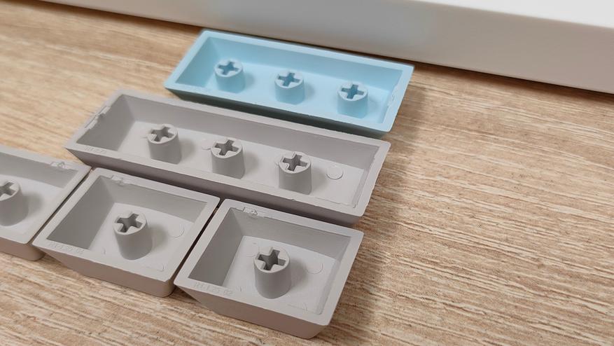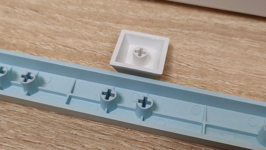 Колпачки изготовлены из PBT пластика, а метод нанесения символов — сублимация, что собственно, делает их такими же по сути вечными, как и двойное литьё из PBT. В соответствии с этим, ожидать, что будут подсвечиваться символы не стоит. В некоторых местах видны совсем минимальные наплывы от литья, а место среза, местами выглядит так, будто колпачки выкусывали из формы не самыми острыми кусачками, либо выламывали, или просто забыли обработать. Стабилизаторы установлены в пластину позиционирования и более-менее обильно смазаны, сгусток видно невооружённым глазом.