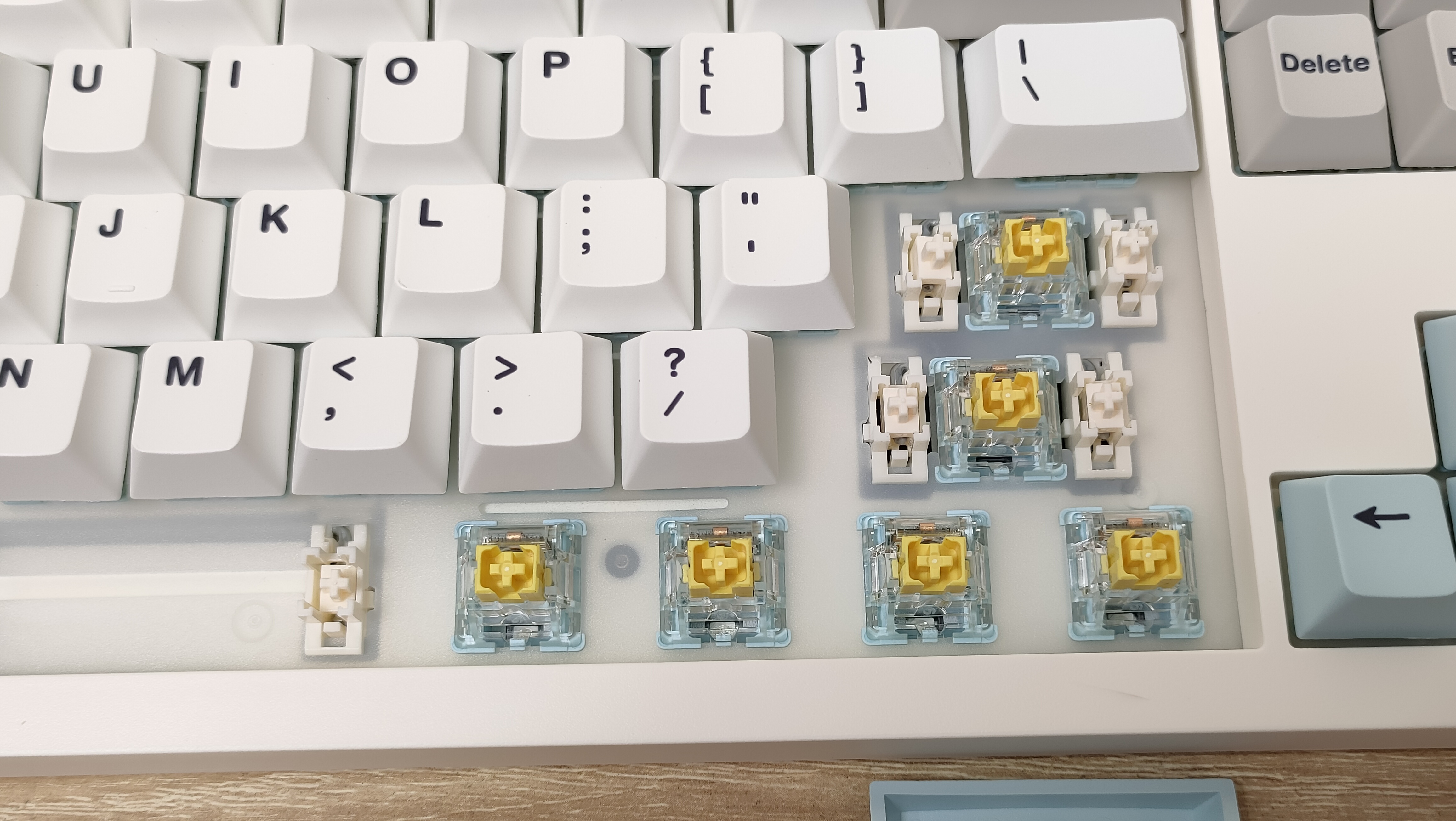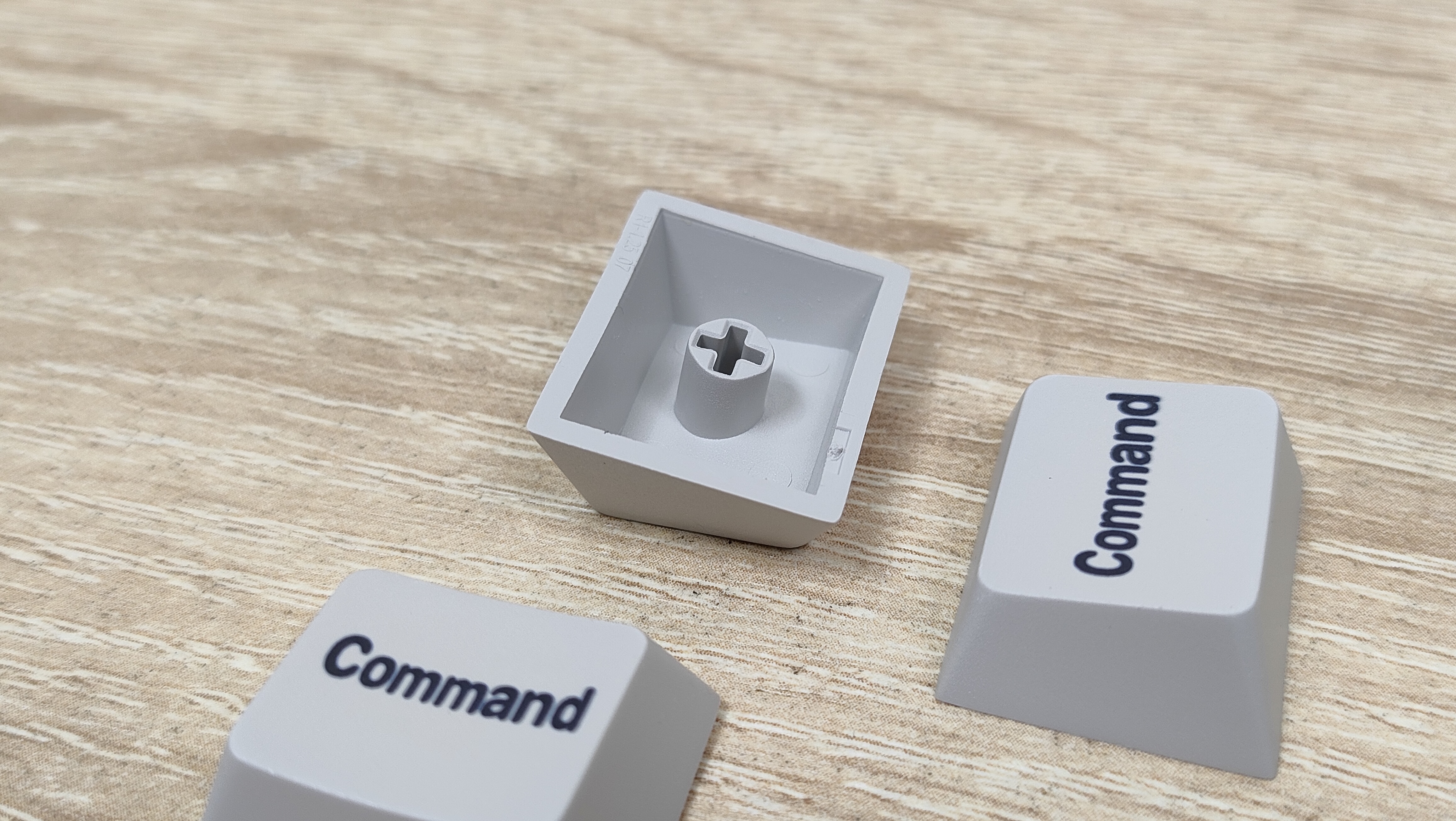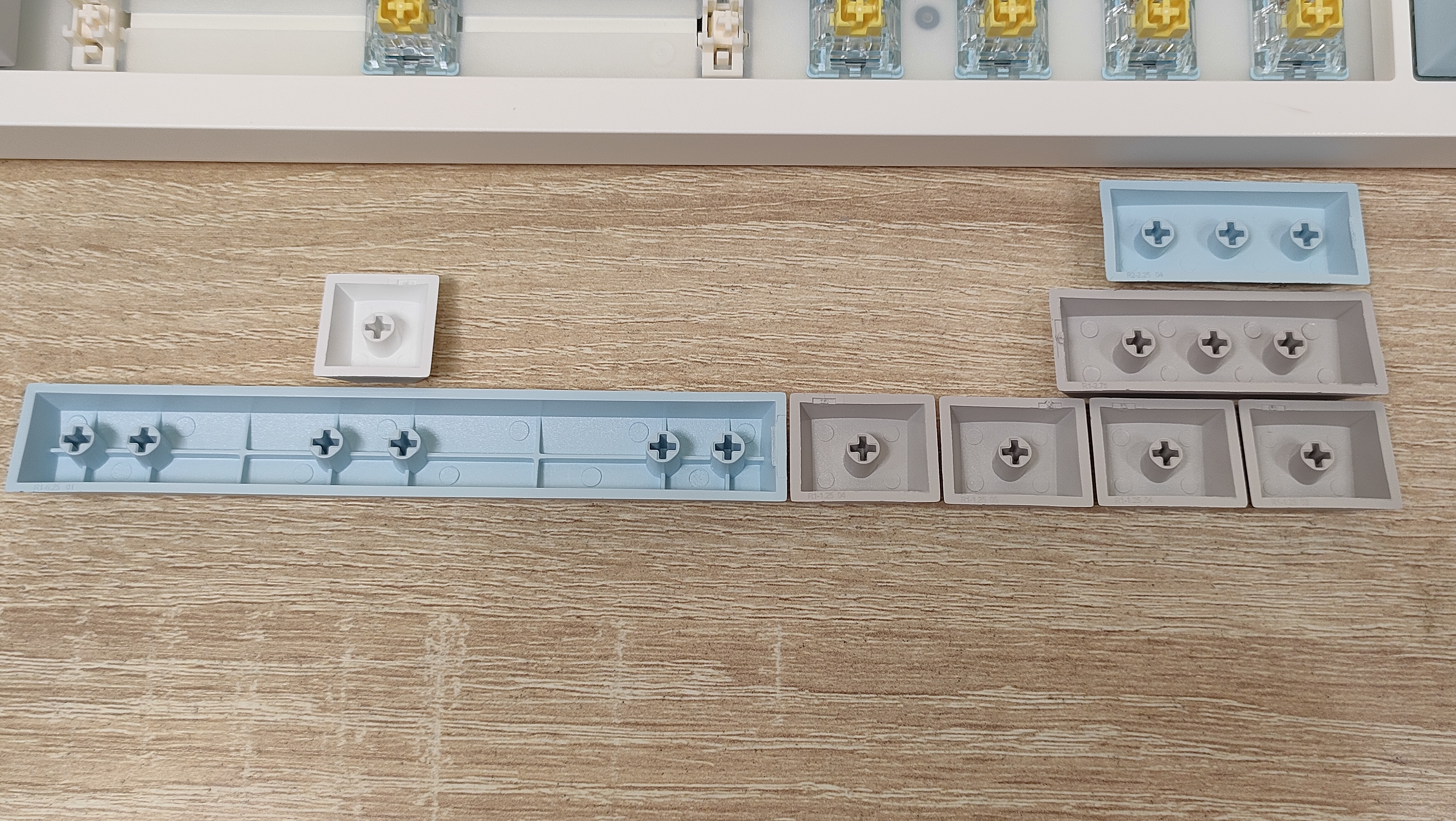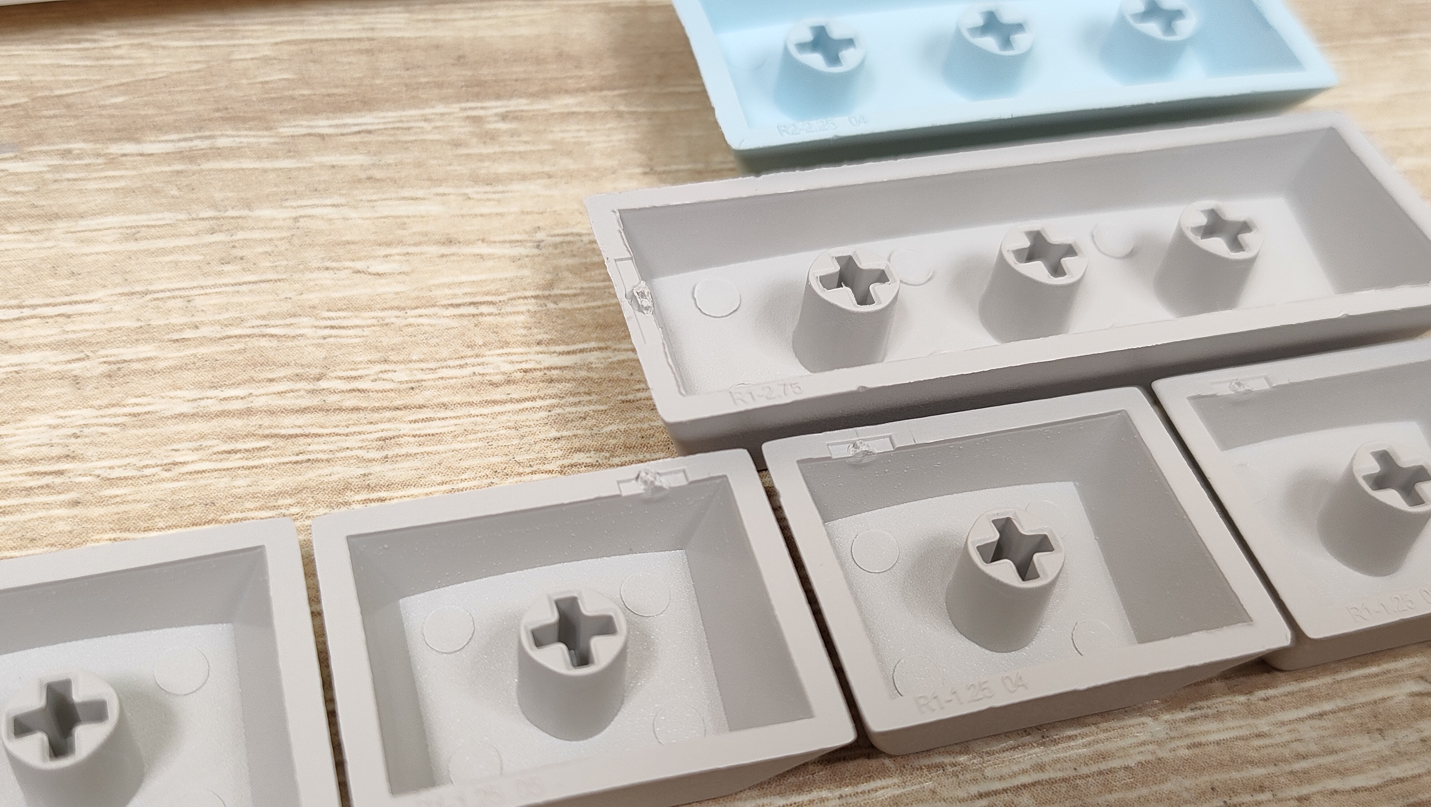 Колпачки изготовлены из PBT пластика, а метод нанесения символов — сублимация, что собственно, делает их такими же по сути вечными, как и двойное литьё из PBT. В соответствии с этим, ожидать, что будут подсвечиваться символы не стоит. В некоторых местах видны совсем минимальные наплывы от литья, а место среза, местами выглядит так, будто колпачки выкусывали из формы не самыми острыми кусачками, либо выламывали, или просто забыли обработать. Стабилизаторы установлены в пластину позиционирования и более-менее обильно смазаны, сгусток видно невооружённым глазом.