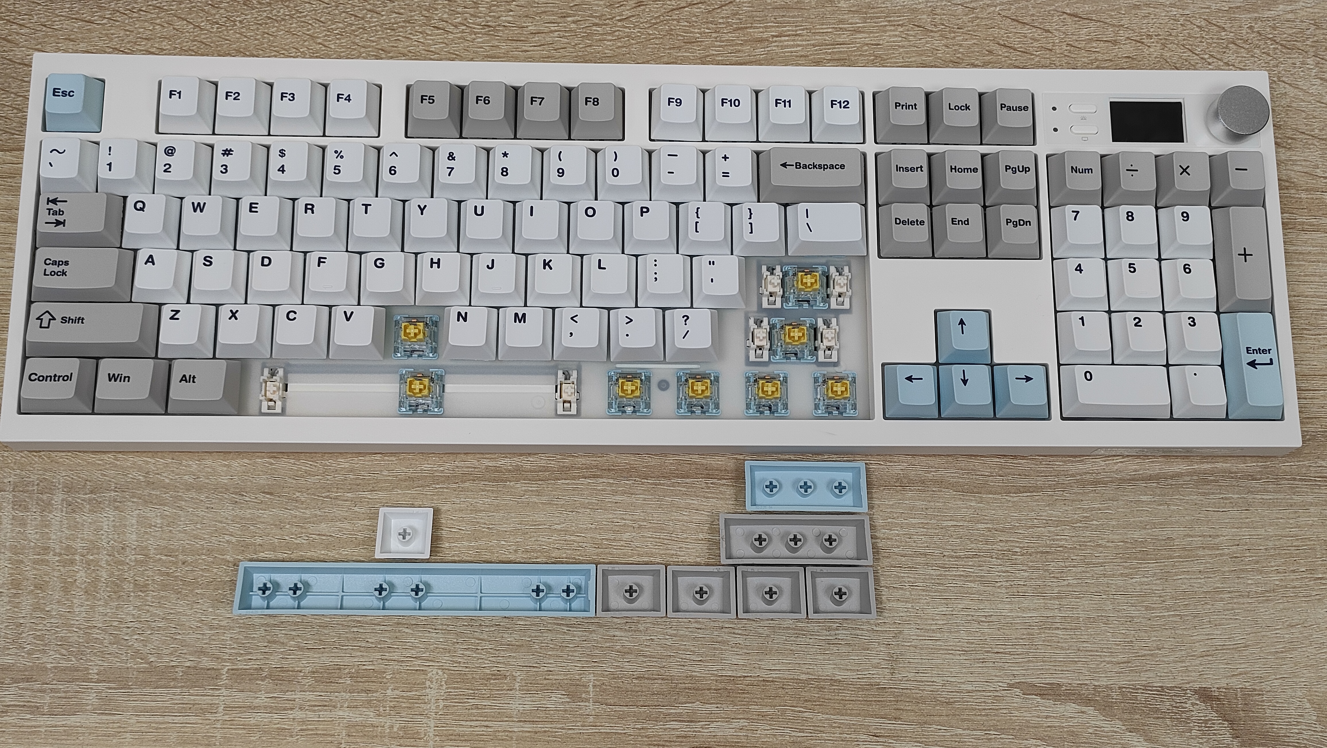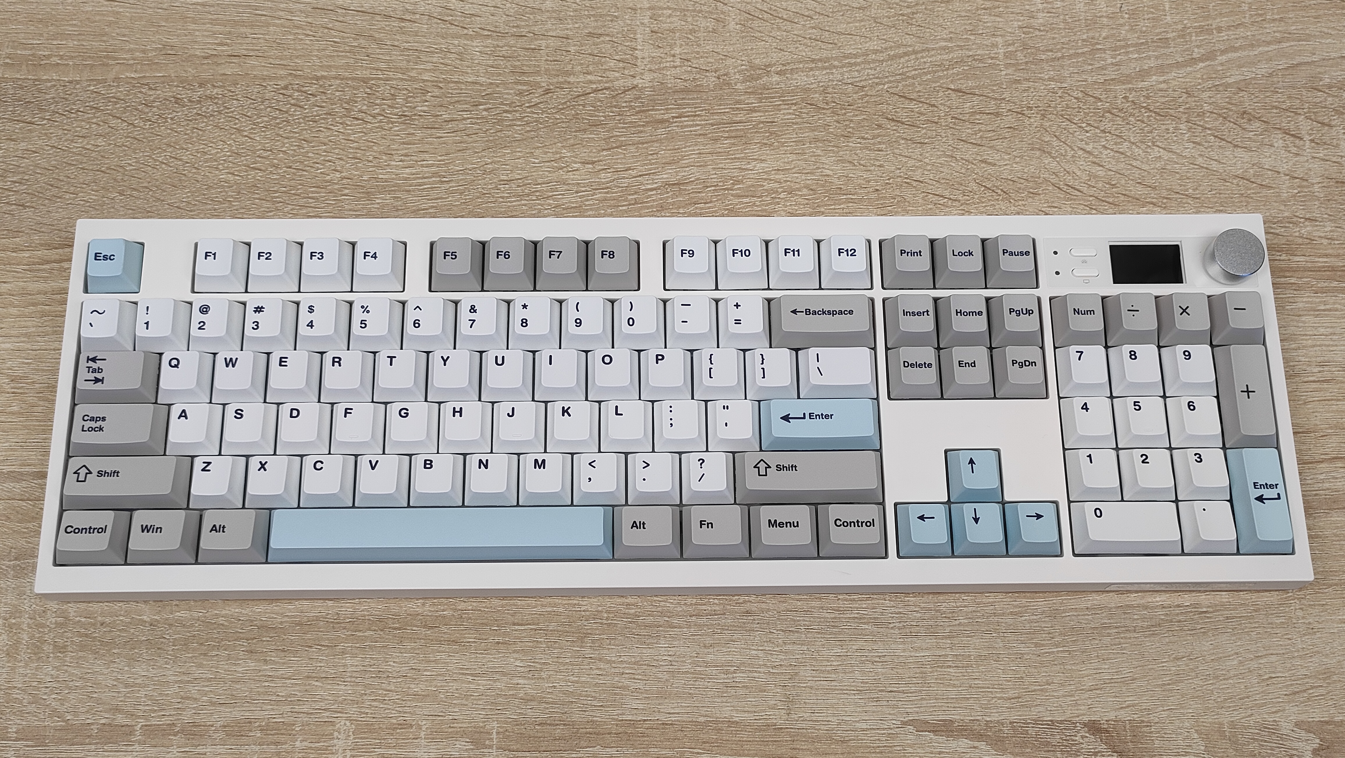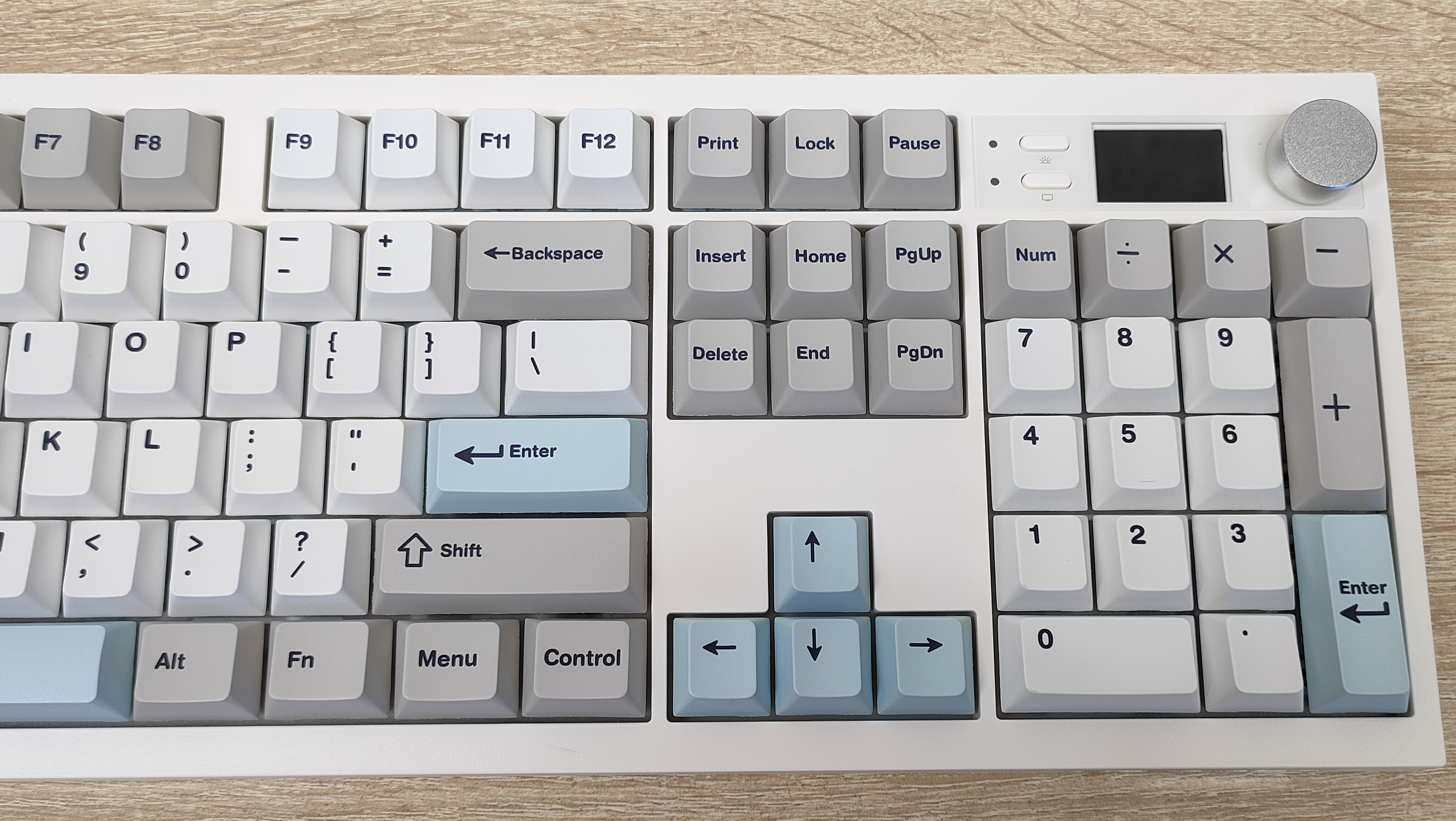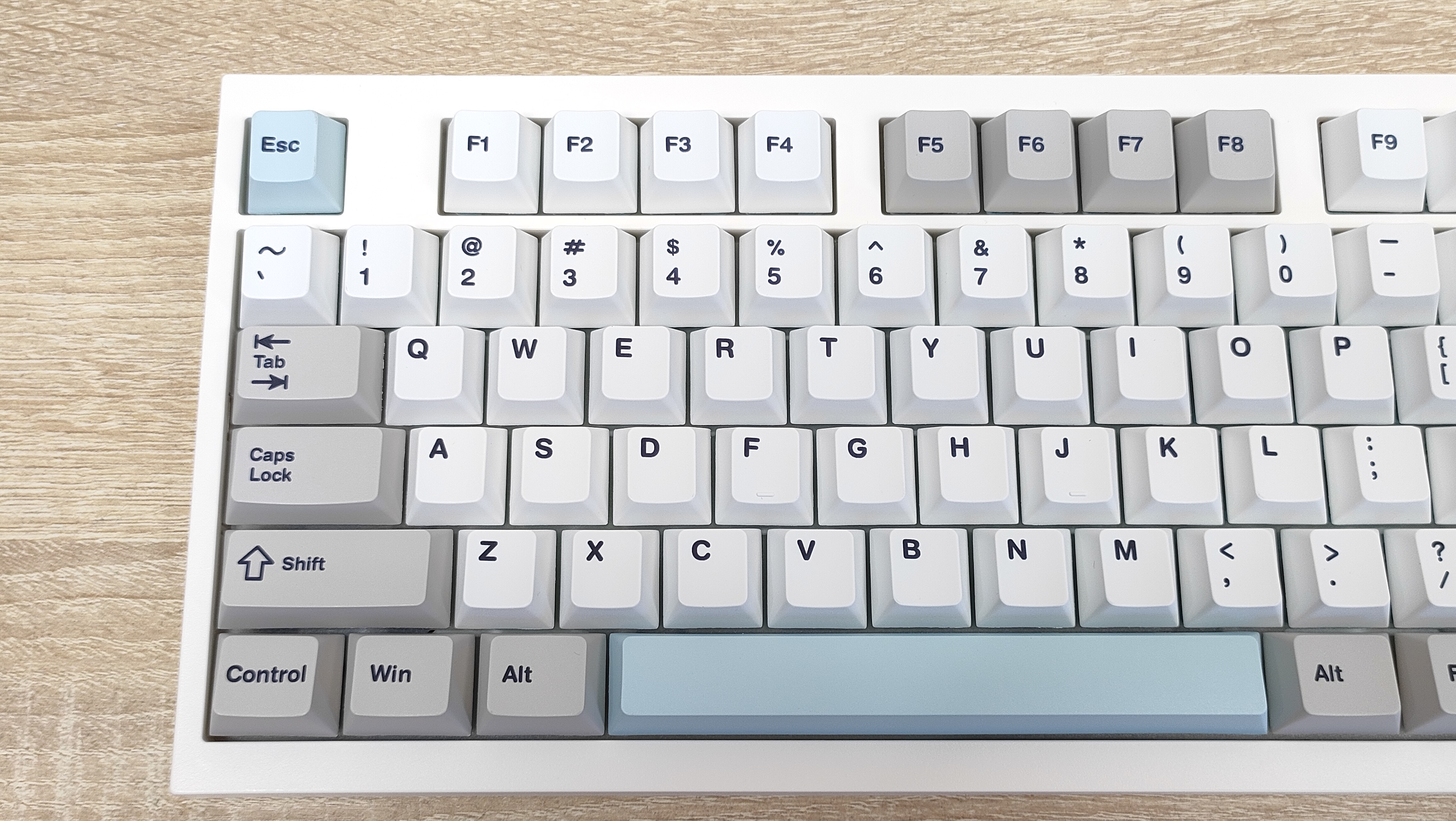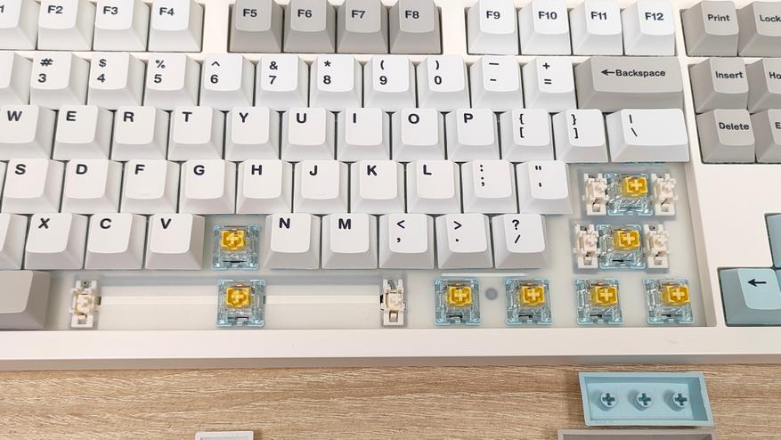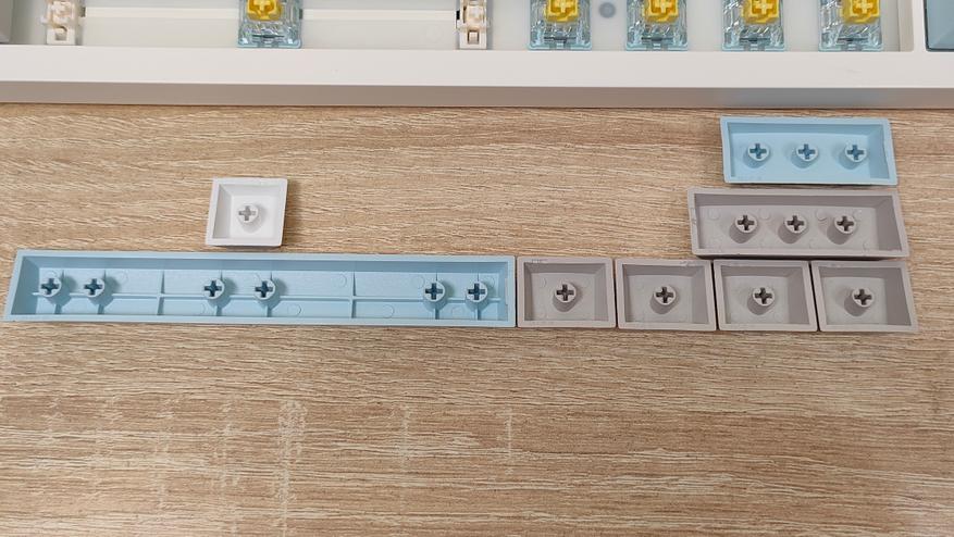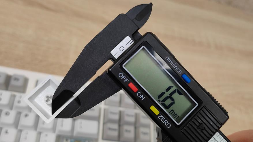 Формат клавиатуры, как было сказано в самом начале — 100% ANSI, широкие шифты, одноэтажный Enter, клавиша F1 находится над двойкой. Всё на своих местах, никаких компромиссов. Профиль колпачков мегараспространённый Cherry, который очень сильно похож на OEM, или наоборот, OEM очень похож на Cherry. Это одинаковые скульптурные профили отличающийся лишь высотой.