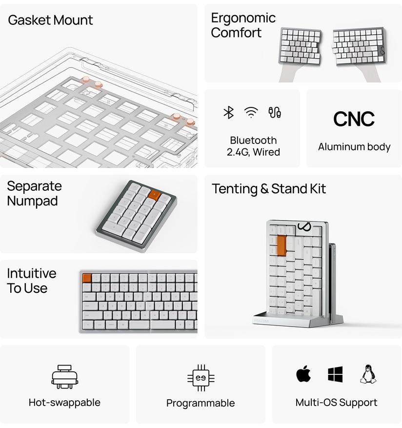 Техническими особенностями клавиатуры являются конструкция с прокладкой для поглощения вибрации, специально разработанные переключатели с усилием срабатывания 40 грамм и ходом 1,2 мм, а также знакомая раскладка на 75% с выделенными функциональными клавишами. Доступны версии с раскладками ANSI и ISO.