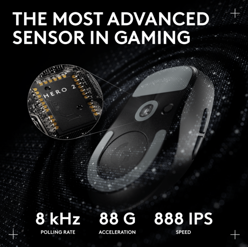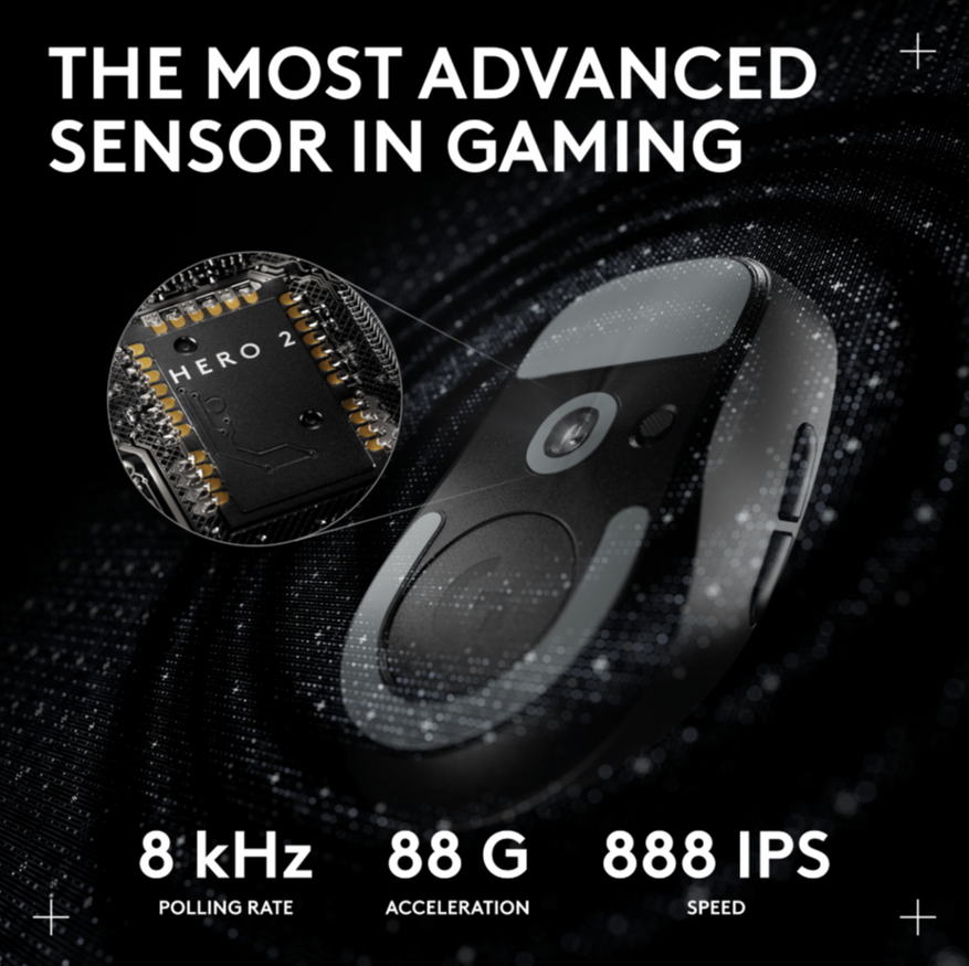Мышь оснащена фирменным сенсором Hero 2, обеспечивающим разрешение до 44 000 DPI. Датчик поддерживает экстремальные значения ускорения и максимальную скорость отслеживания 888 дюймов в секунду. Частота опроса составляет 8000 Герц, что гарантирует минимальную задержку при игре.