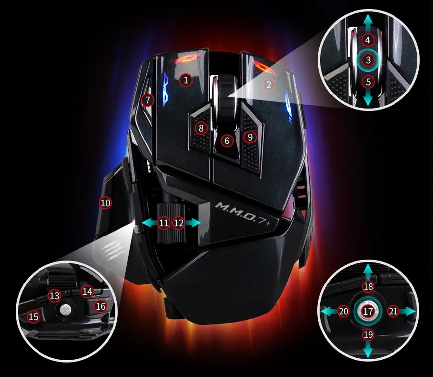 В основе конструкции манипулятора лежит оптический датчик PixArt PAW3395, известный своей точностью и эффективностью отслеживания. Отличительной особенностью Mad Catz MMO 7+ является унаследованный адаптивный дизайн. Устройство оснащено настраиваемой подставкой для ладони, которая позволяет регулировать высоту в четырех фиксированных положениях, а также менять положение. Упор для большого пальца также предлагает широкие возможности персонализации, позволяя настраивать его перемещение вперед, назад, влево и вправо. Такая модульность направлена на обеспечение оптимальной эргономики и комфорта для широкого круга пользователей, независимо от размера руки или предпочтений в хвате.