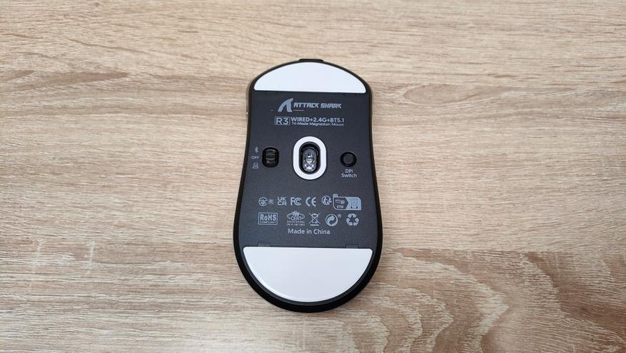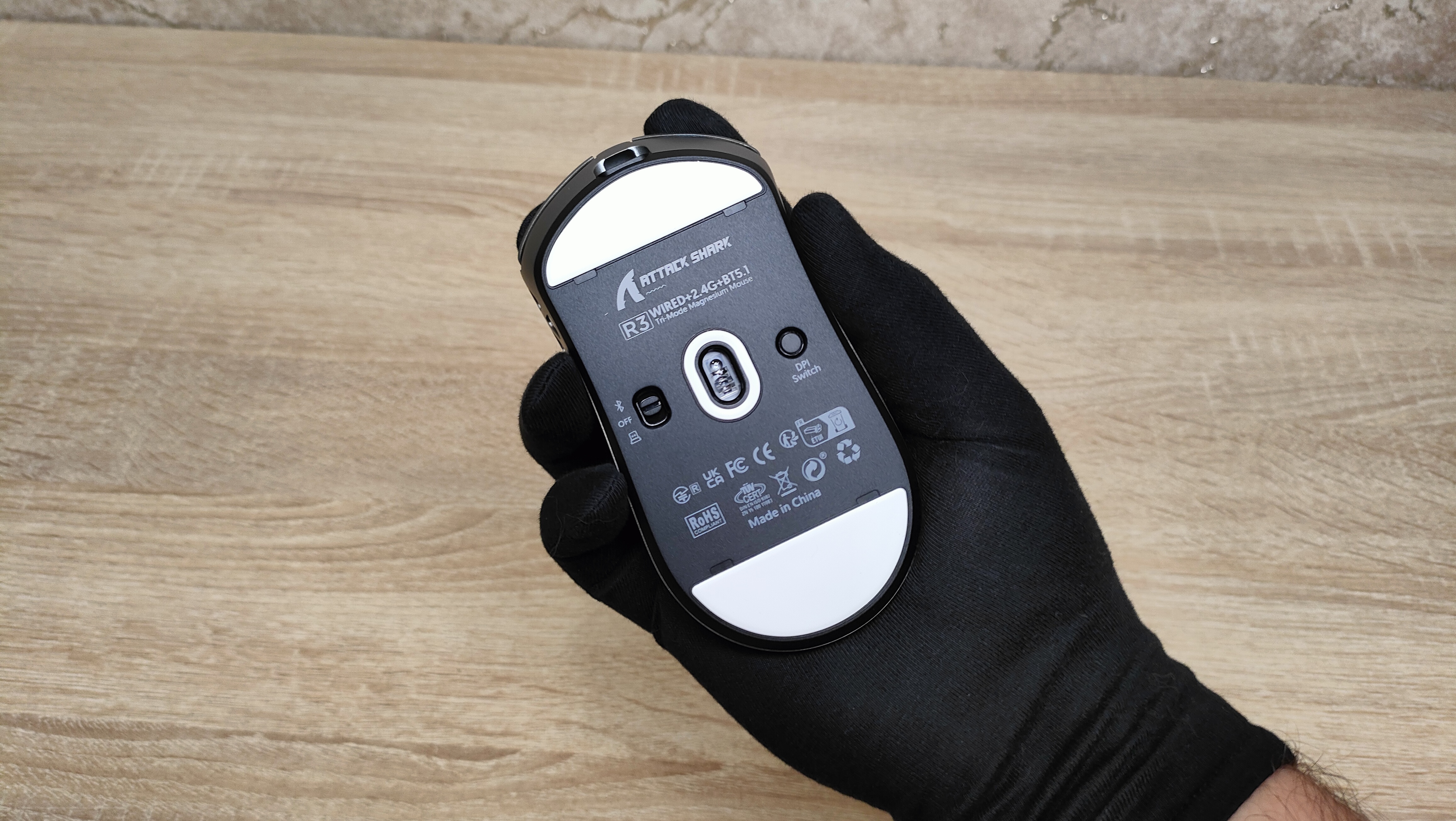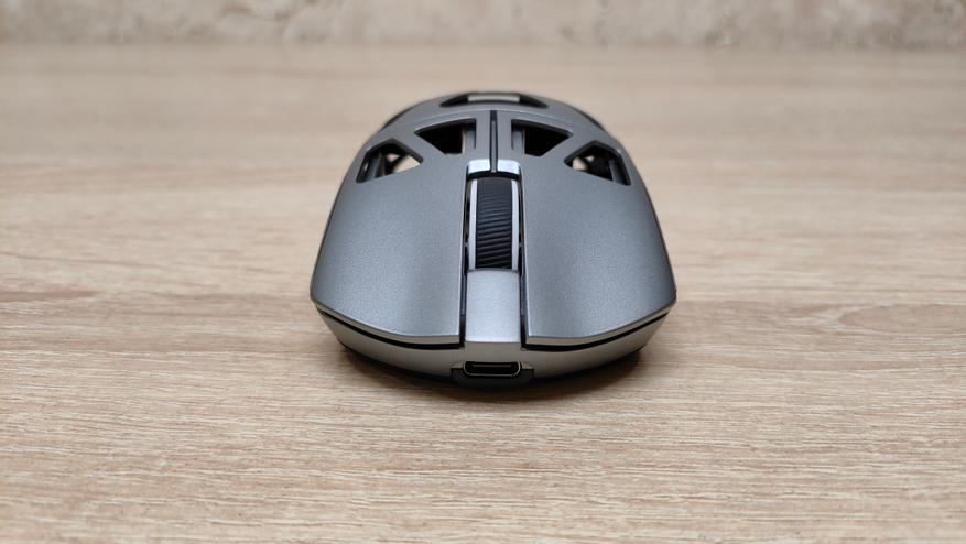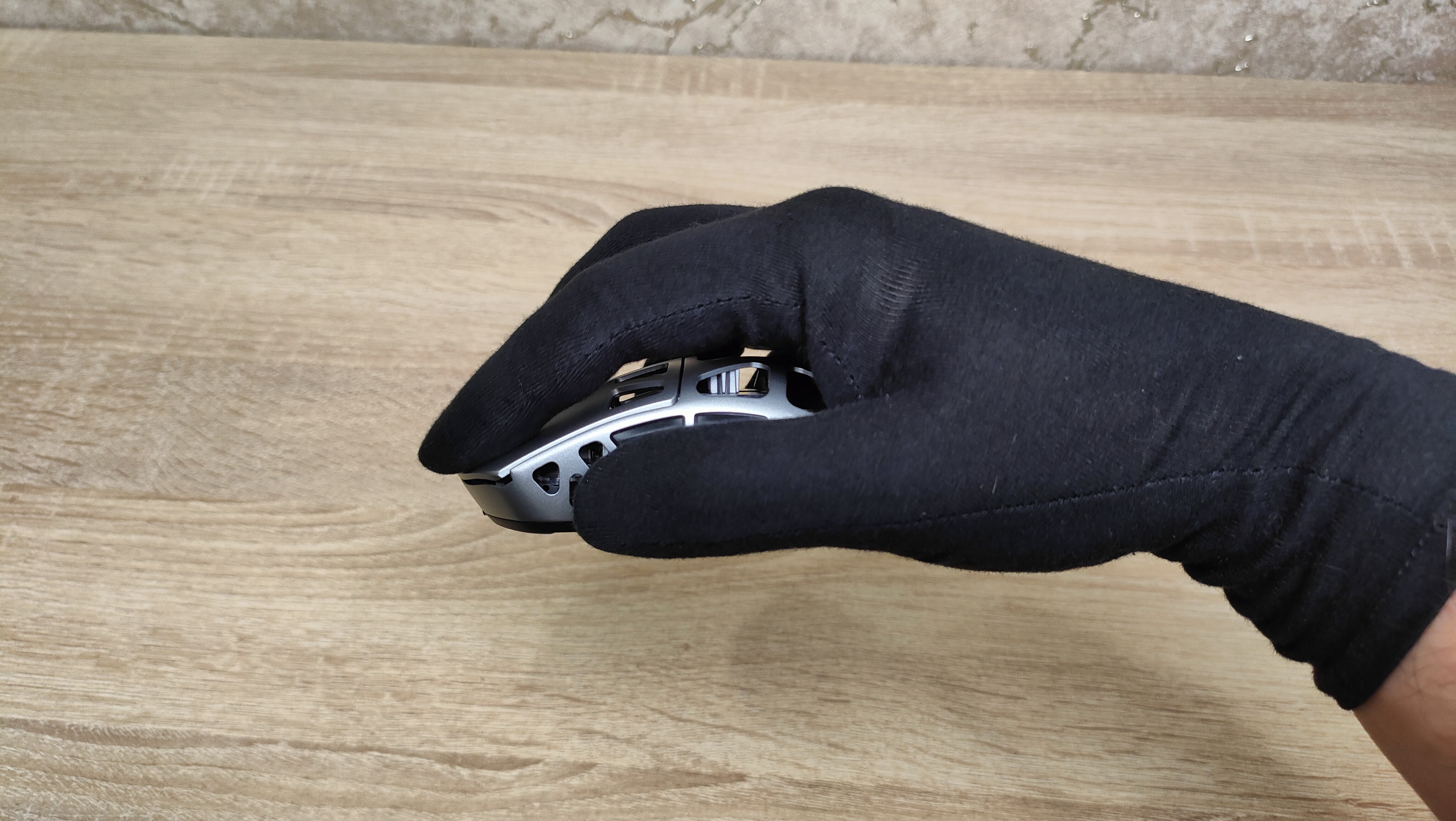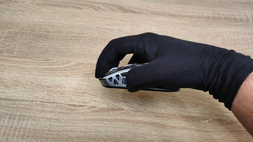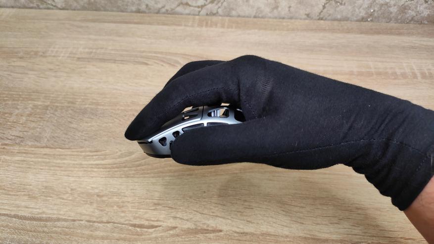Перфорации много и у неё очень интересный профиль. Это не попсовые соты, которые можно встретить у 85% мышек, а треугольники и трапеции. В итоге крупные фигуры смотрятся как-то, на мой взгляд, интереснее, хотя наверняка это из-за того, что просто свежо. Количество кнопок пять: две основные, скролл, две боковые. Кнопку переключения профилей DPI, перенесли на дно, чтобы в пылу страсти игровых каток случайно не нажать. На противоположной стороне от этой кнопки, расположен переключатель режимов работы: провод, радиоканал, Bluetooth. Форму мыши по памяти не вспомнил, но по ощущениям кажется, что здесь не какая-то уникальная разработка, а вполне попсовая и очень распространённая.