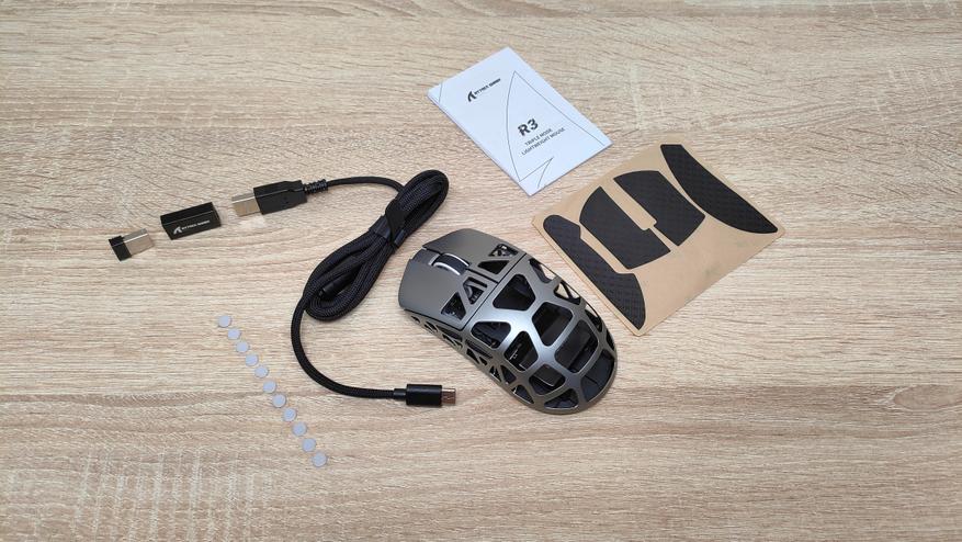 Кабель, приёмопередатчик, адаптер — всё это уже видели и у других мышек данного производителя, и у других брендов в целом. Здесь ничего нового, набор нужный, важный и желательно, чтобы он был у большинства устройств такого типа. Грипсы также не являются чем-то таким особенным, но в качестве допа — это отличный аксессуар, тем более есть риск что мокрое от пота ладонь будет скользить по металлу.