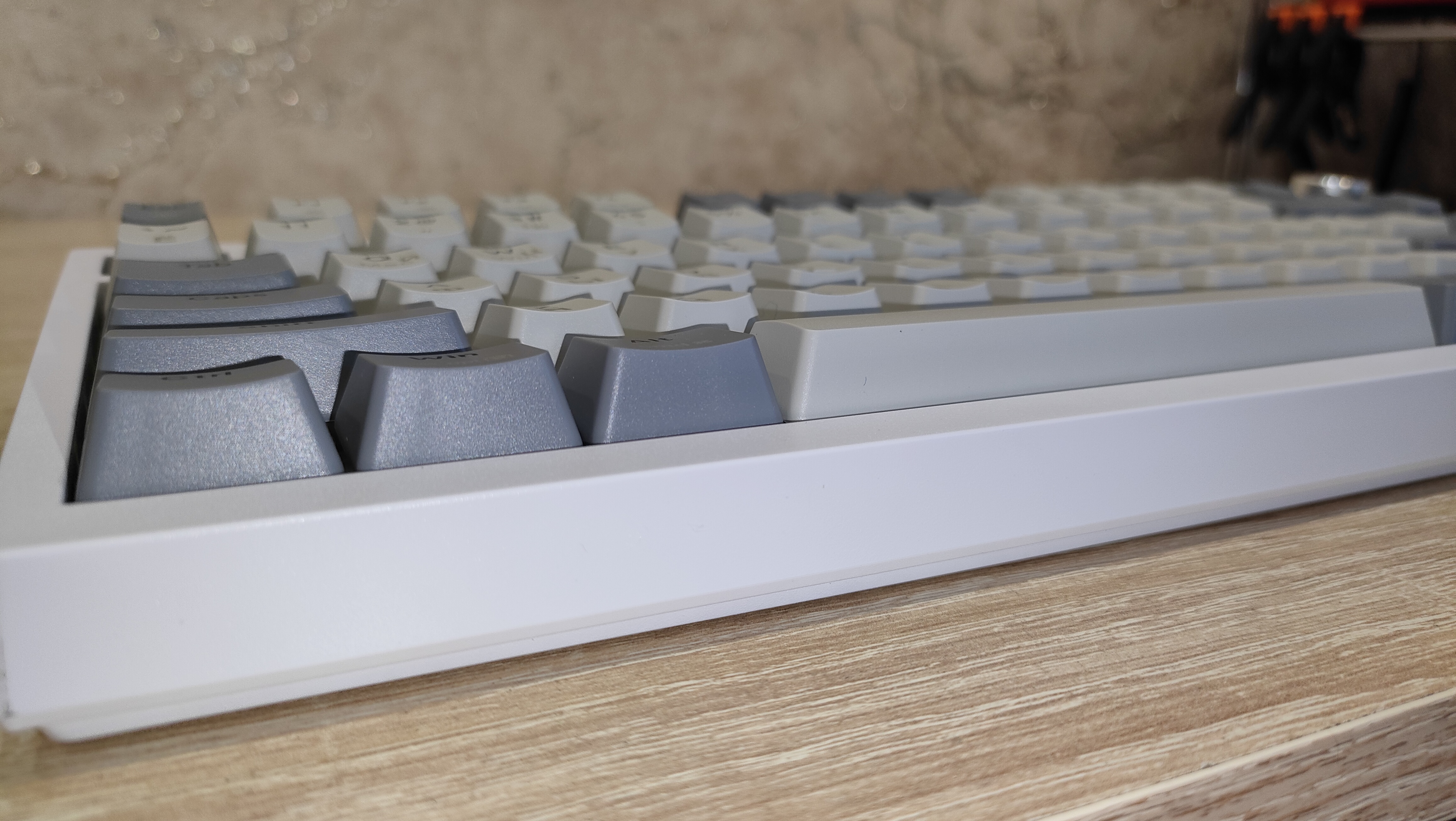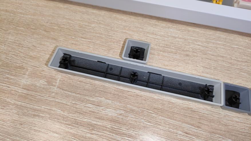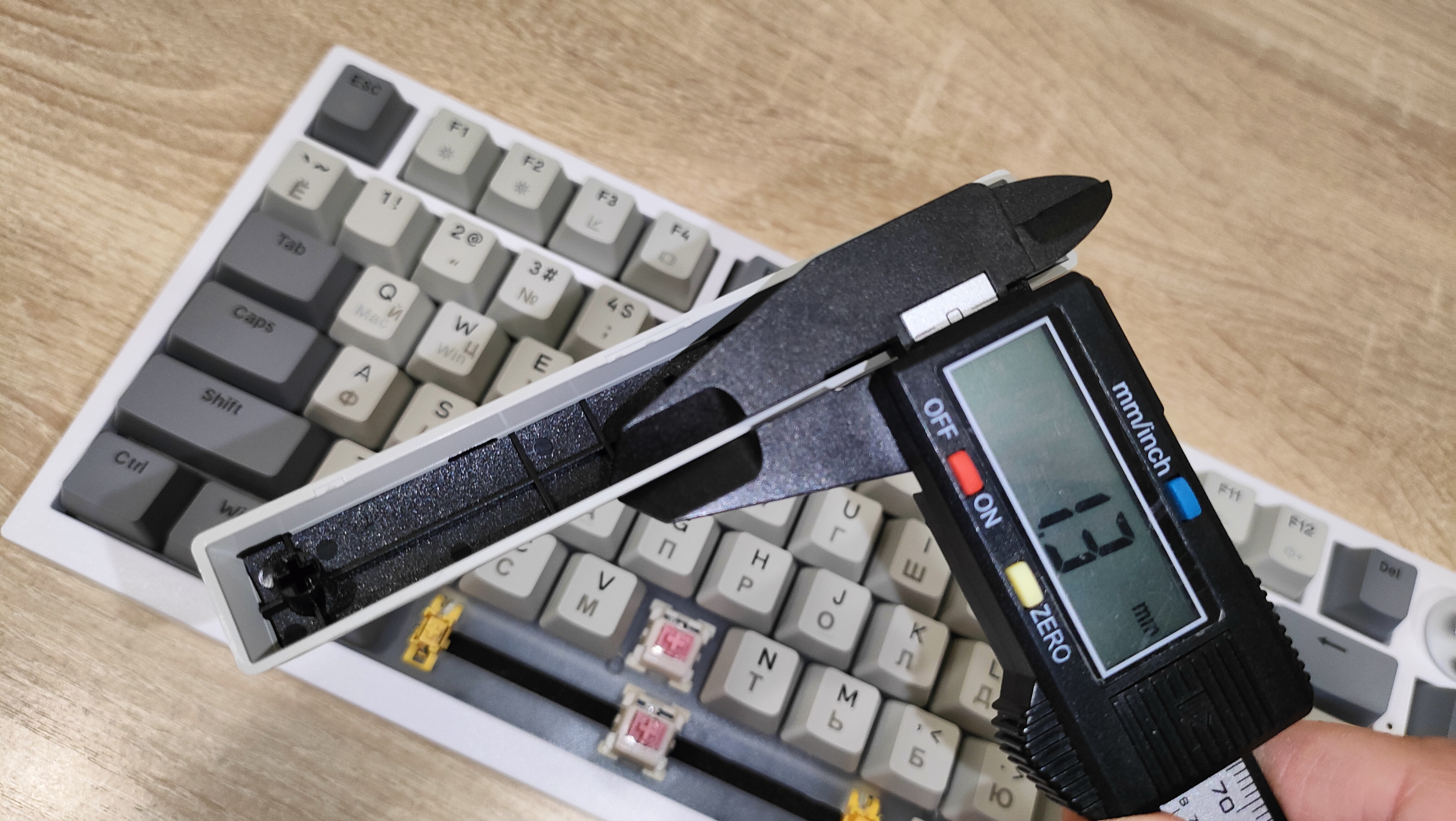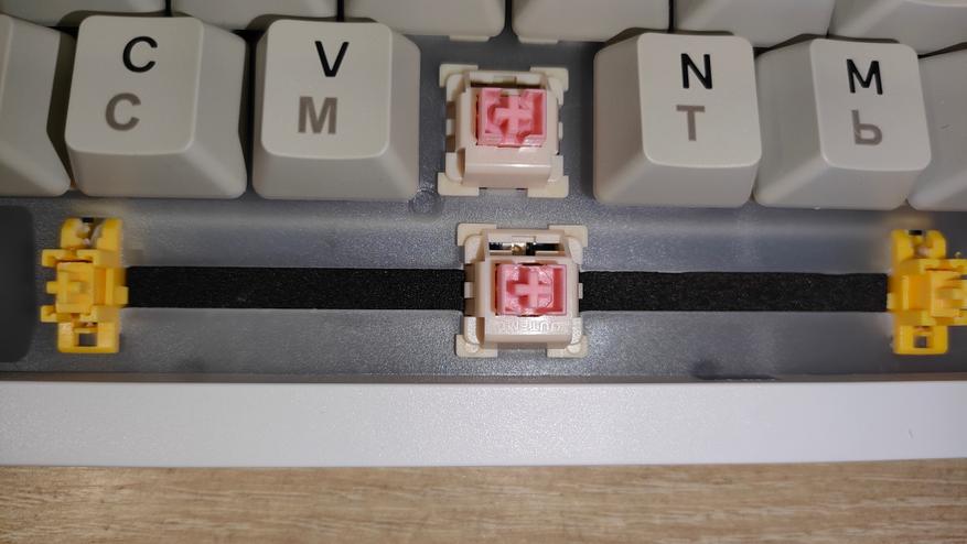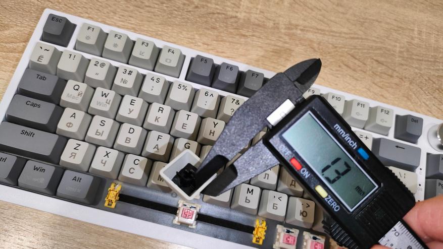 Колпачки выполнены из PBT пластика методом двойного литья, толщина стенки 1.3 мм, что стандартное значение, иногда штангенциркуль показывал 1.4 мм, но я возьму минимальное значение, меньше вопросов будет. Стабилизаторы смазаны и установлены в пластину позиционирования. Переключатели тоже смазаны, у них нет явного песка, нет звона. Это отлично. Собрана клавиатура на прокладках, и слегка прогибается при нажатии.