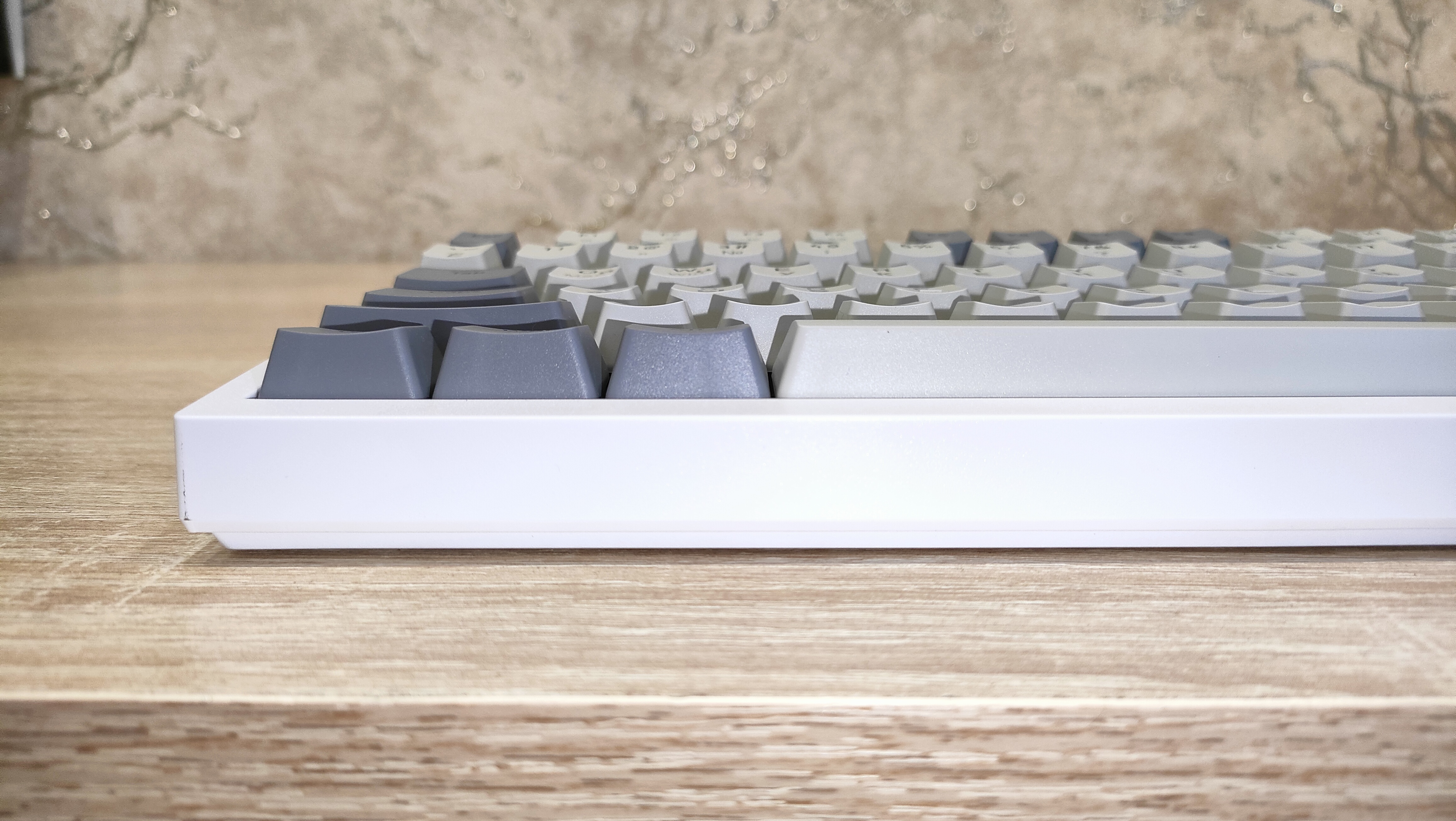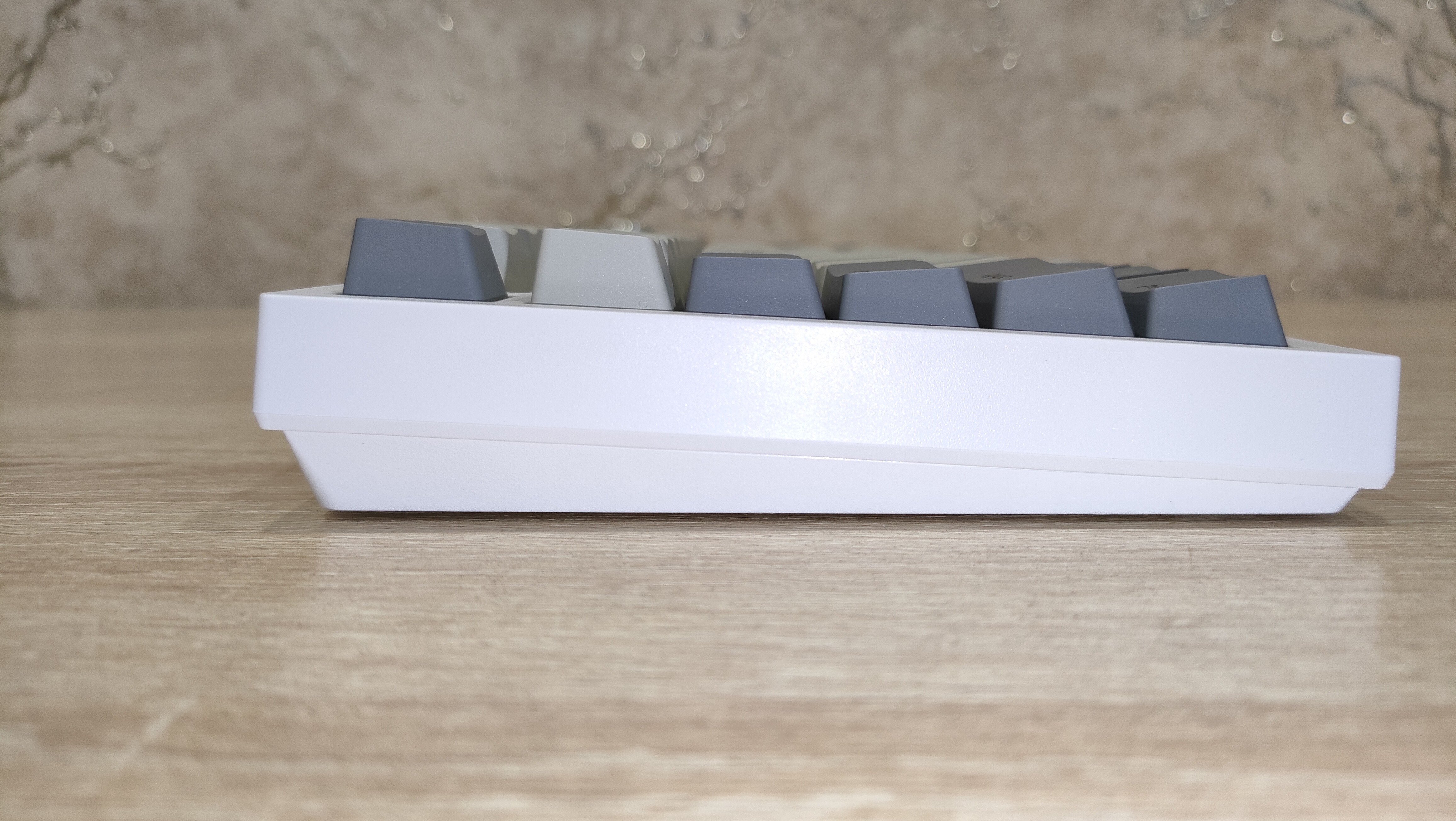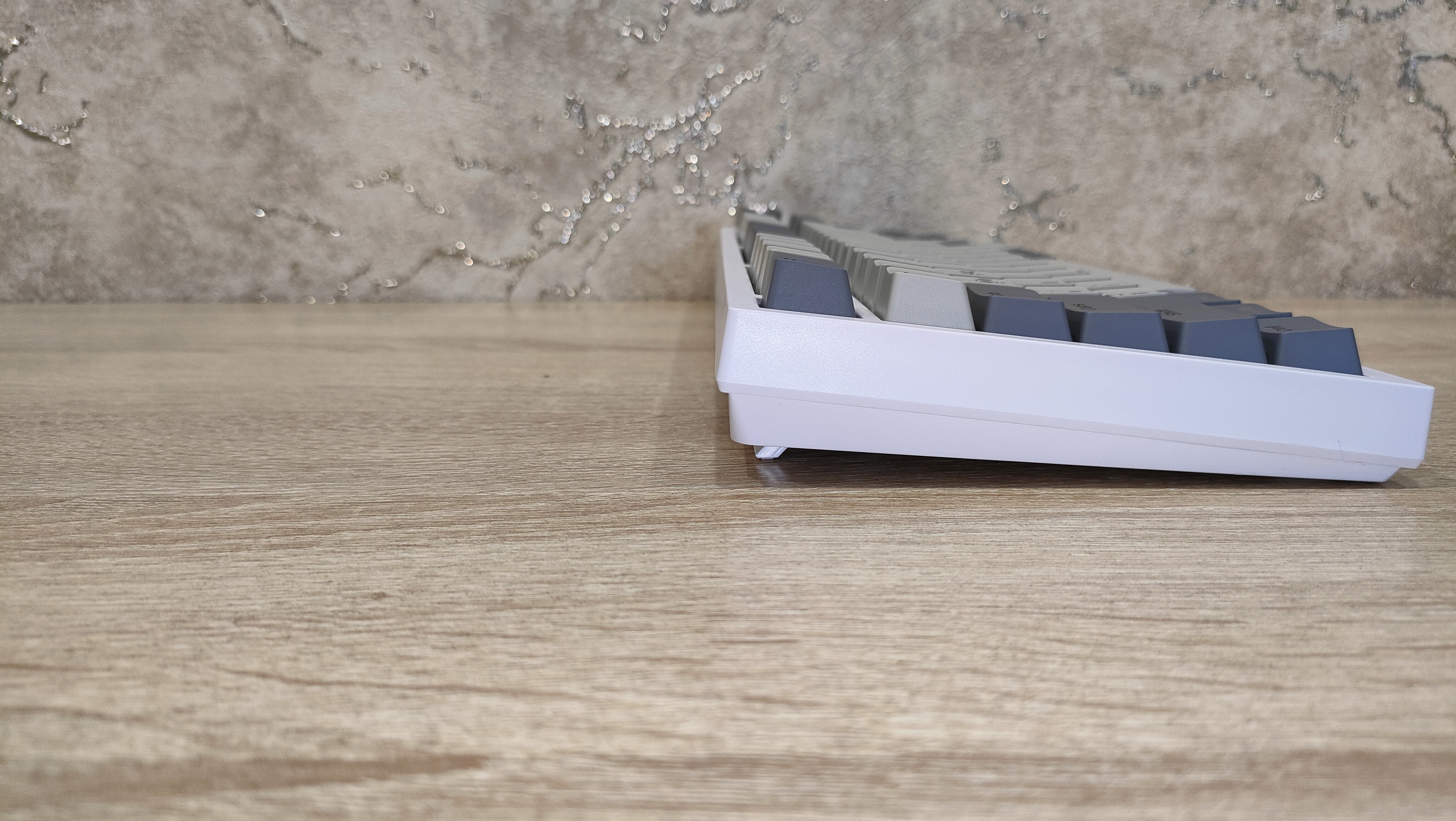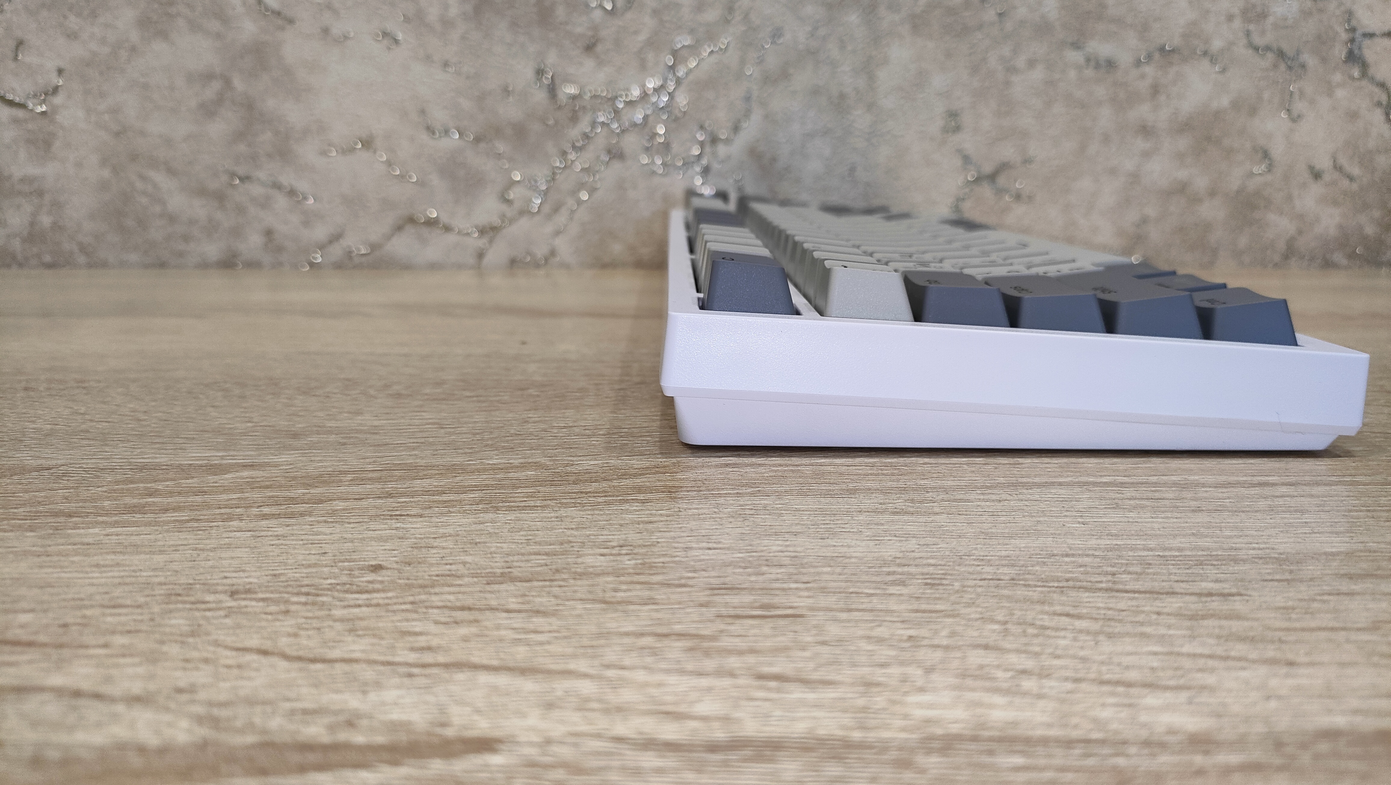 Колпачки выполнены из PBT пластика методом двойного литья, толщина стенки 1.3 мм, что стандартное значение, иногда штангенциркуль показывал 1.4 мм, но я возьму минимальное значение, меньше вопросов будет. Стабилизаторы смазаны и установлены в пластину позиционирования. Переключатели тоже смазаны, у них нет явного песка, нет звона. Это отлично. Собрана клавиатура на прокладках, и слегка прогибается при нажатии.
