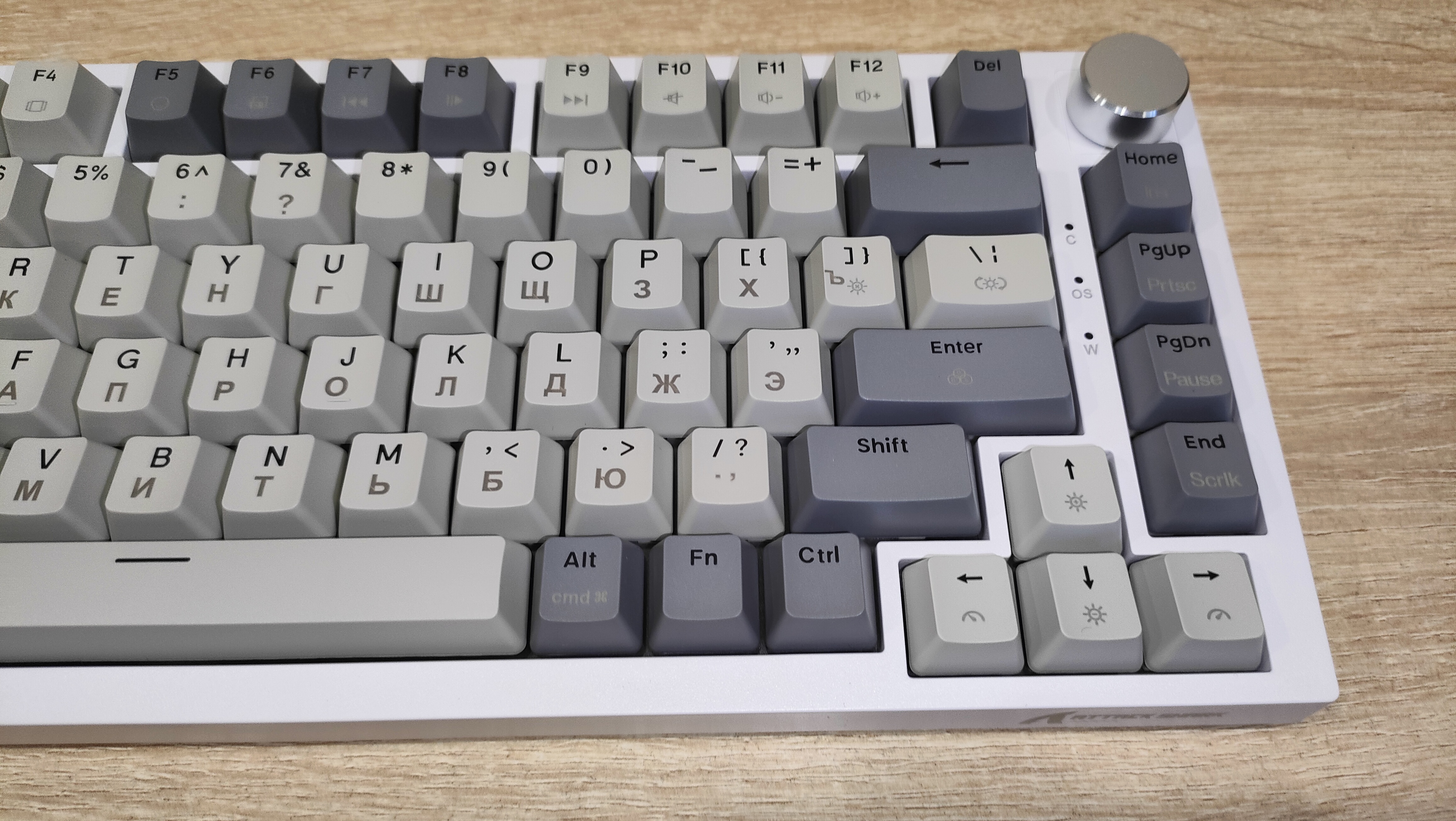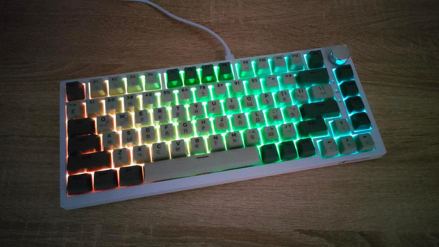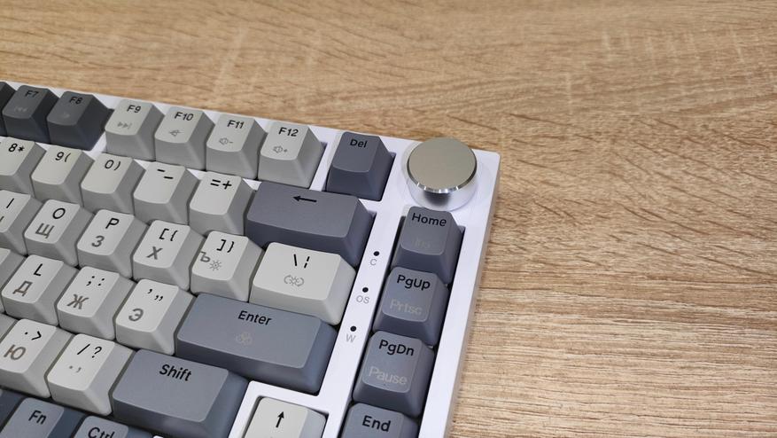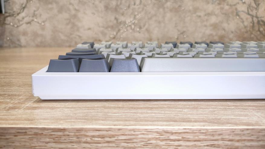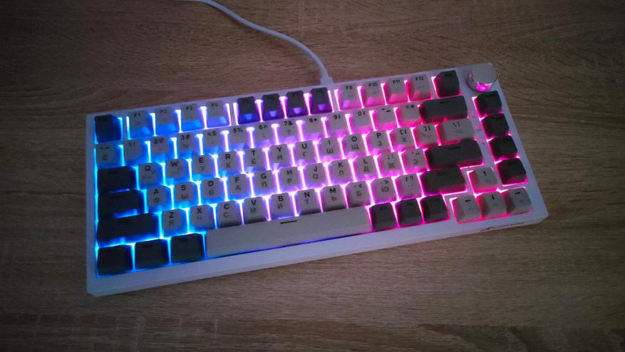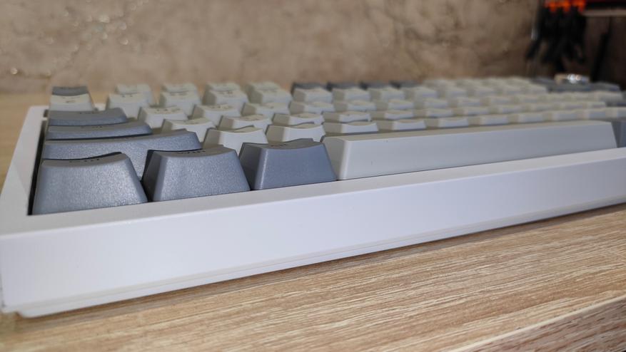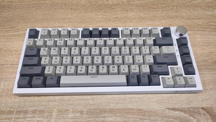 Формат клавиатуры 75%, ANSI, шифты широкие, Enter одноэтажный. Профиль колпачков OEM/Cherry подобный. Все привычно, все стандартно. Привыкать большинству даже не придется, т.к. профиль и расположение привычные. Многие тоскуют по Enter в два этажа, но увы и ах…