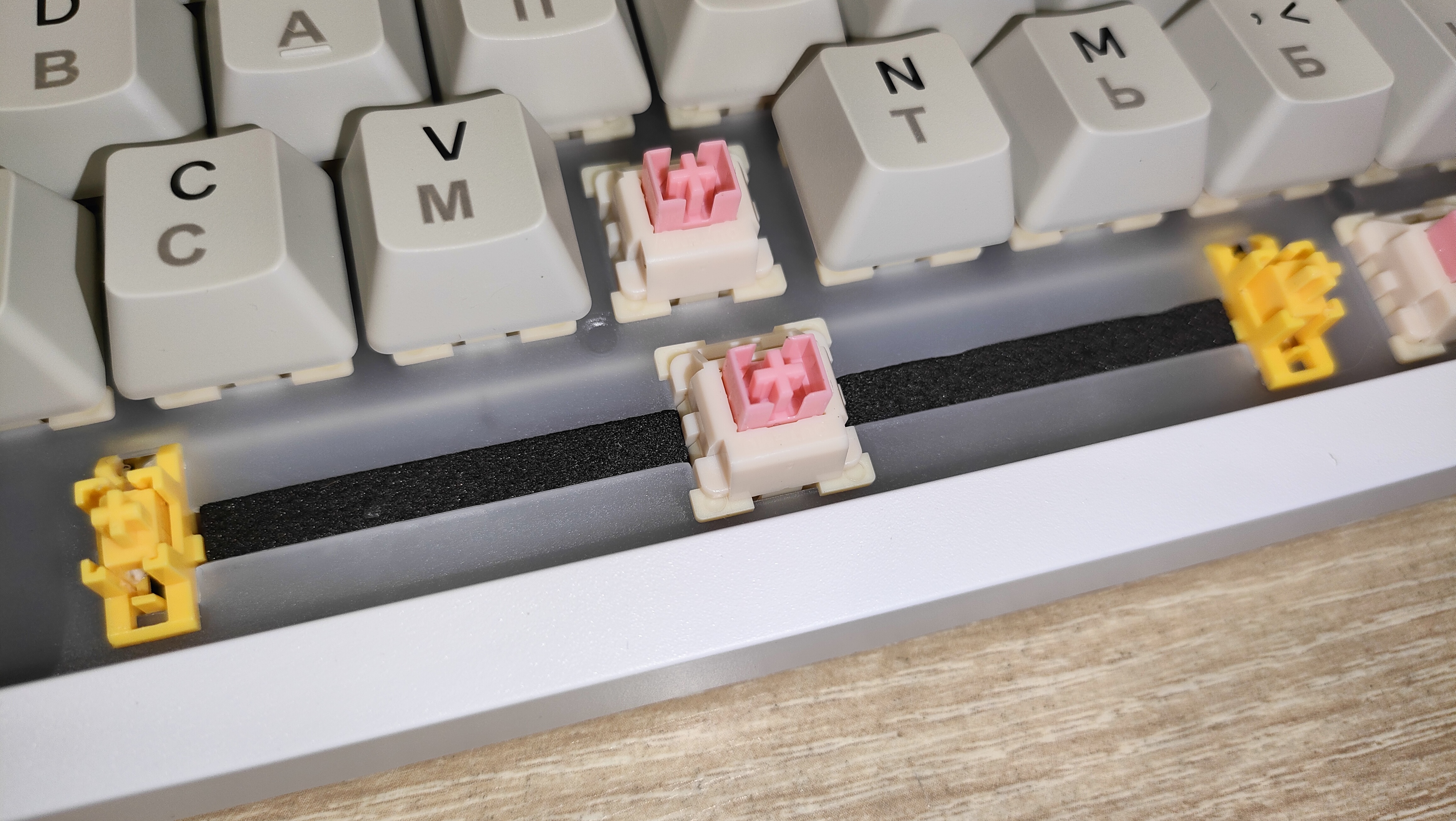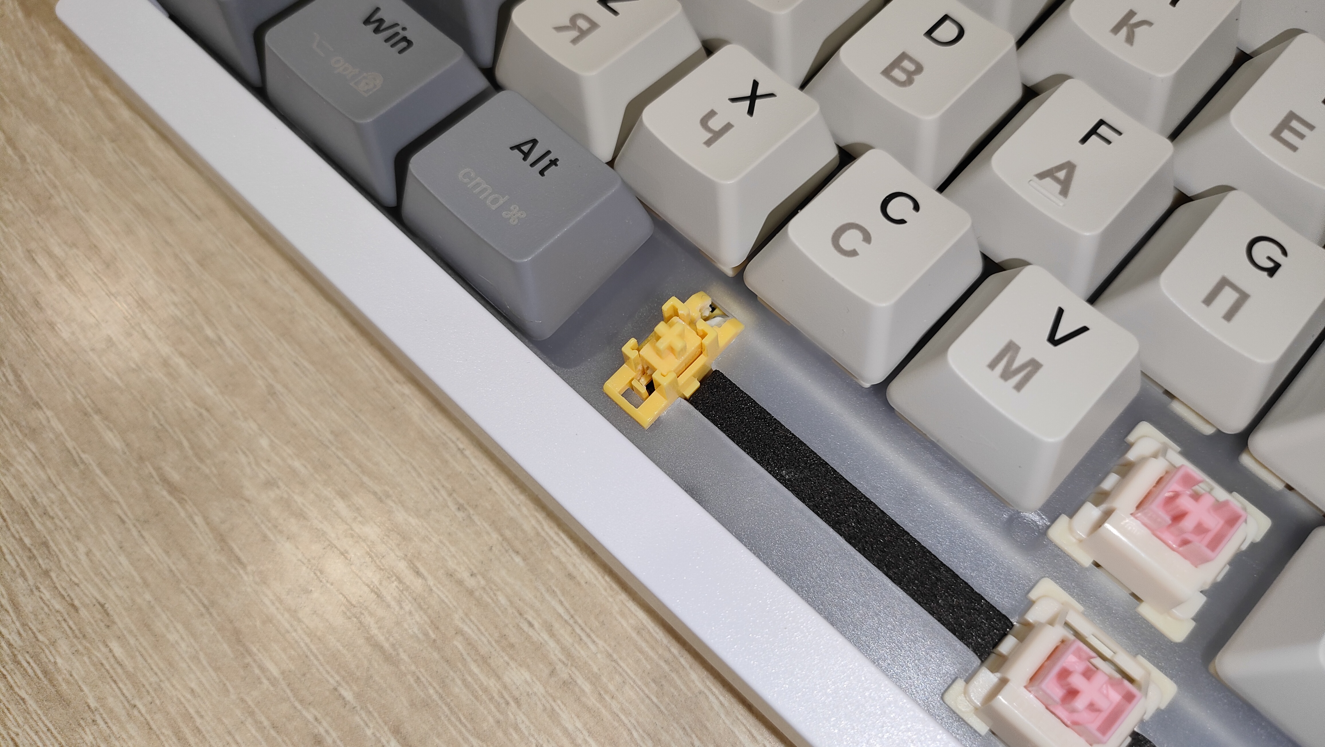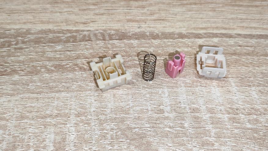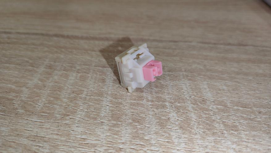 Переключатели Outemu Pink Beige, параметры стандартные линейные, ход 2-4 мм, но он настраивается, усилие 40 г вначале и 60 грамм в пике. Все смазано.
