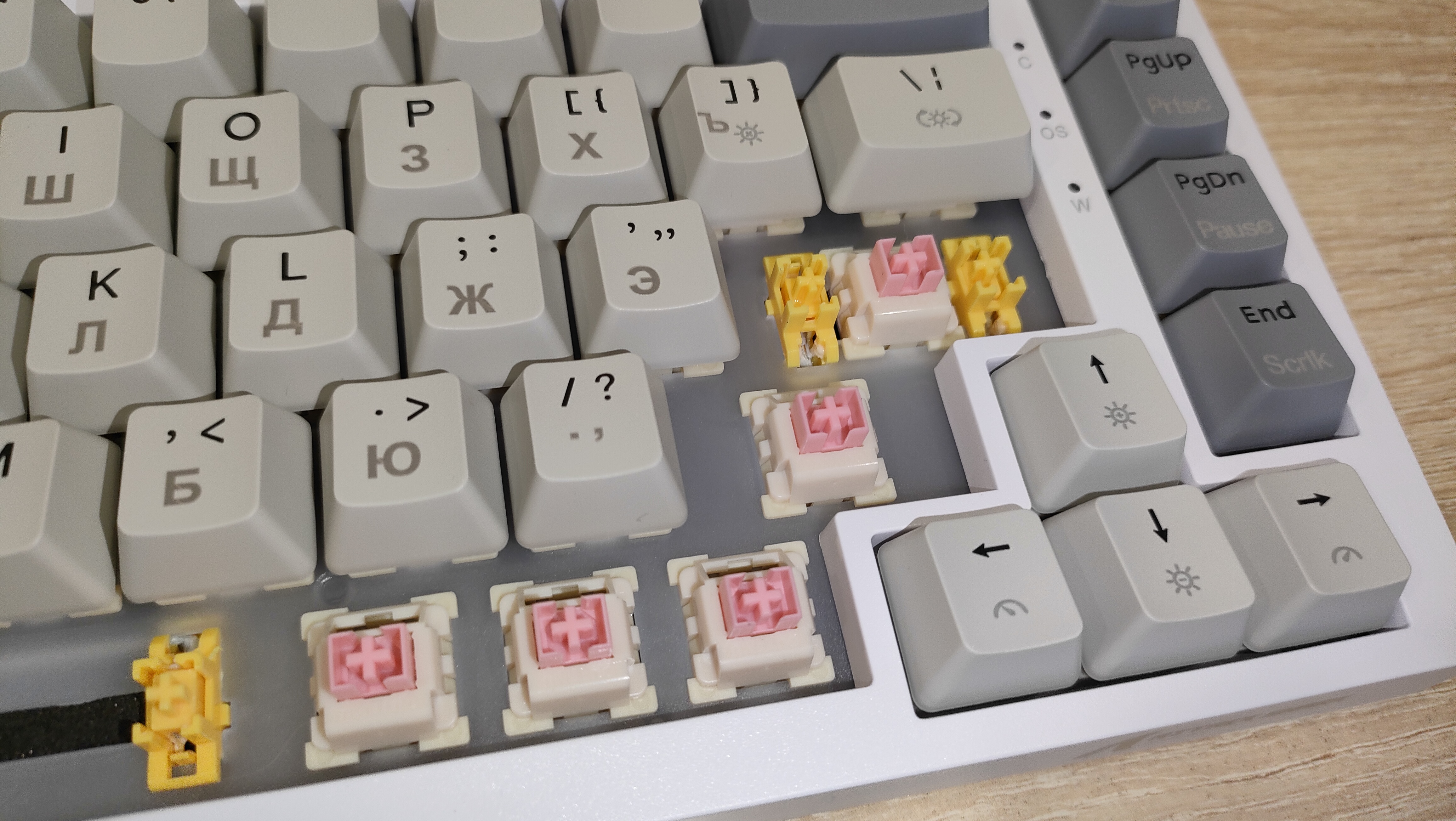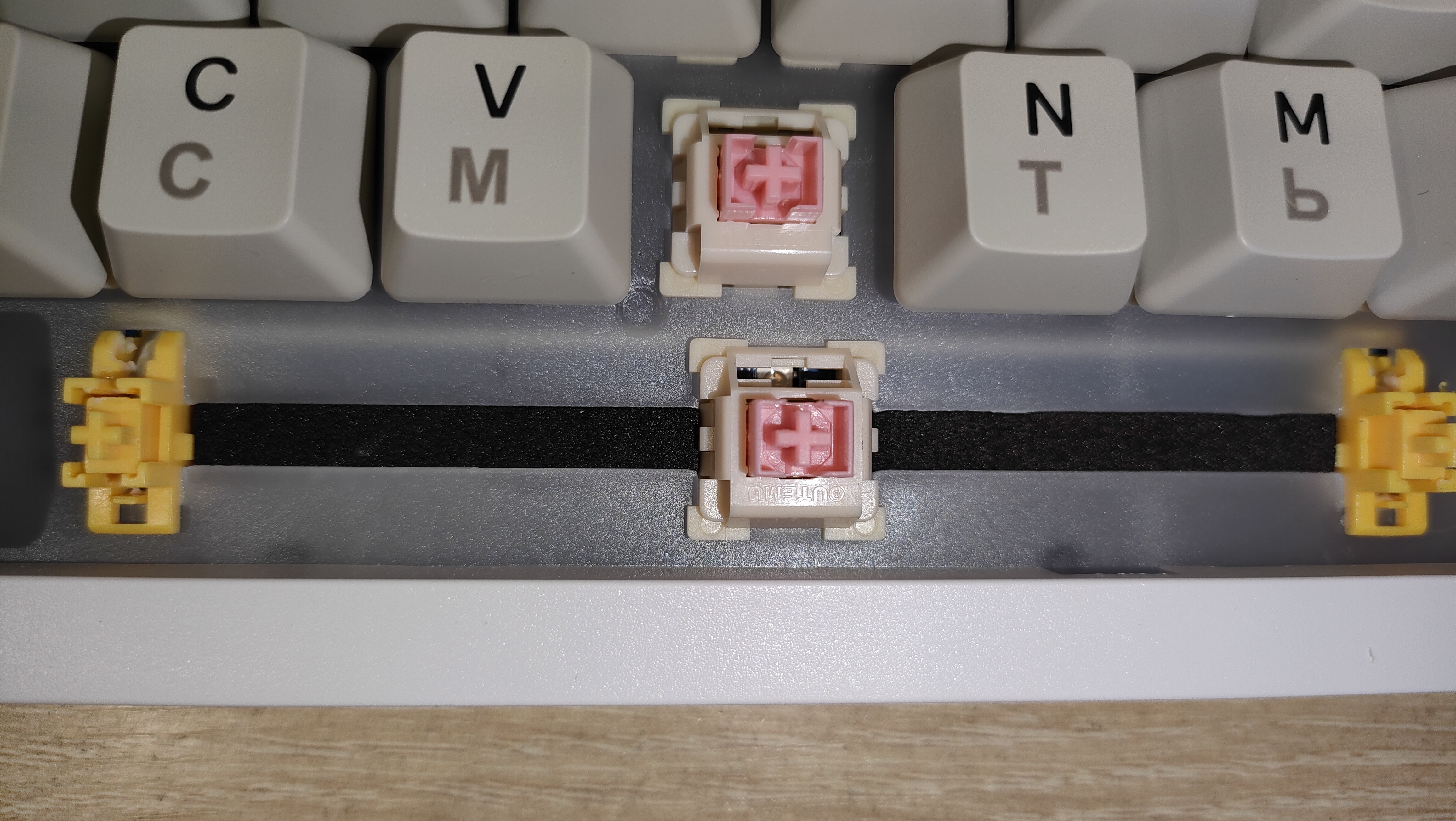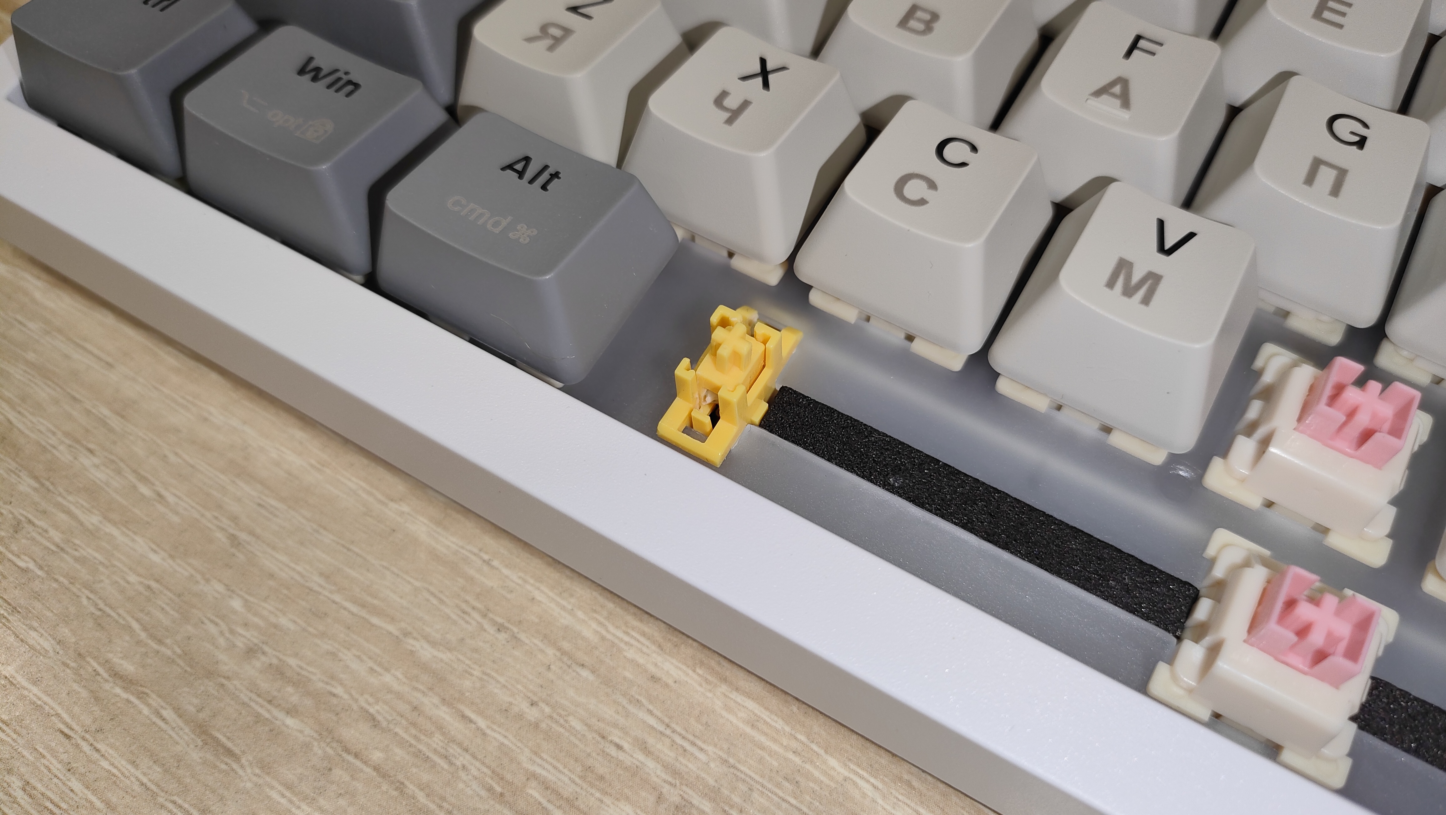 Переключатели Outemu Pink Beige, параметры стандартные линейные, ход 2-4 мм, но он настраивается, усилие 40 г вначале и 60 грамм в пике. Все смазано.