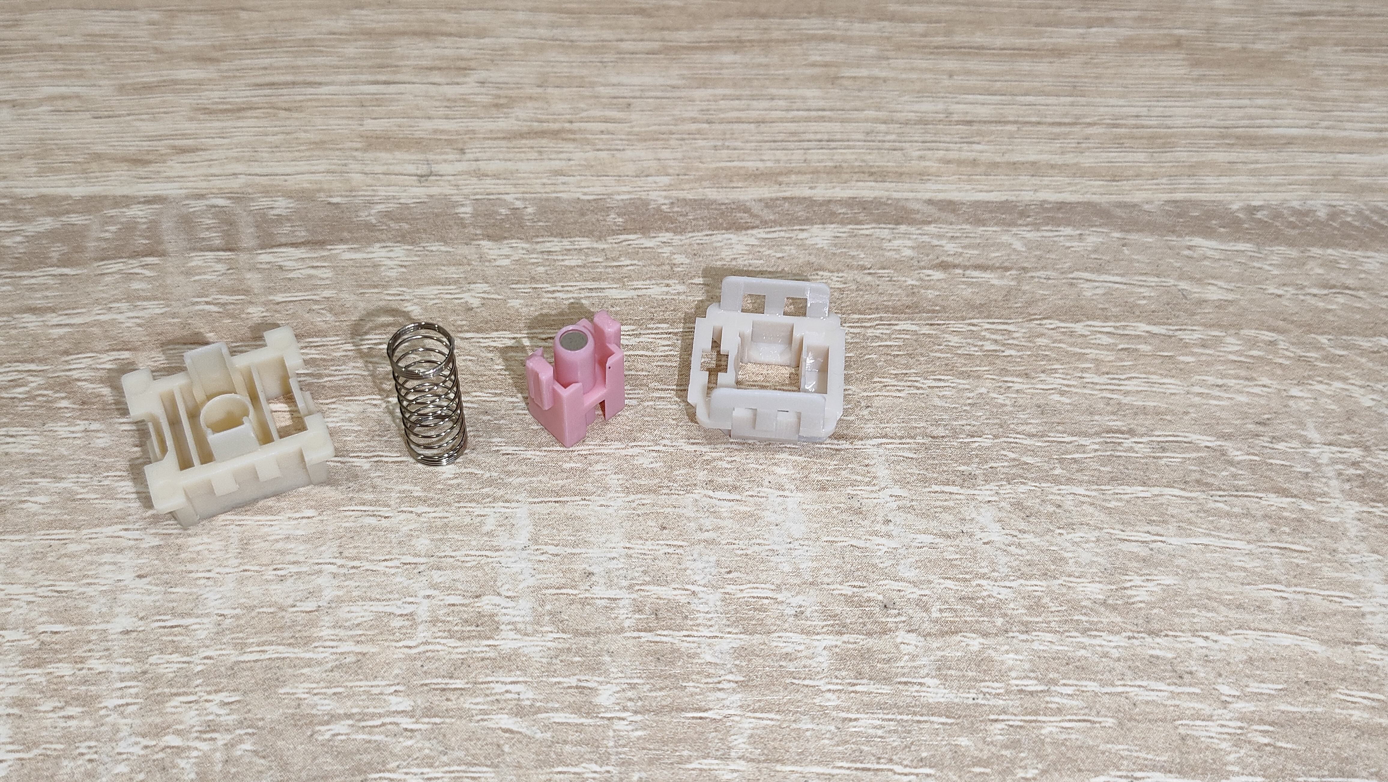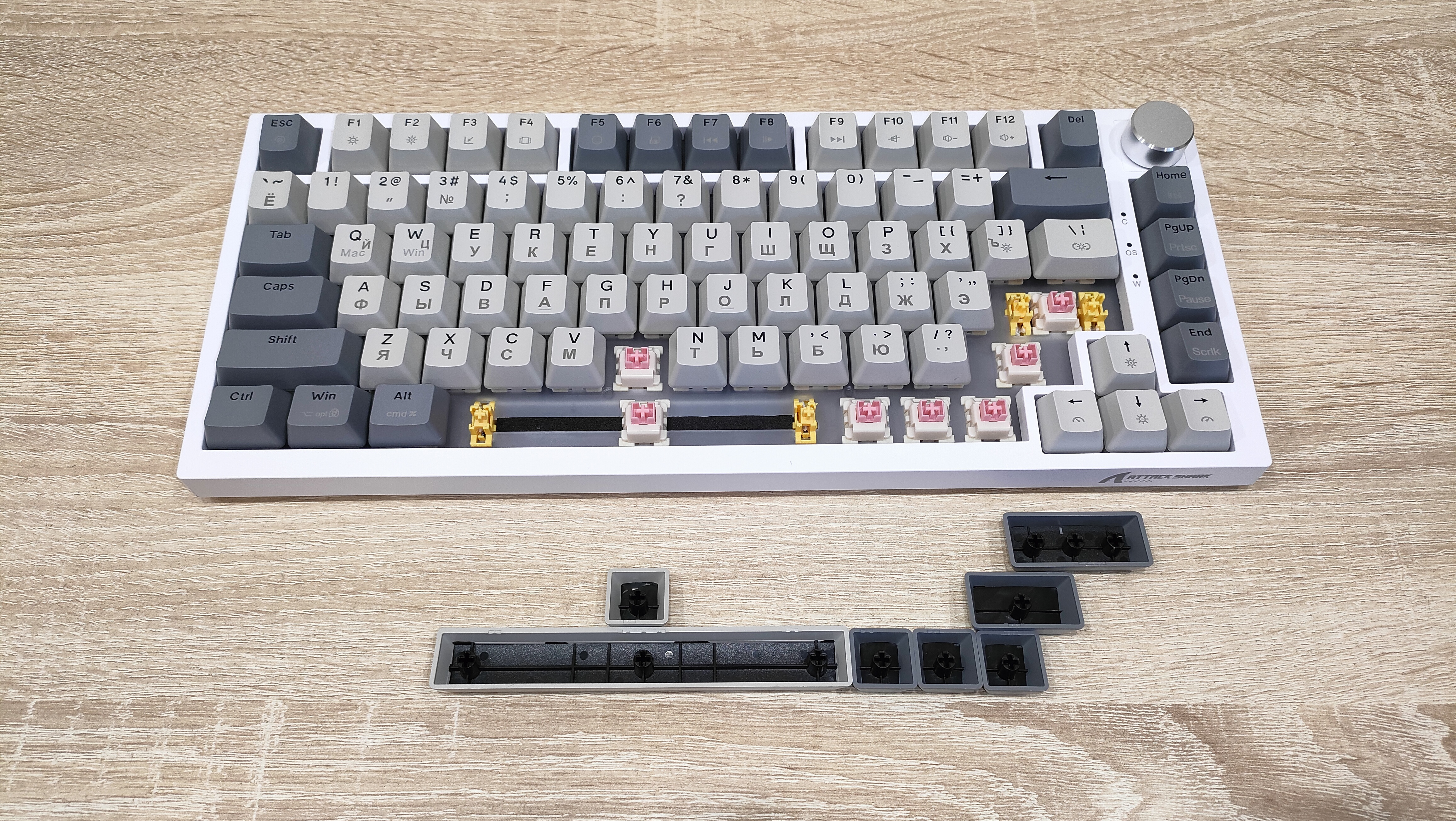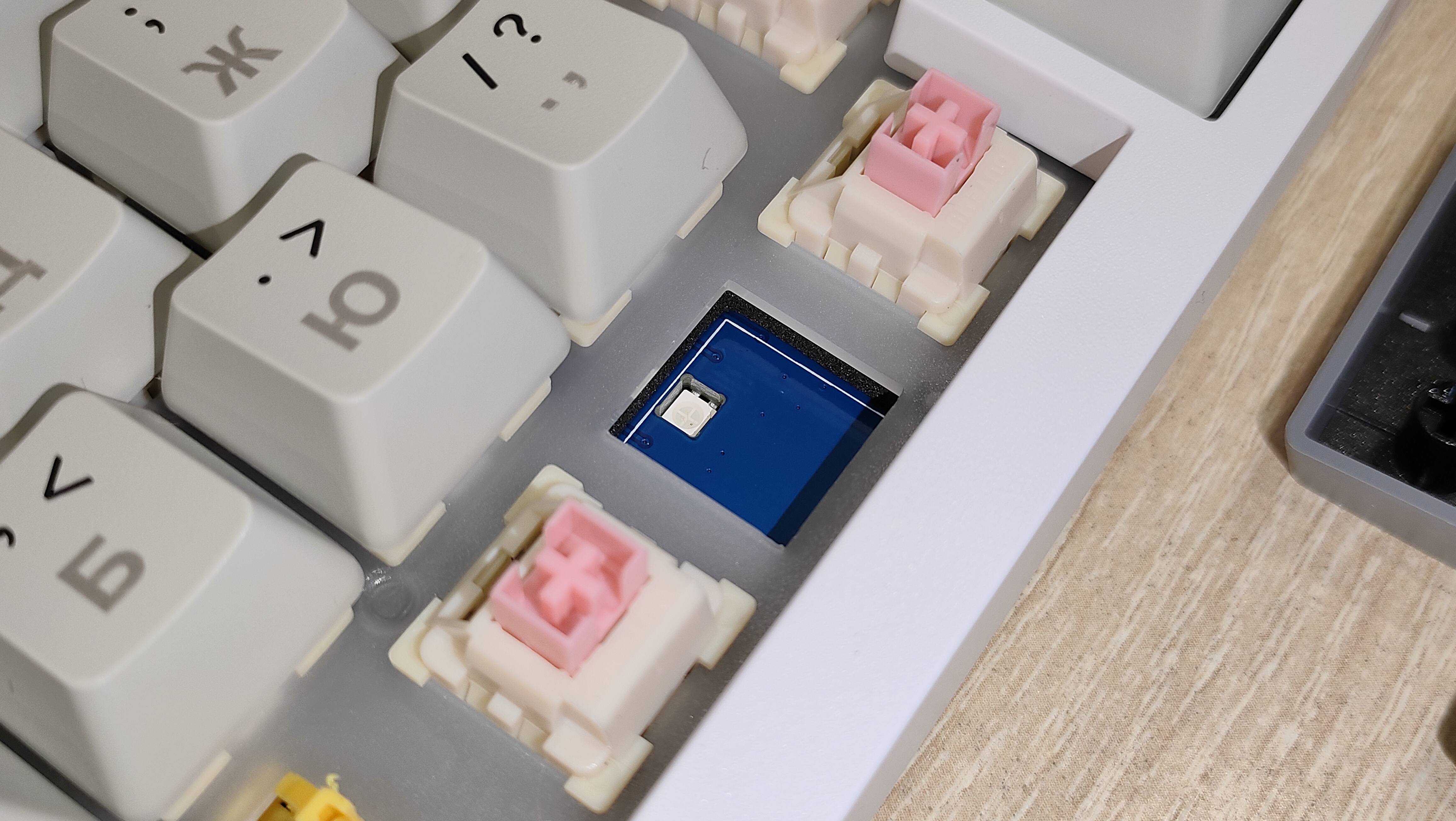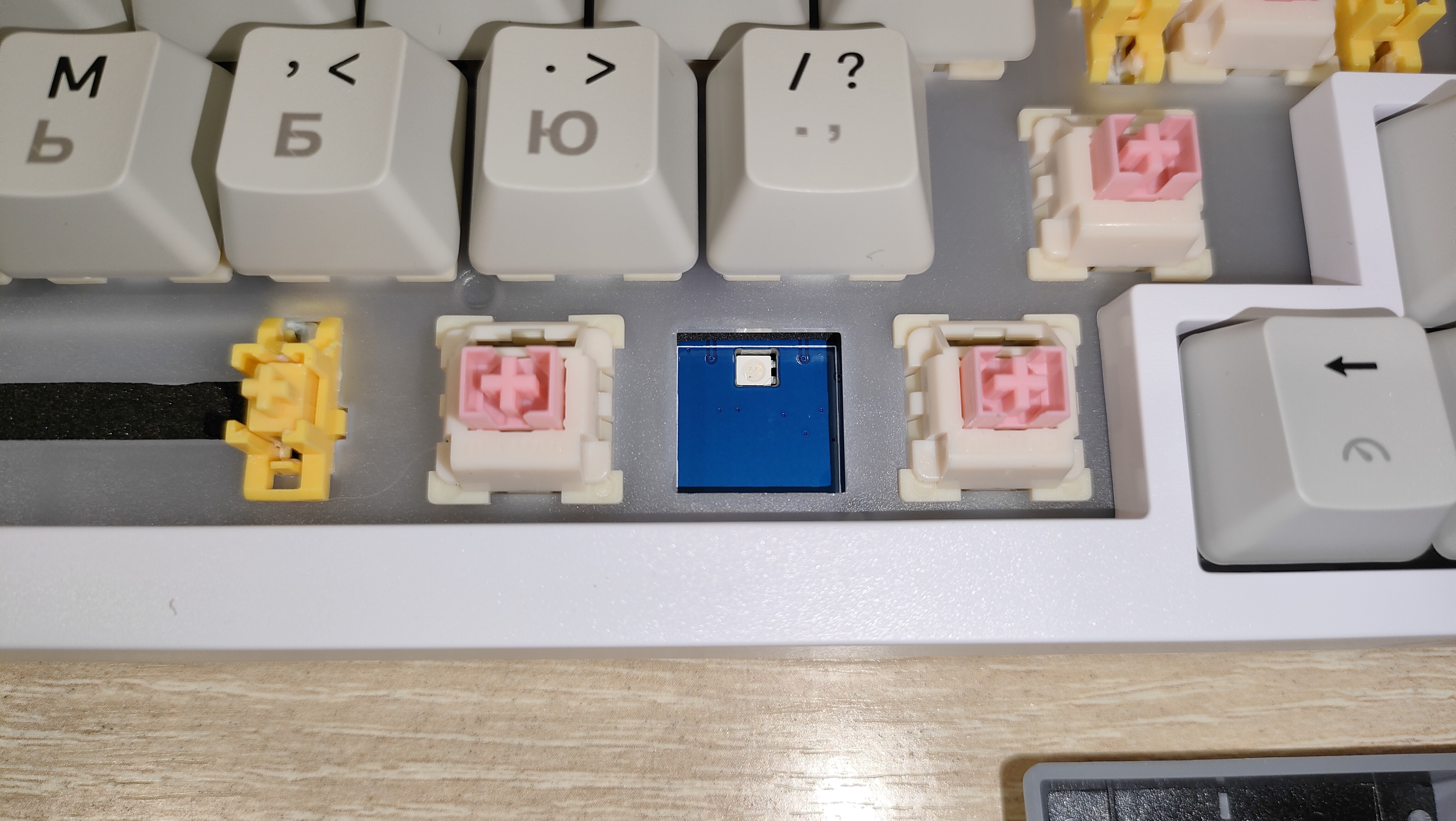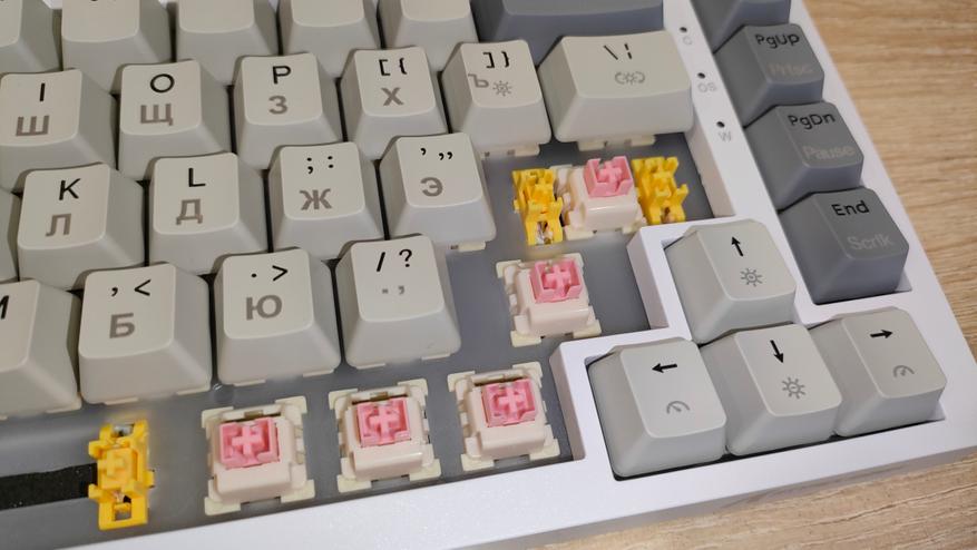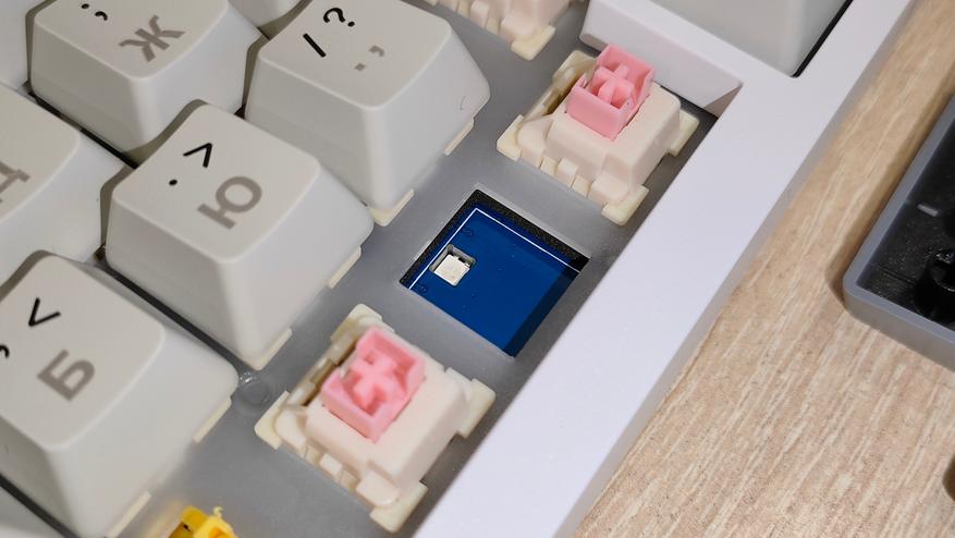 | Переключатели | Outemu Magnetic Pink Beige: линейный магнитный тип, усилие 40 грамм до срабатывания и 60 г до упора, ход до срабатывания от 2.0 мм до 4.0 мм, можно настраивать; смазаны с завода; горячая замена есть |