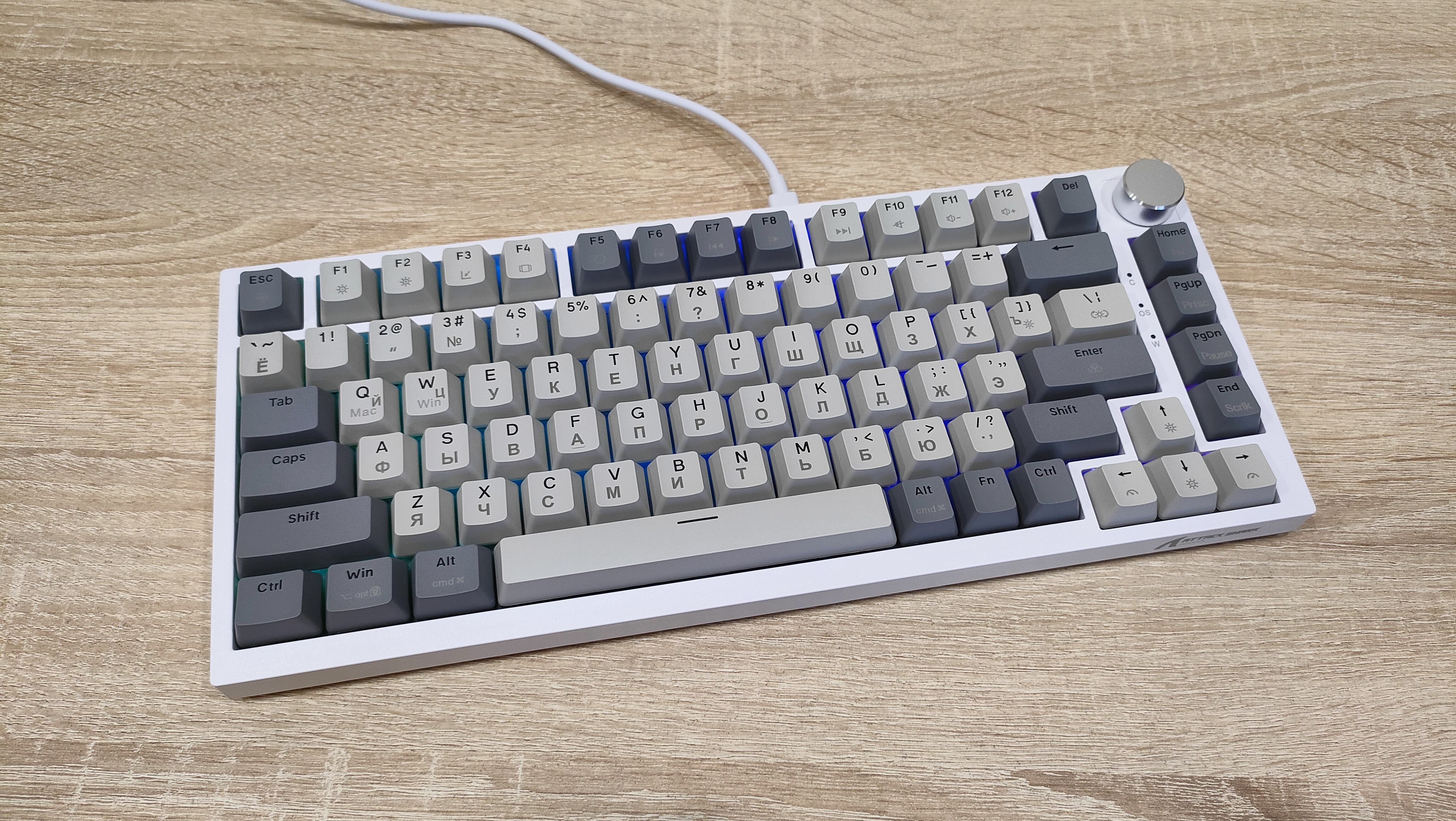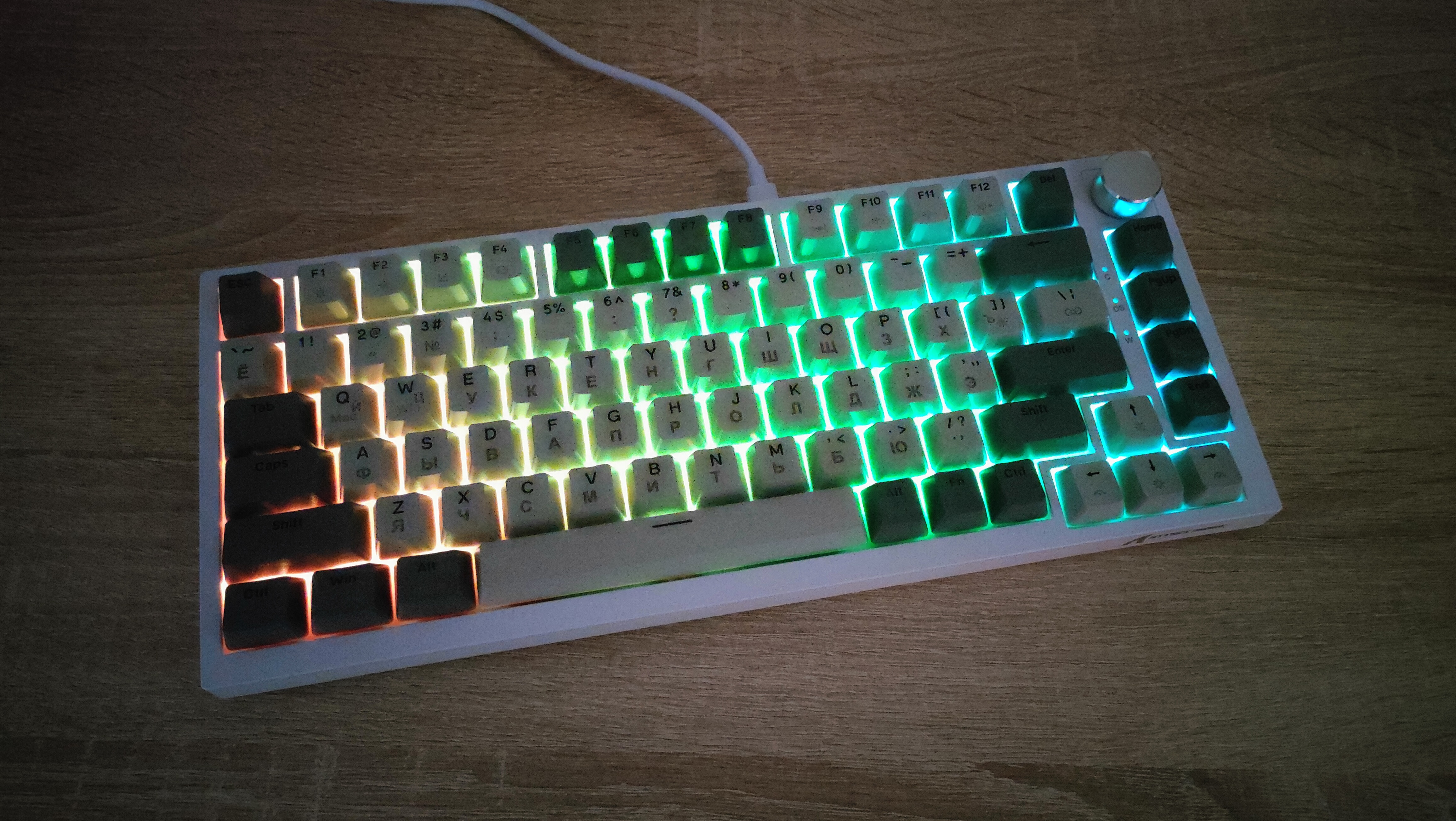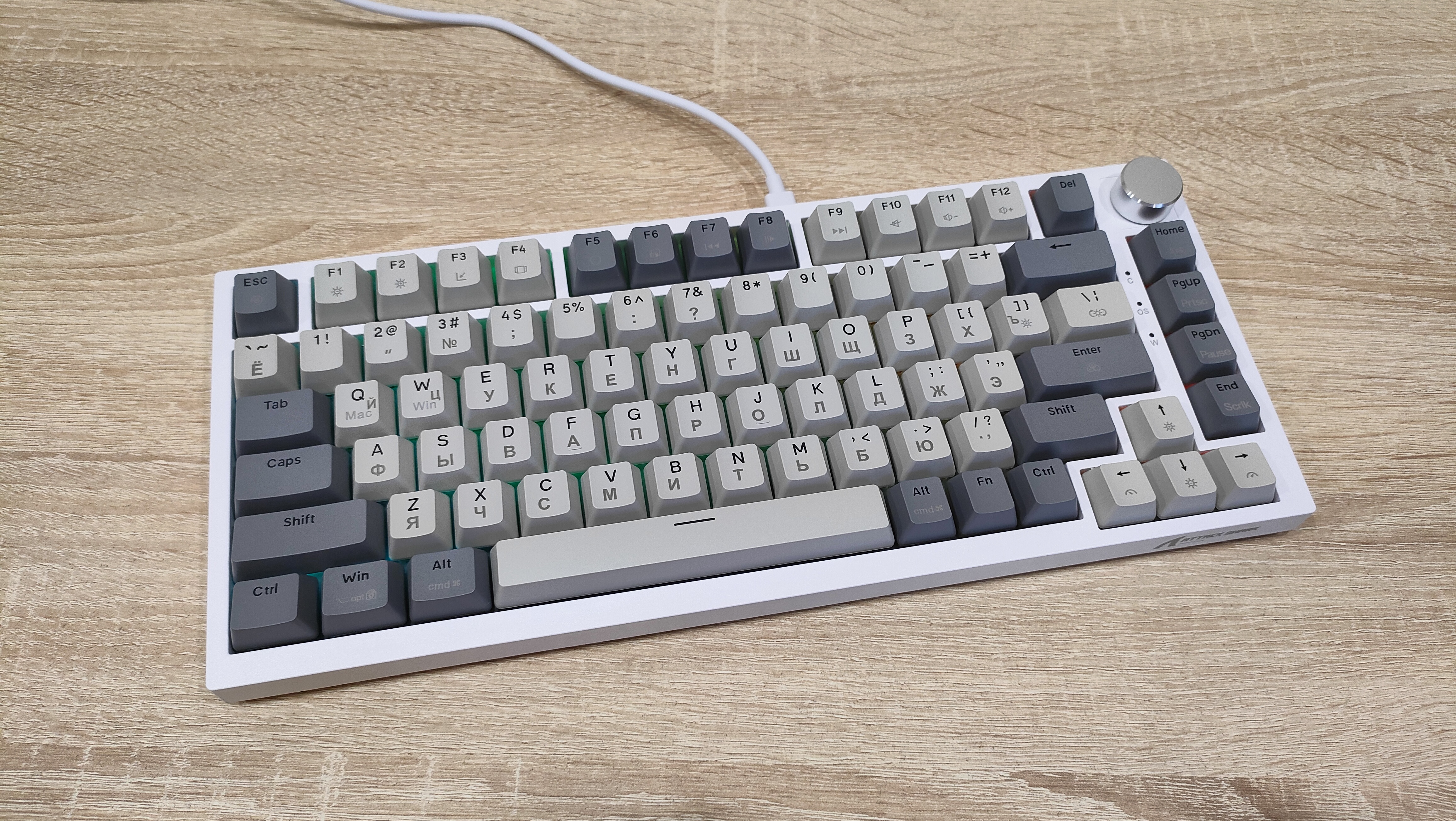 Внешний вид, где-то скучный, где-то классический. Цвета колпачков подходит под ретро стилистику. Кириллица сразу привлекает к себе внимание, нанесена она гравировкой. Но придет время и скоро все изменится, уже сейчас идет подготовка к литью сразу с кириллицей, более того, она будет светиться! А пока гравировка и потихоньку она становится все ровнее и красивее. Первые были жутко кривыми, когда видел ее в отзывах, сперва смеялся, потом плакал, потом снова смеялся. И спустя 3-4 итерации, прогресс есть. Корпус клавиатуры пластиковый, впрочем, другого и не ожидалось, т.к. цену удержать бы не удалось. Внешний вид сейчас обсуждать уже не особо интересно, т.к. форматы давно отработаны, а внешний вид в основном отличается за счет расцветки. Бывают, конечно, свежие идеи, но в основном, преимущественно дорогих устройствах, например, та же Melgeek с магнитами, стоила свыше 12 тыс. руб. у нас.