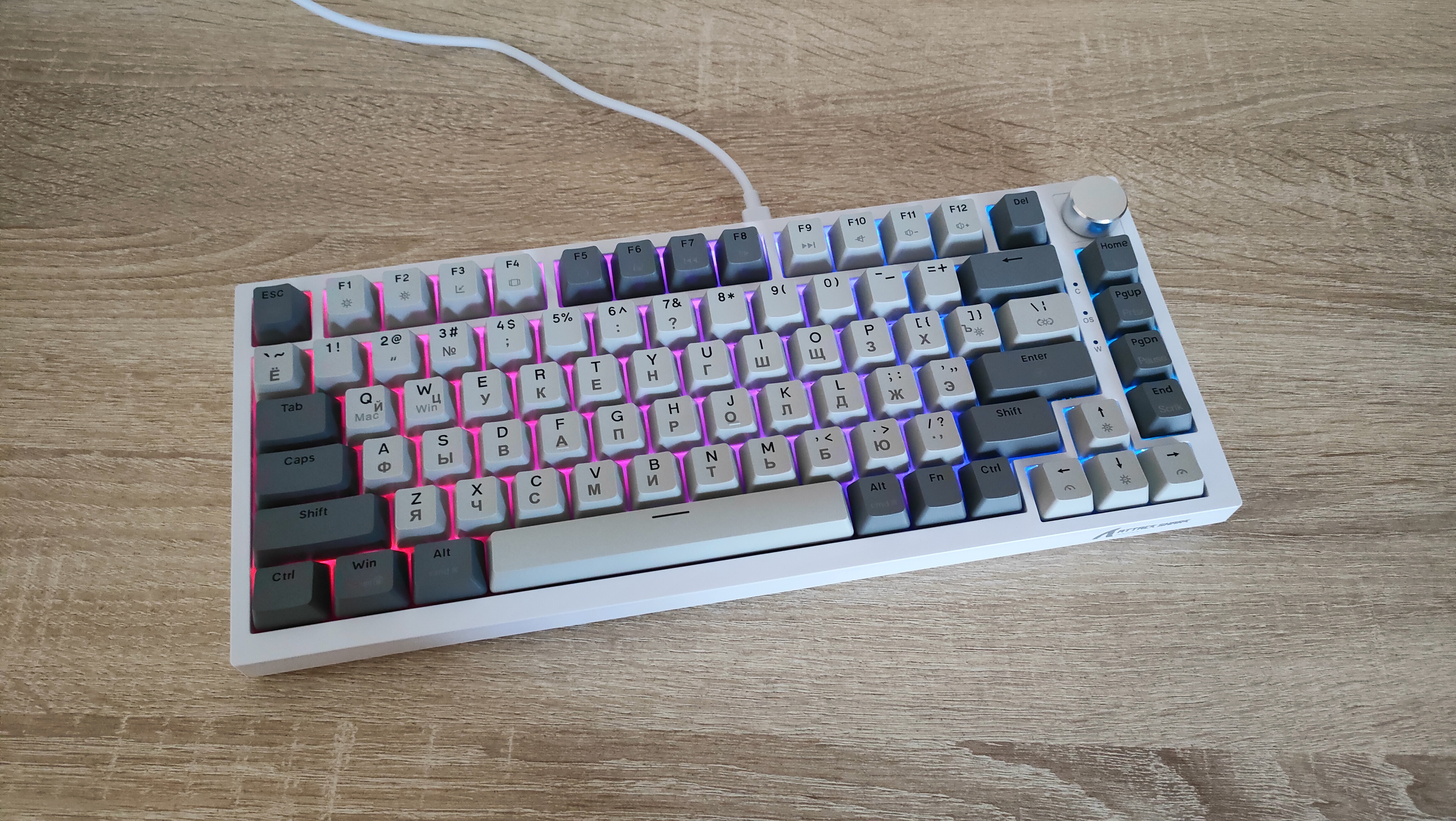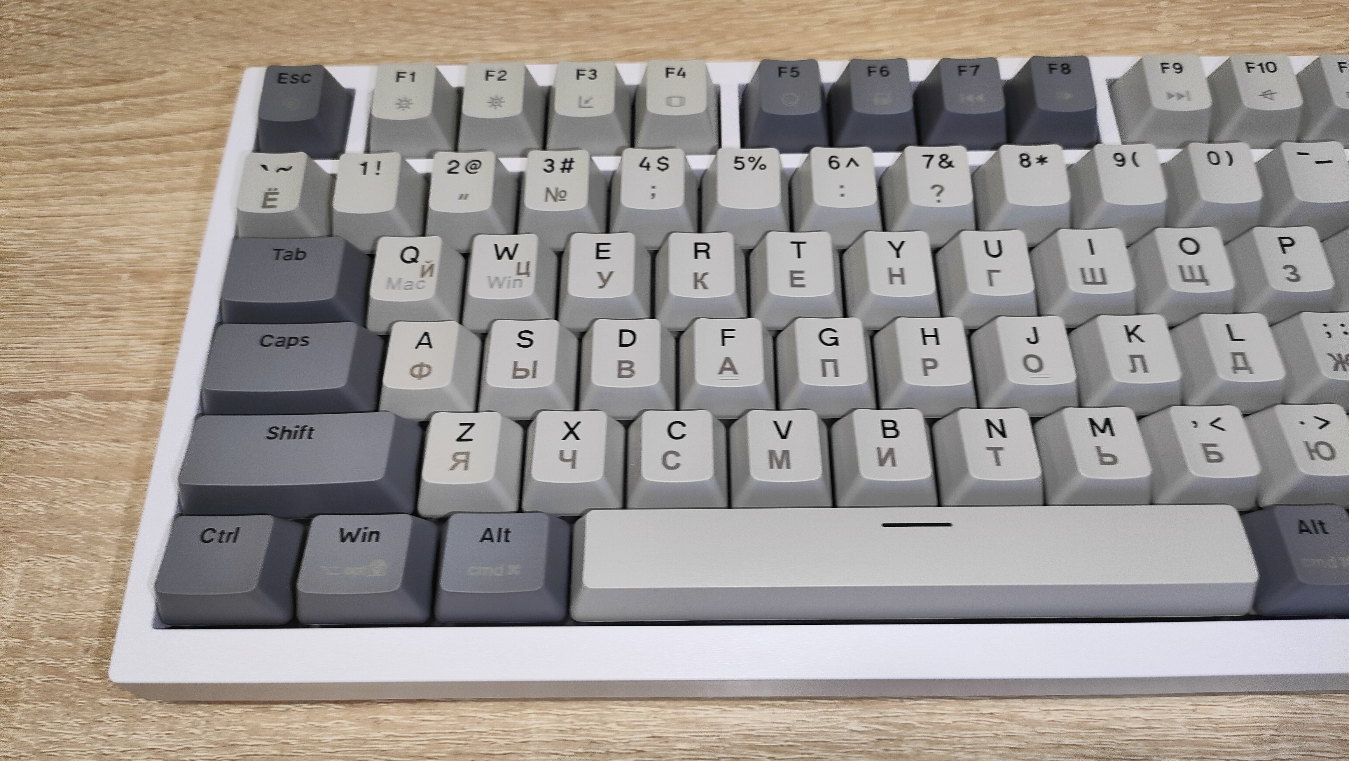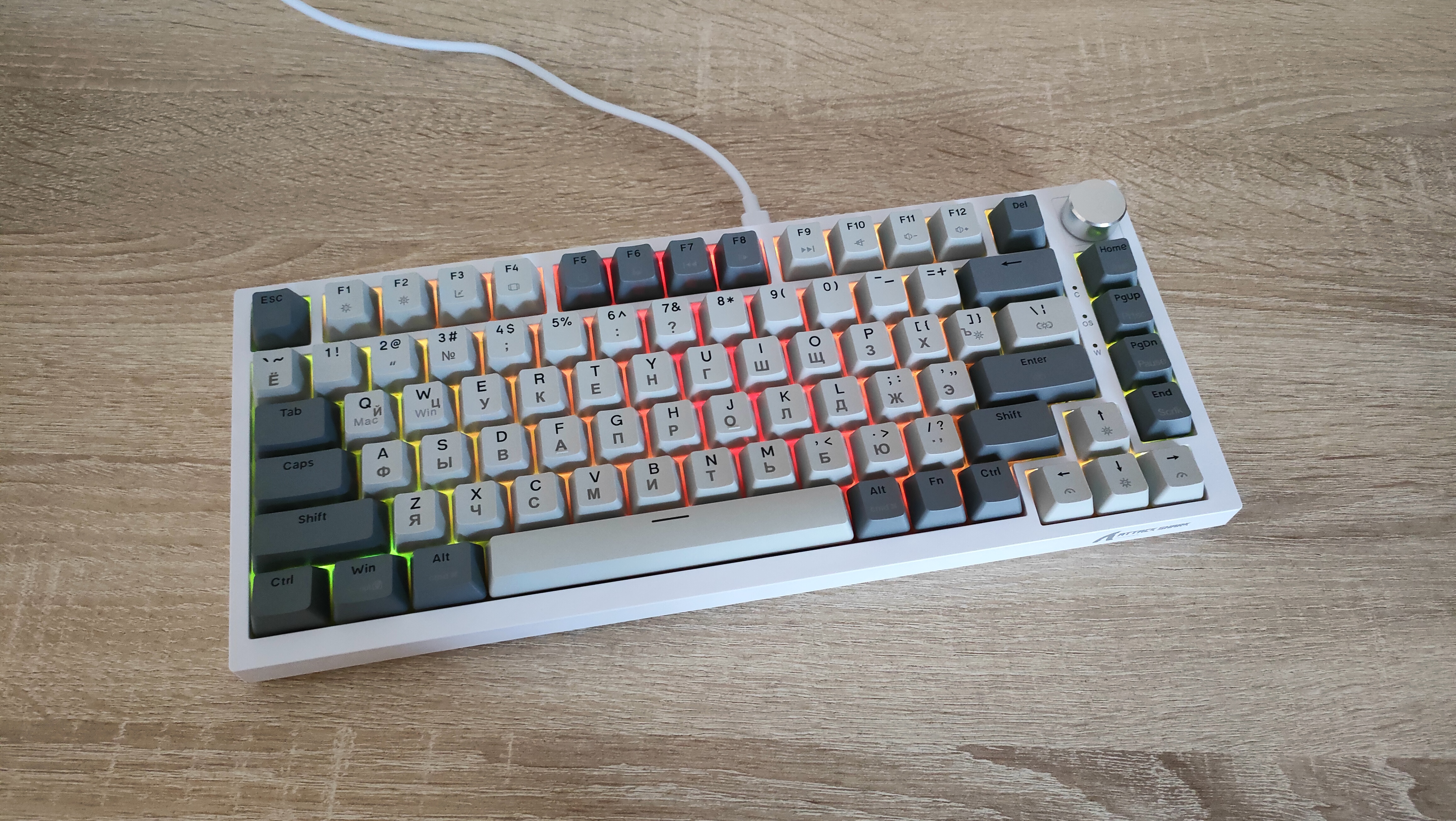 Внешний вид, где-то скучный, где-то классический. Цвета колпачков подходит под ретро стилистику. Кириллица сразу привлекает к себе внимание, нанесена она гравировкой. Но придет время и скоро все изменится, уже сейчас идет подготовка к литью сразу с кириллицей, более того, она будет светиться! А пока гравировка и потихоньку она становится все ровнее и красивее. Первые были жутко кривыми, когда видел ее в отзывах, сперва смеялся, потом плакал, потом снова смеялся. И спустя 3-4 итерации, прогресс есть. Корпус клавиатуры пластиковый, впрочем, другого и не ожидалось, т.к. цену удержать бы не удалось. Внешний вид сейчас обсуждать уже не особо интересно, т.к. форматы давно отработаны, а внешний вид в основном отличается за счет расцветки. Бывают, конечно, свежие идеи, но в основном, преимущественно дорогих устройствах, например, та же Melgeek с магнитами, стоила свыше 12 тыс. руб. у нас.
