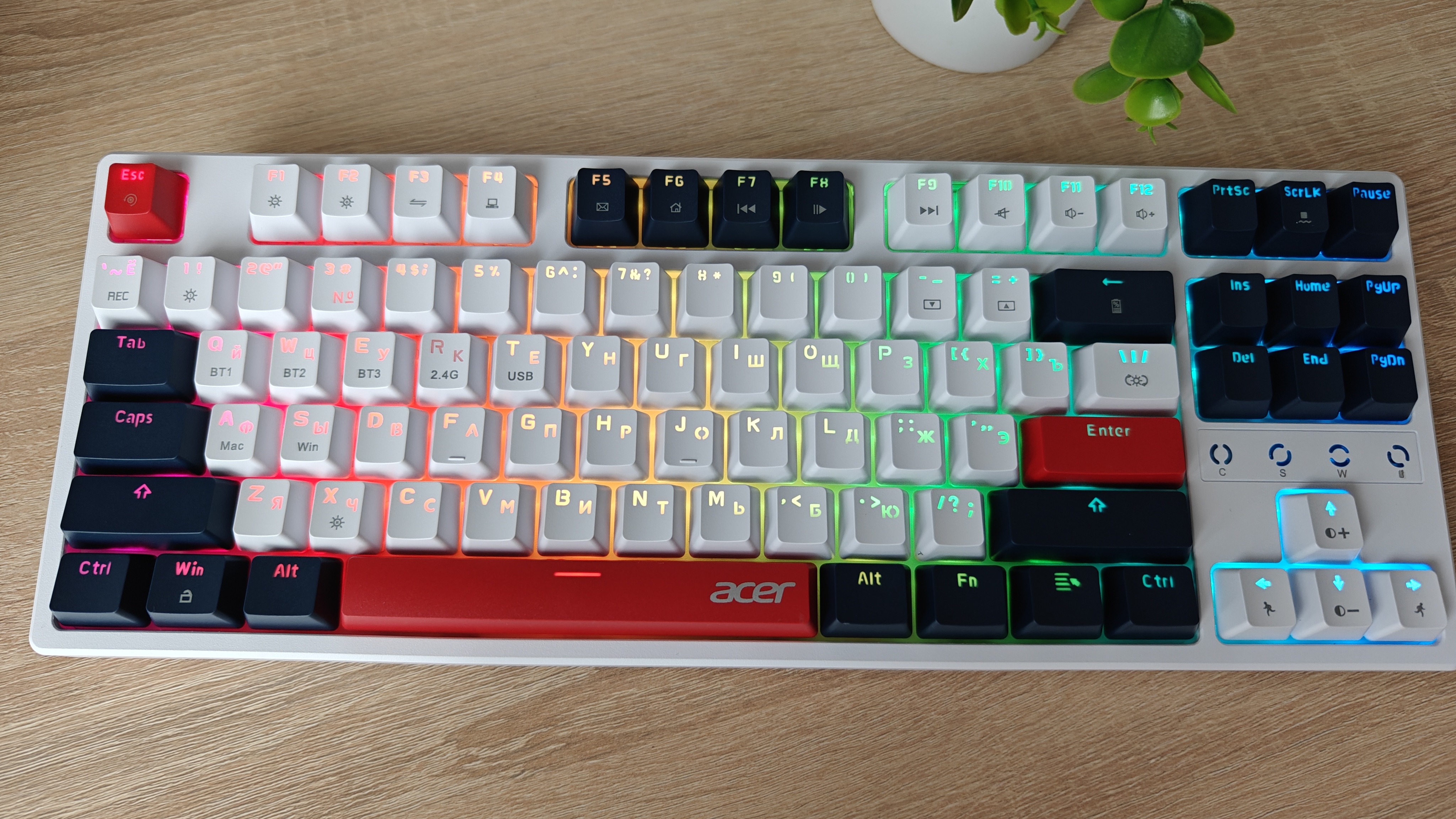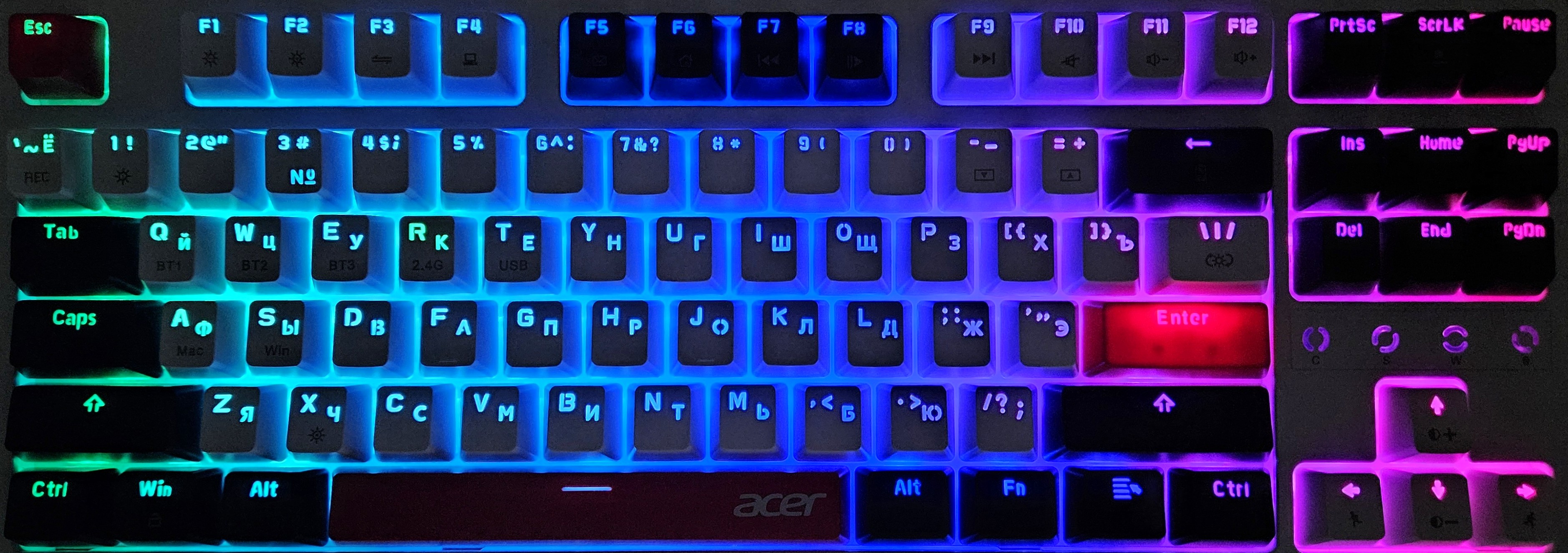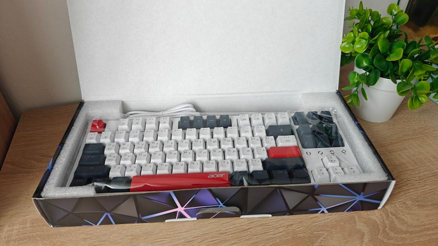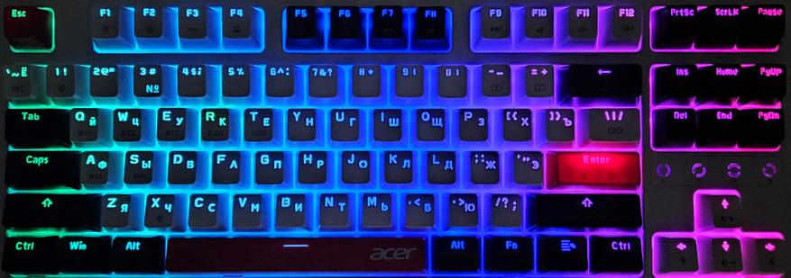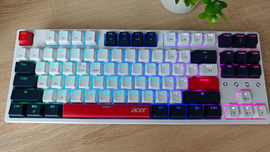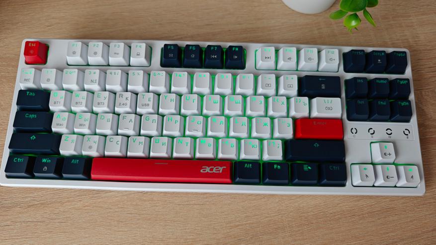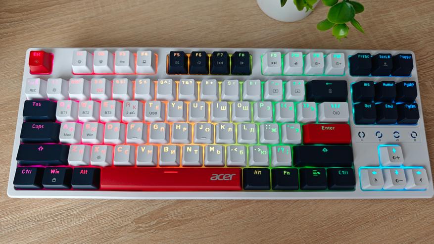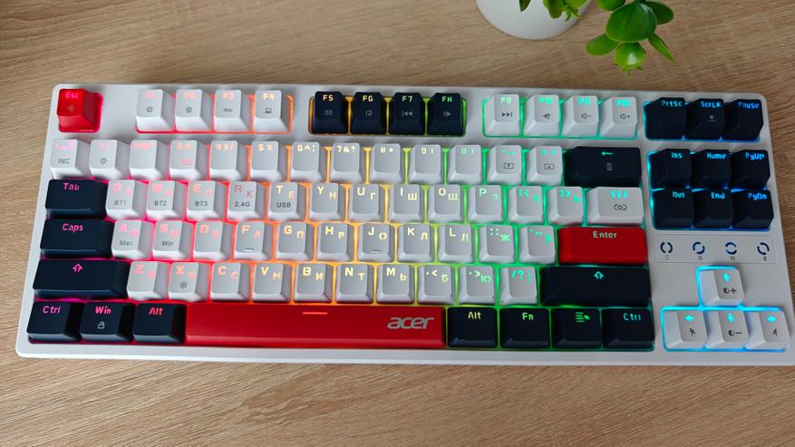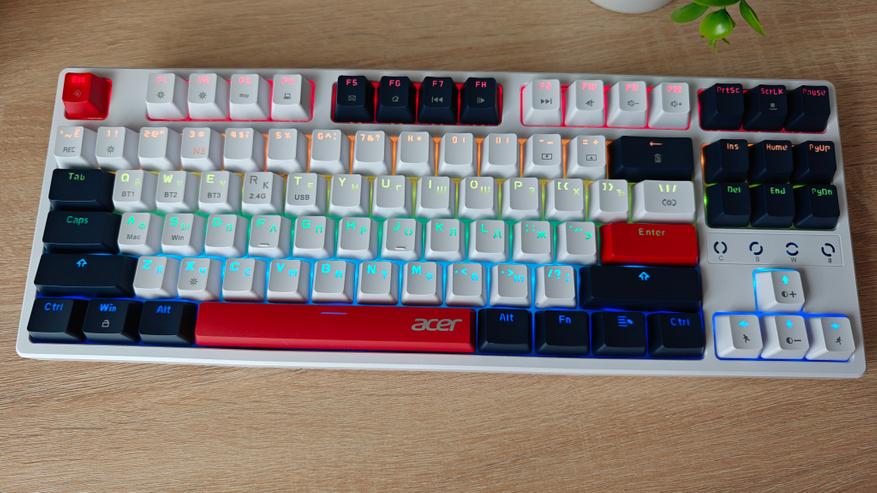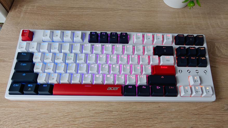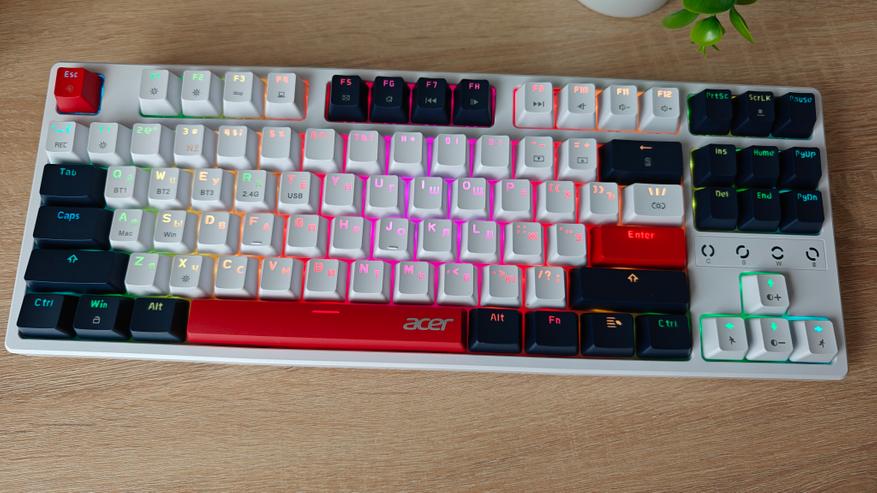 Компания Acer выпустила клавиатуру на механических переключателях, которая снабжена разнообразными вариантами подсветки и тремя вариантами подключения к ПК: проводной, через Bluetooth и через 2.4 ГГц передатчик. В дополнение к этому клавиатура имеет неограниченное распознавание нажатий NKRO 100%.