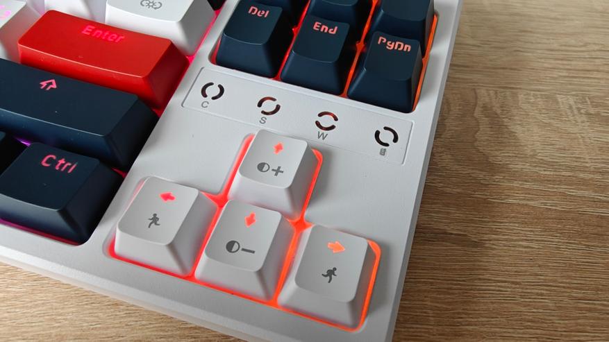 Клавиатура создана для игр, но и набор текста на ней возможен. Вообще, механические свичи дарят определенные ощущения от набора текста, но ожидать тактильного отклика как от старушки Microsoft не стоит. Все же тут больше про игры. Клавиатура имеет встроенную RGB подсветку с 17 запрограммированными режимами, которые переключаются при помощи функциональных кнопок. Яркость подсветки и скорость мерцания режимов можно регулировать стрелками. Кейкапы вогнуты к центру для комфортного положения пальцев.