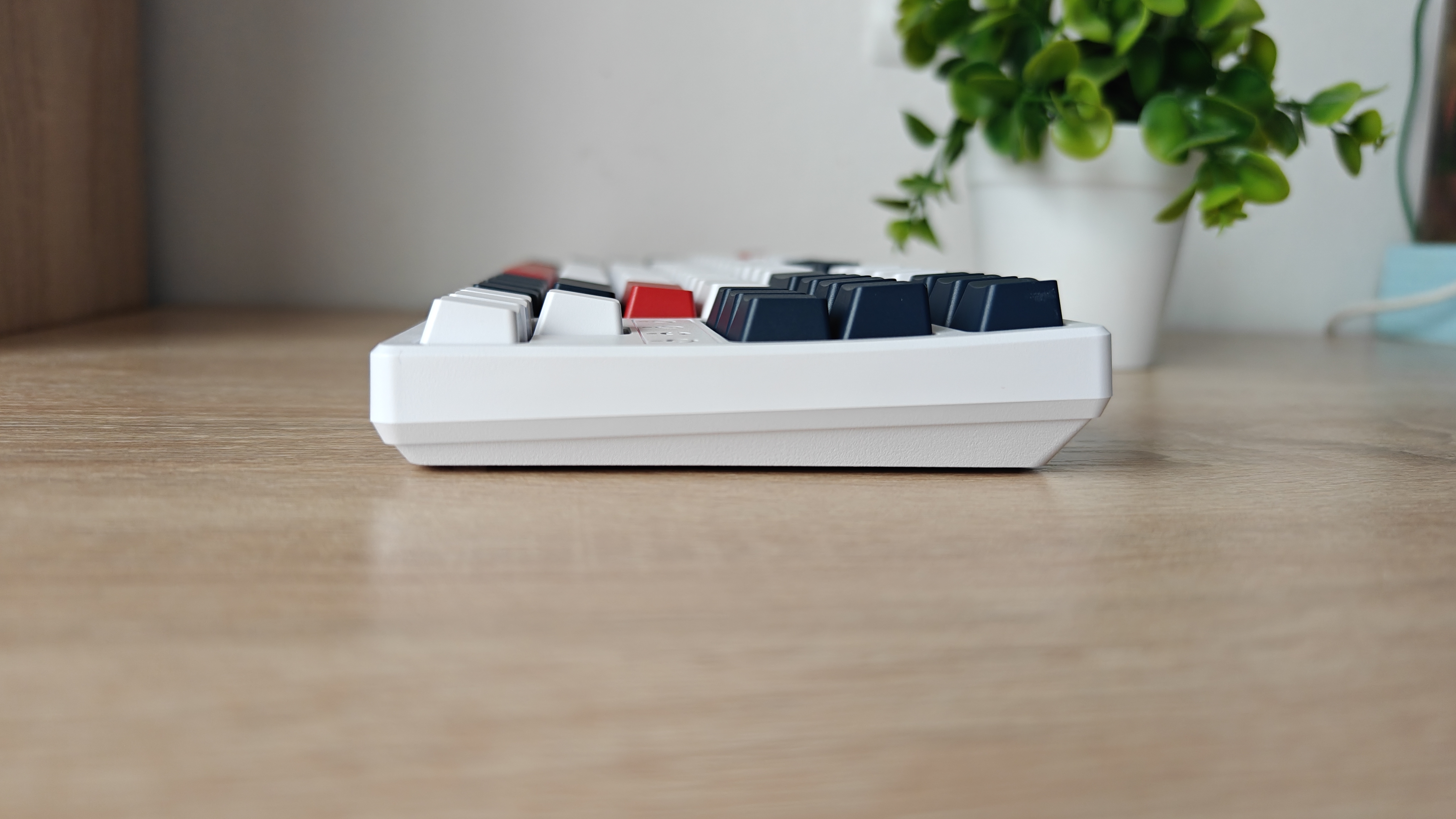 Клавиатура представлена в виде компактного варианта с 87 кнопками. Корпус клавиатуры выполнен из белого пластика, а оформление клавиш сразу привлекает взгляд. Не берусь утверждать насколько дизайн клавиатуры взят от других производителей, но он точно выделяется сочетанием белых, черных и красных клавиш. Корпус довольно увесистый, материалы крепкие, никакого люфта или скрипа нет, устройство сразу создает впечатление надежности. На красном пробеле нанесен логотип производителя. Радует отдельный островок клавиш стрелок, наличие кнопки WIN и кнопки вызова контекстного меню. Те, кто набирает много текстов сразу отметят наличие кнопок PageUp, PageDown, Home и End. Кнопки Esc, пробел и энтер красные.