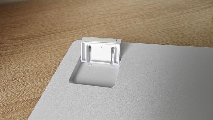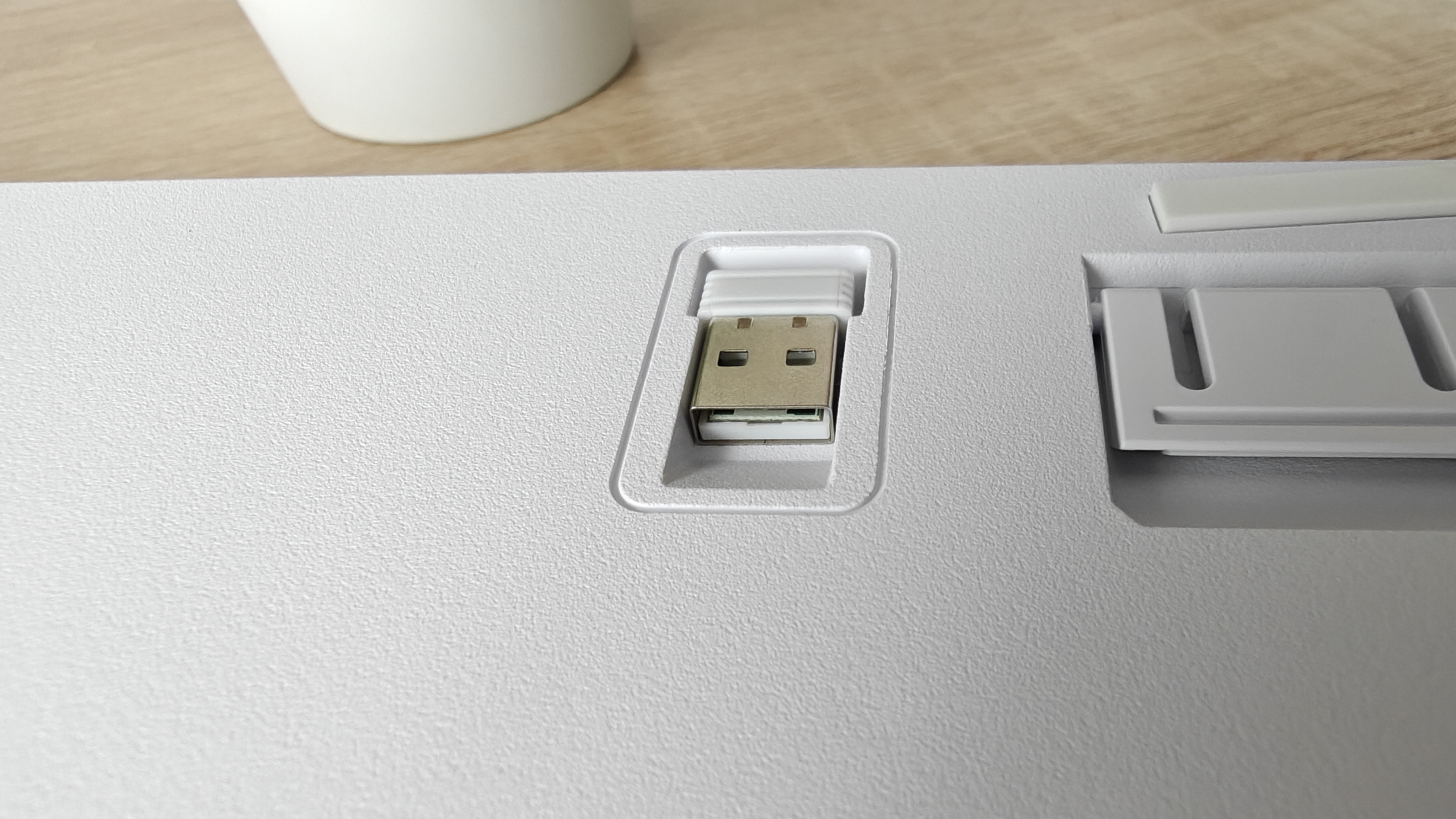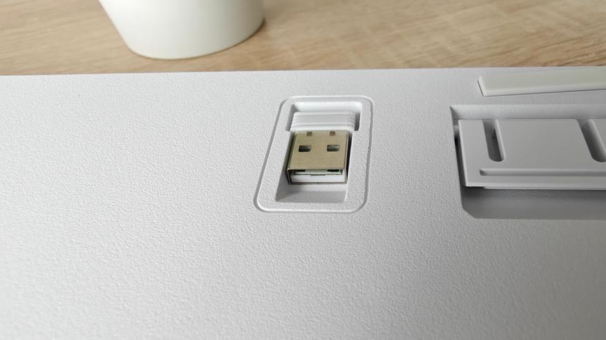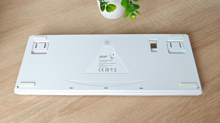Ножки, которые выдвигаются из корпуса, имеют жесткую фиксацию в двух положениях и резиновые накладки, чтобы клавиатура не скользила по столу. По центру на выделенном трапецией участке расположили информацию о модели, а также механический выключатель. Отдельно отмечу наличие места хранения 2.4 ГГц передатчика.