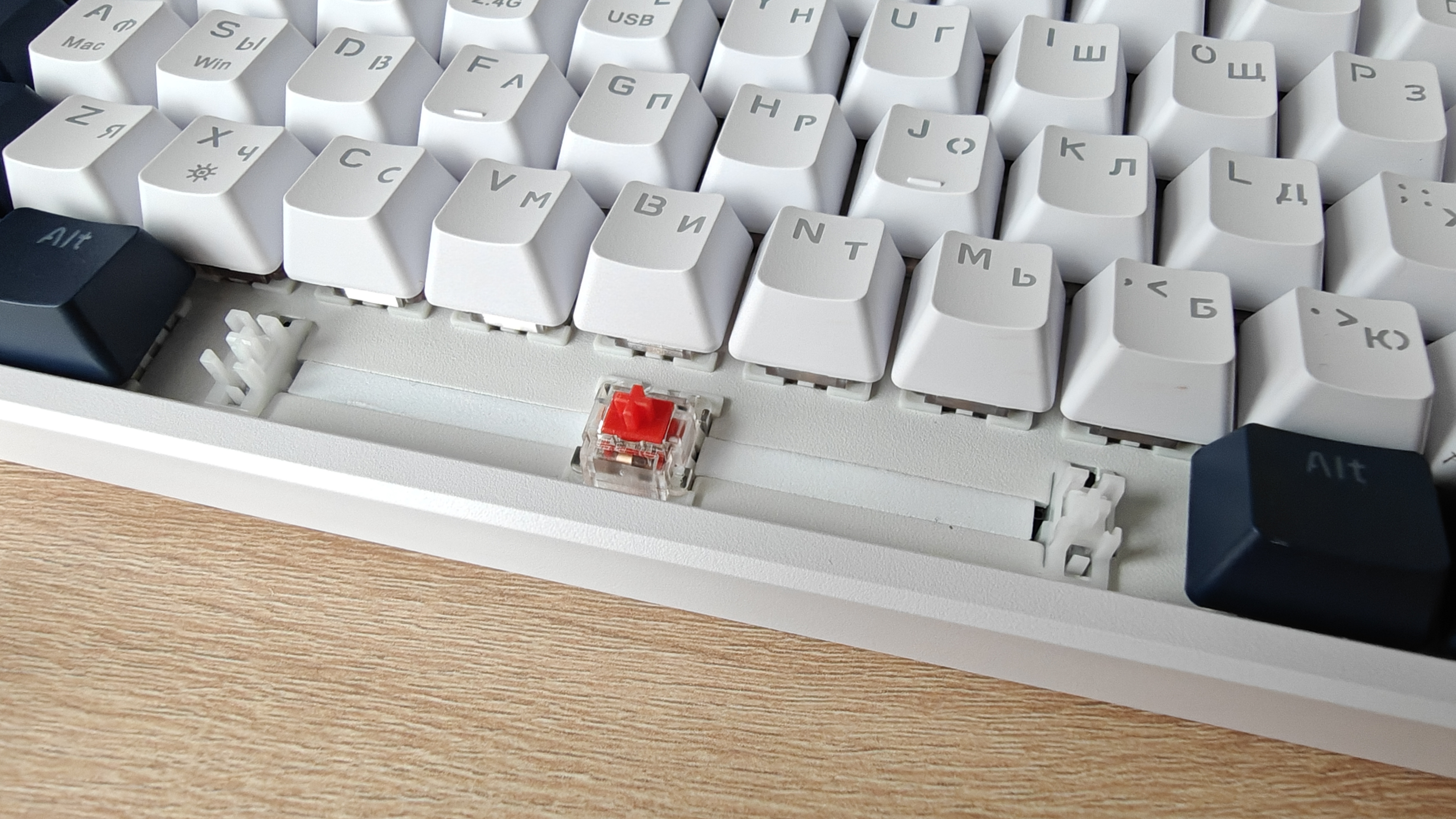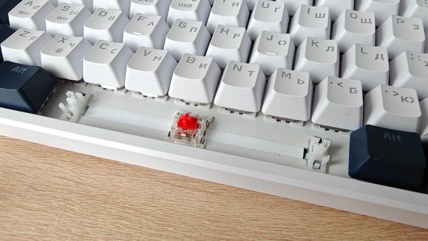 Для снятий кейкапов используем комплектный пулер. Клавиатура реализована на красных свичах Outemu Red. Это тихие линейные переключатели с усилием 50 грамм, ход всего 4 мм, низкая шумность и плавный ход. Тактильного отклика практически нет, такие свичи используются специально в игровых клавиатурах, потому что постоянные щелчки обычно отвлекают от игр.