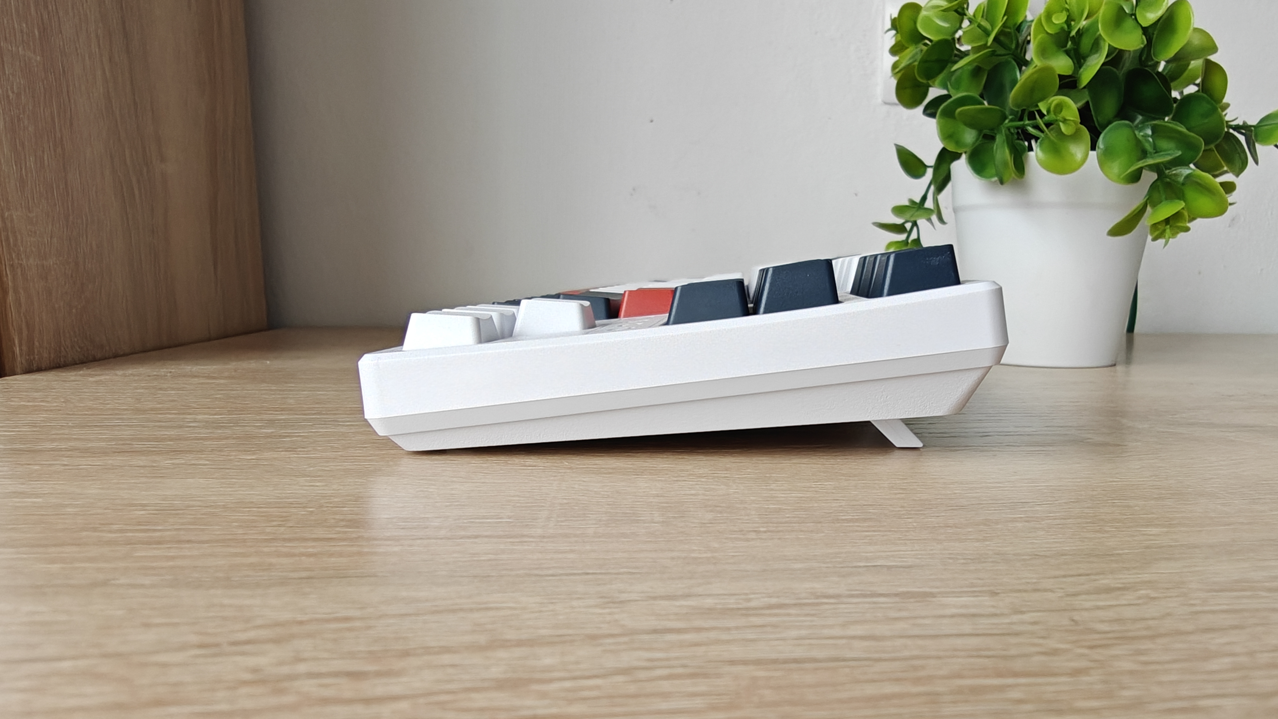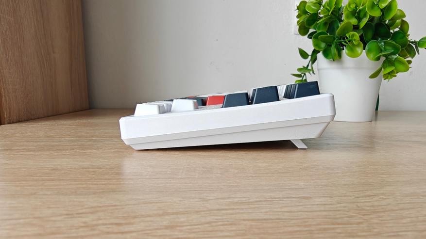 При взгляде сбоку видно, что клавиатура и без выдвигаемых ножек имеет наклон. Клавиши имеют волнообразный профиль с углублением в центре.