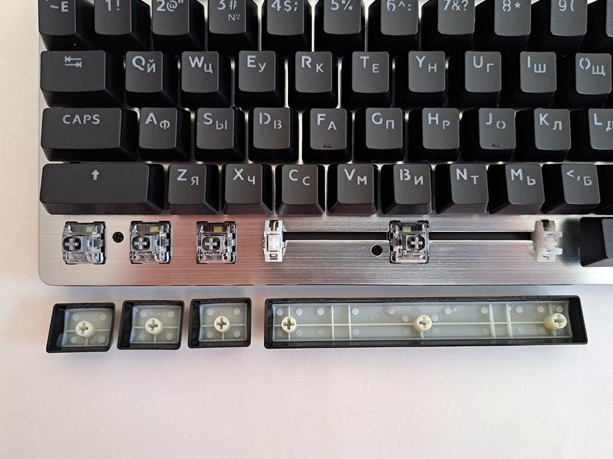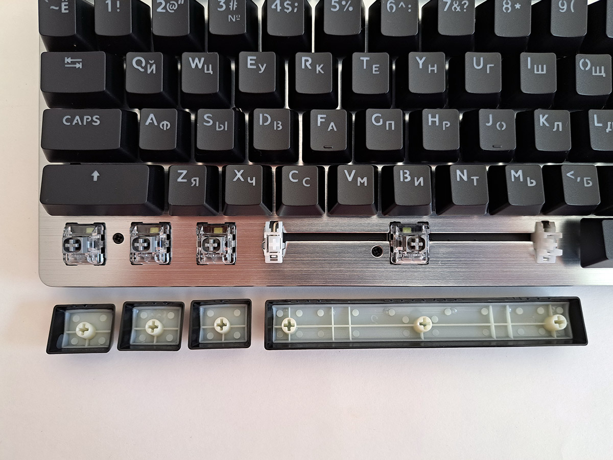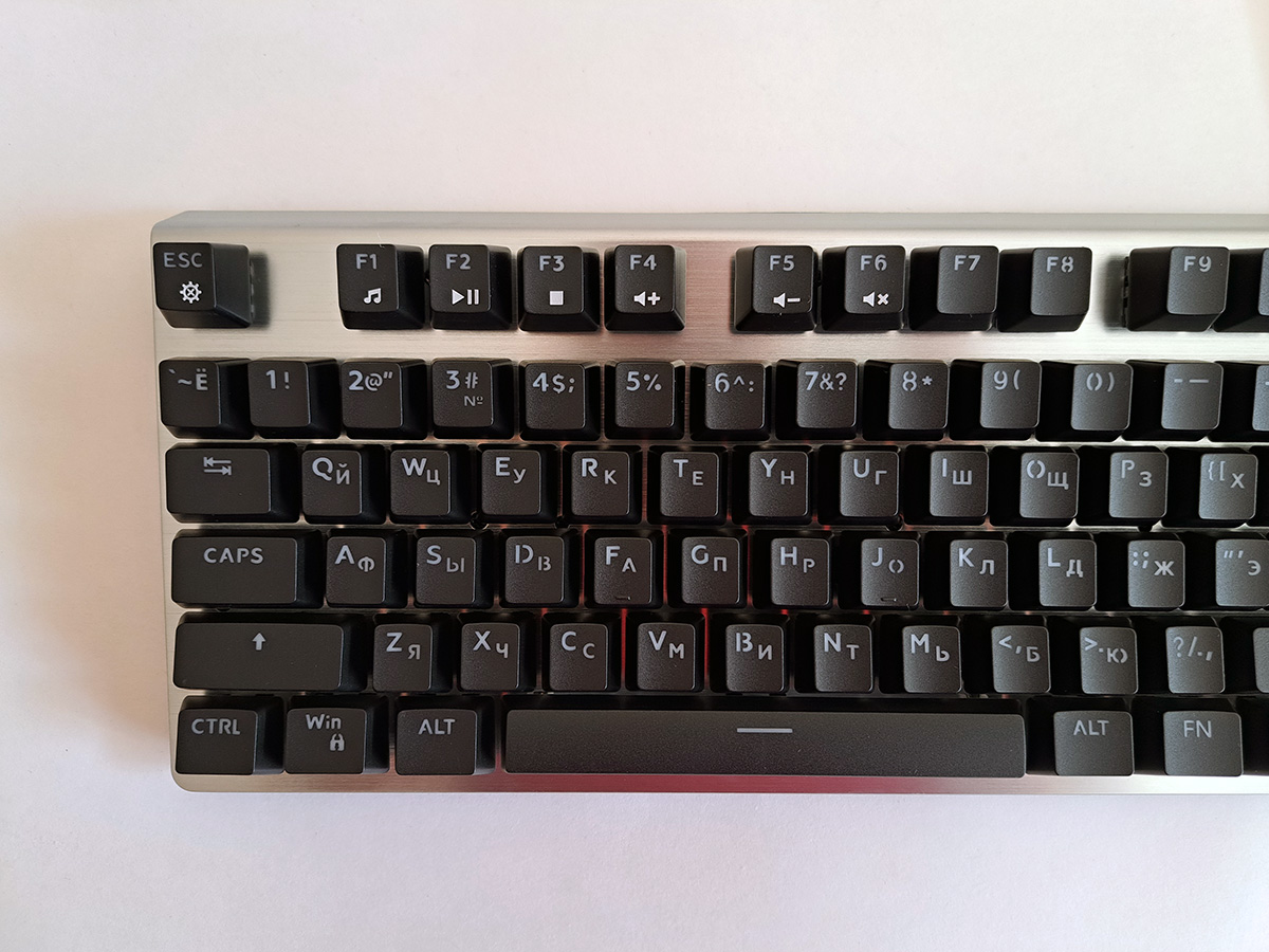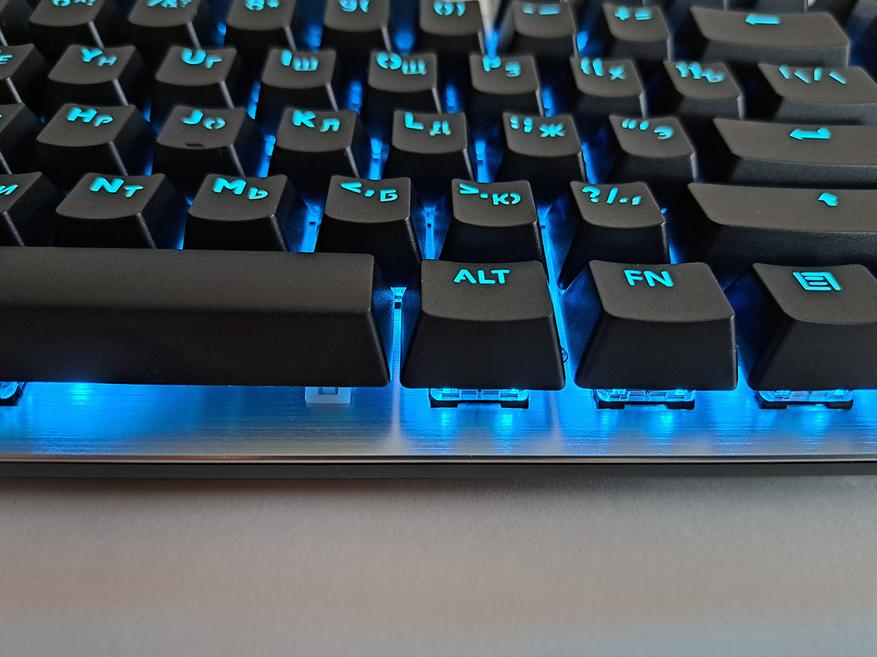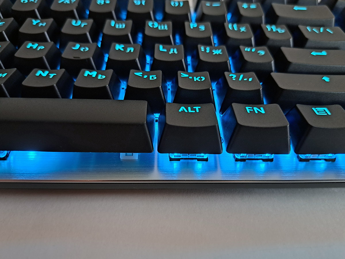 Клавиатура со стандартной ANSI раскладкой русифицирована. Кириллические символы распложены чуть выше середины клавиш, рядом с латинскими. Выглядит слишком скученно, но такова реализация подсветки у большинства механических клавиатур.
