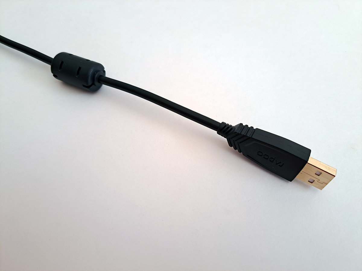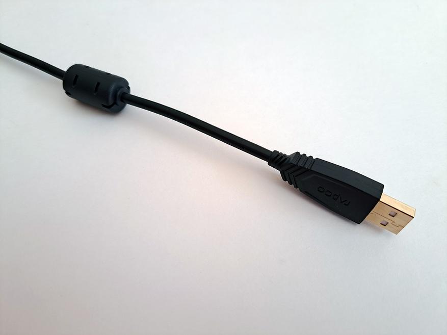Кабель у клавиатуры неотсоединяемый, длина его составляет 180 см. Сам кабель довольно толстый и мягкий, с гладкой оболочкой. Рядом с USB Type A коннектором расположен ферритовый фильтр.