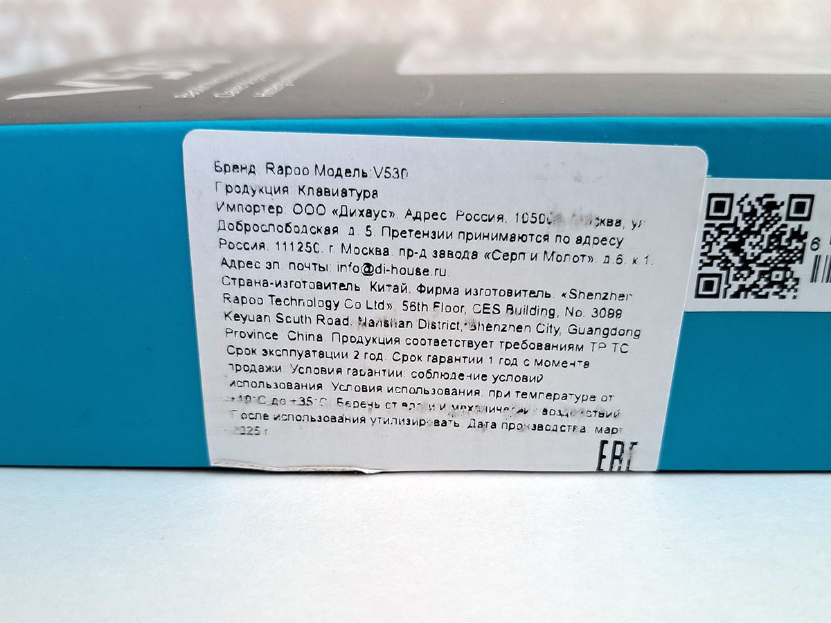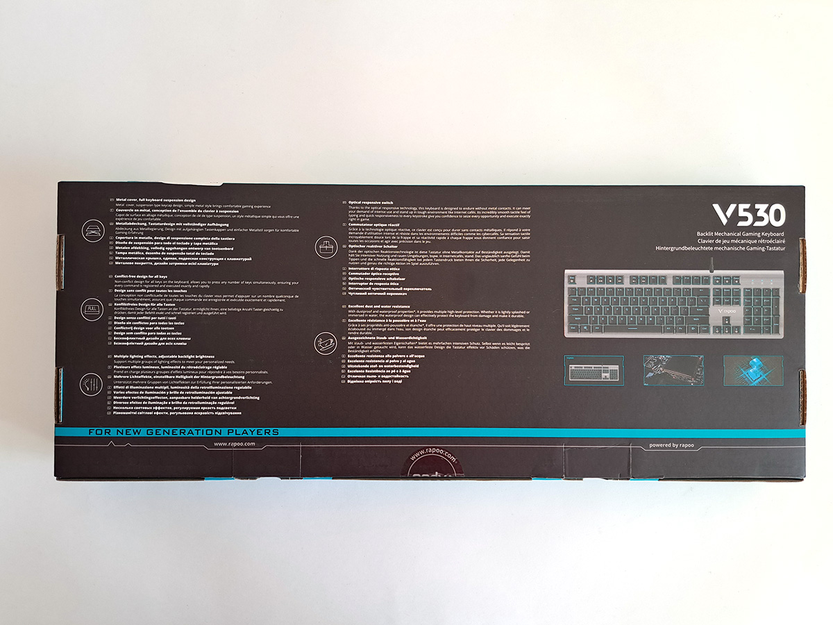 Коробка в черных тонах с яркими боковинками в фирменном цвете Rapoo — циан.