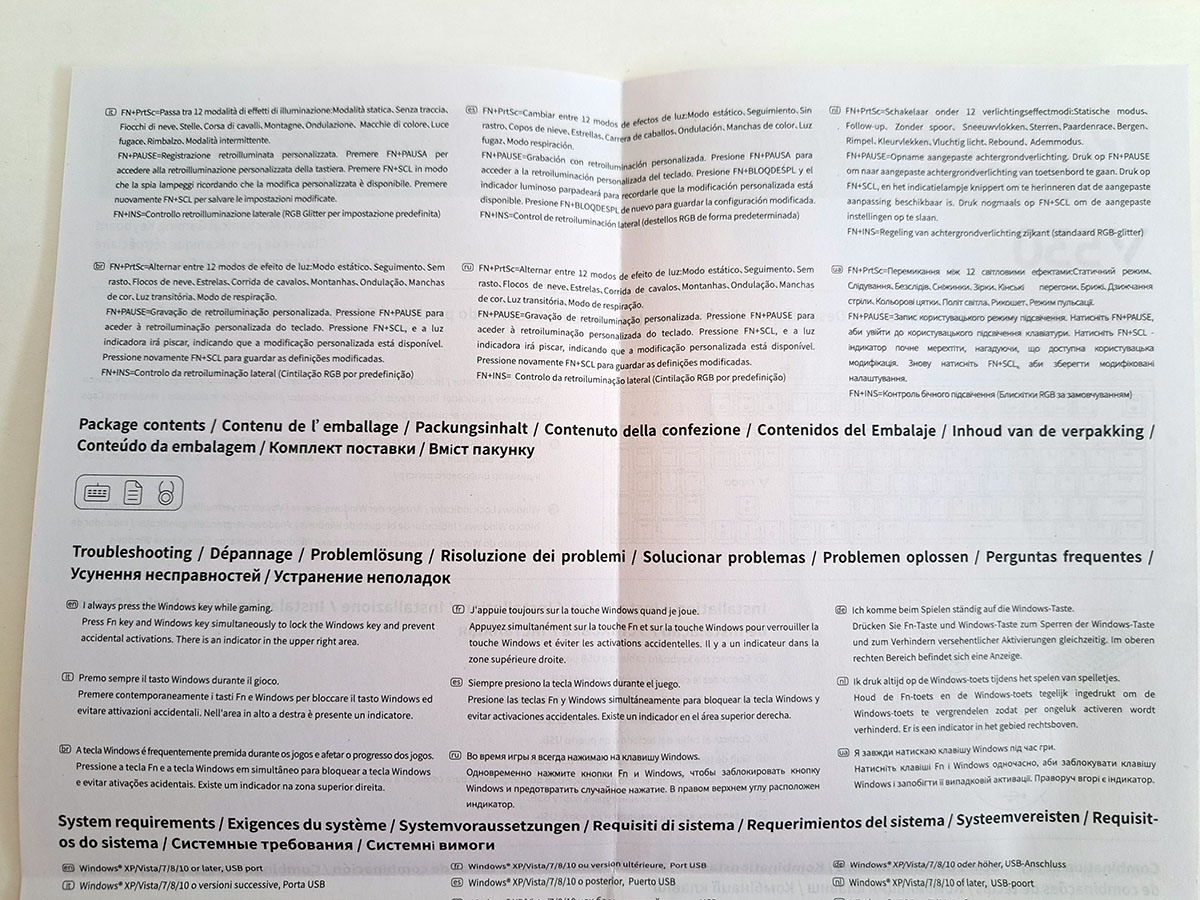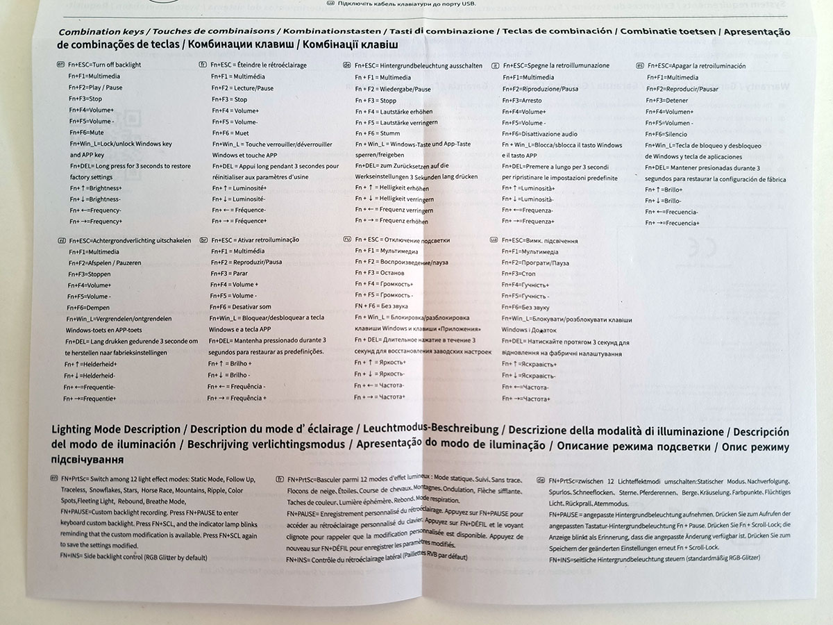Мультиязычная инструкция довольно краткая: из полезного вы там можете узнать несколько сочетаний мультимедийных клавиш с клавишей Fn, а также кнопках настройки подсветки.
