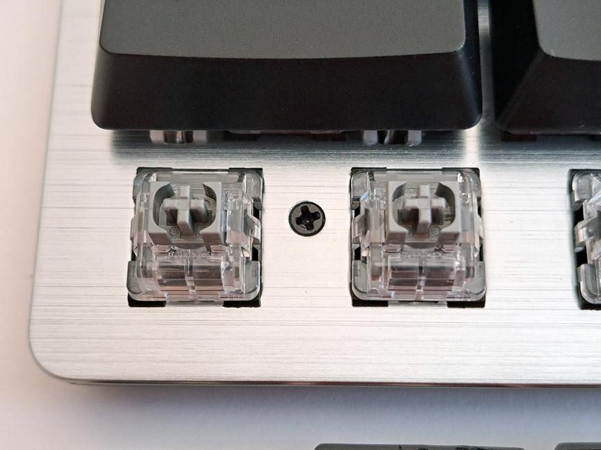 Клавиатура довольно шумная. Звук переключателей по громкости напоминает оригинальные Cherry MX Blue. К отчетливому «клацанью» добавляются удары кейкапов о металлическую верхнюю крышку.