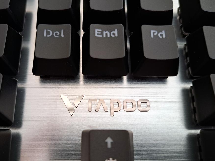 Полноразмерная клавиатура (104 клавиши) в корпусе с алюминиевой крышкой обладающим защитой от пыли и влаги. Переключатели Rapoo Silver с ресурсом в 50 млн. нажатий. Также имеется настраиваемая подсветка.
