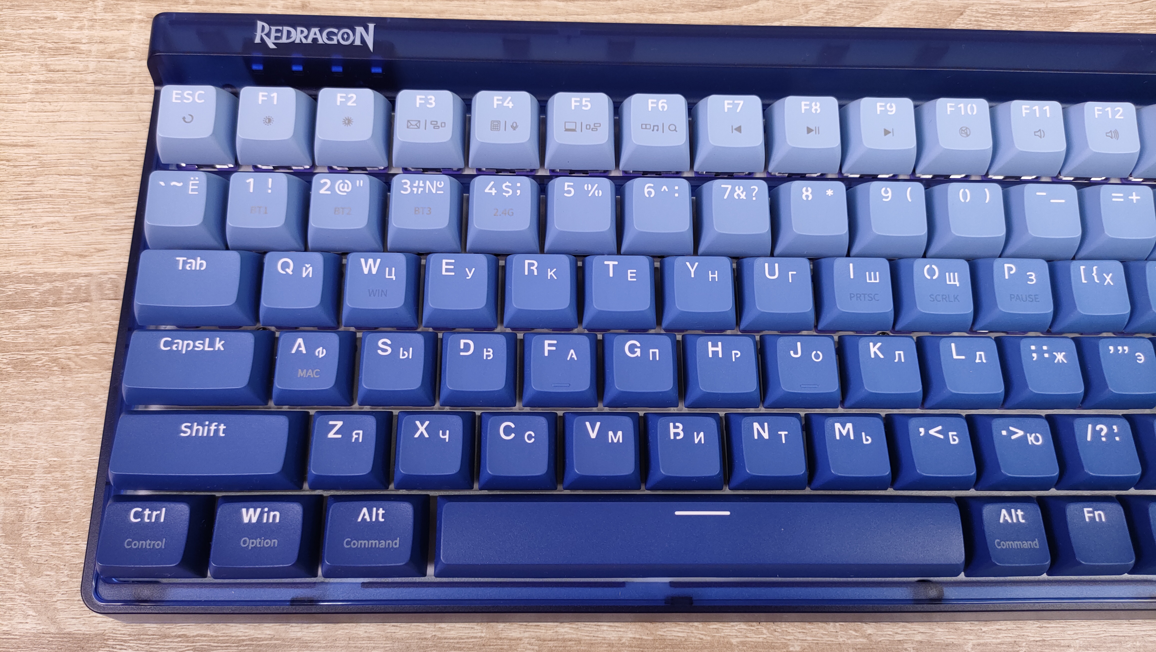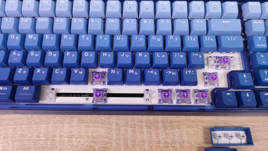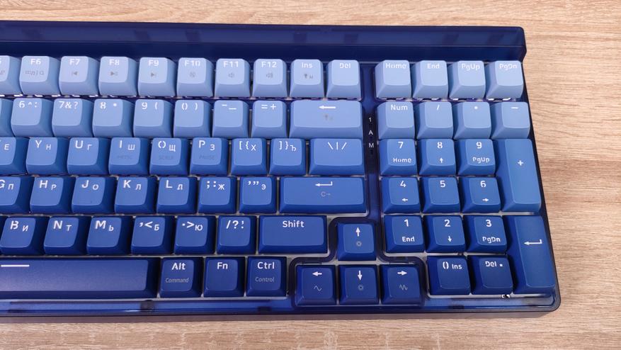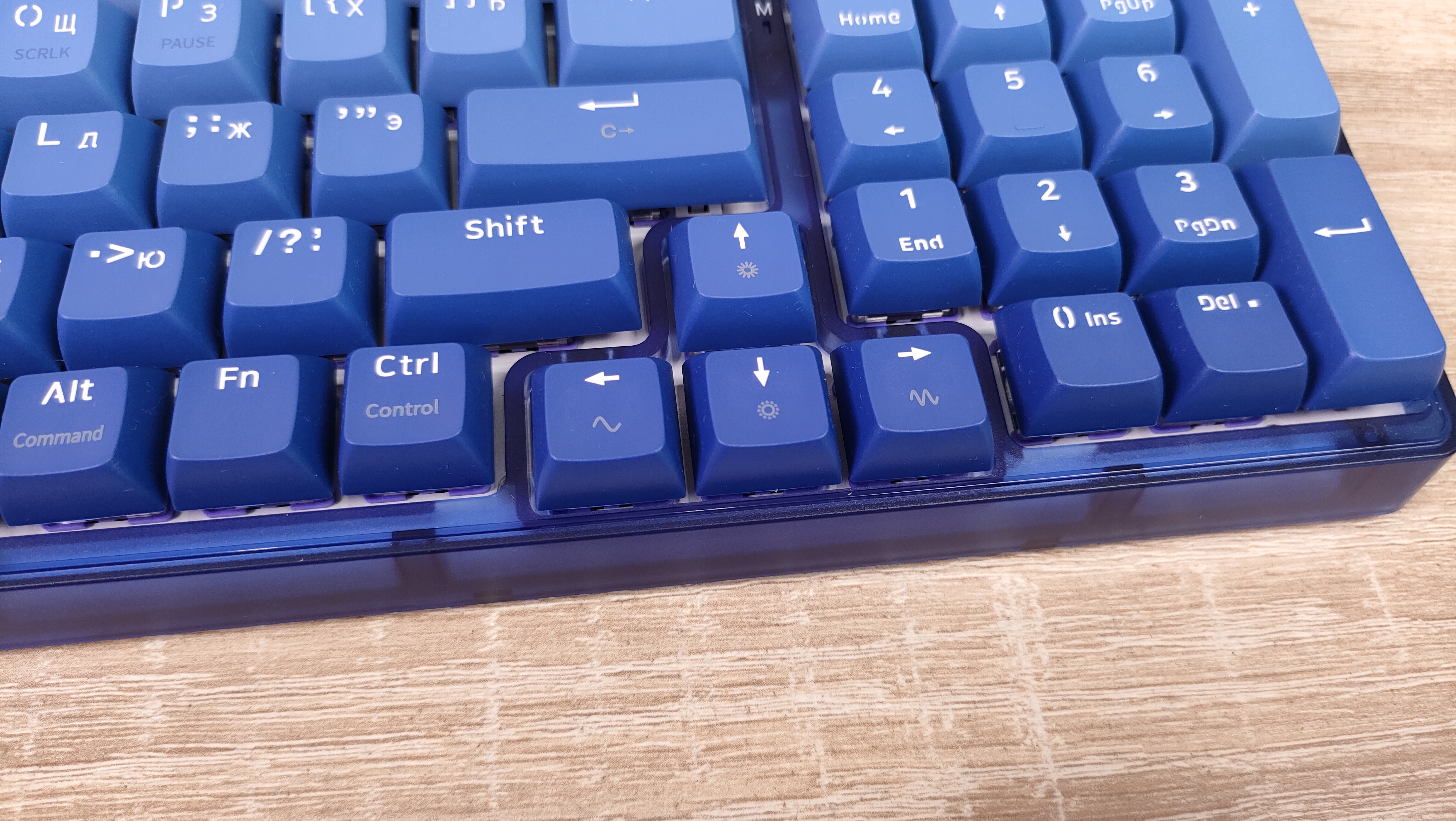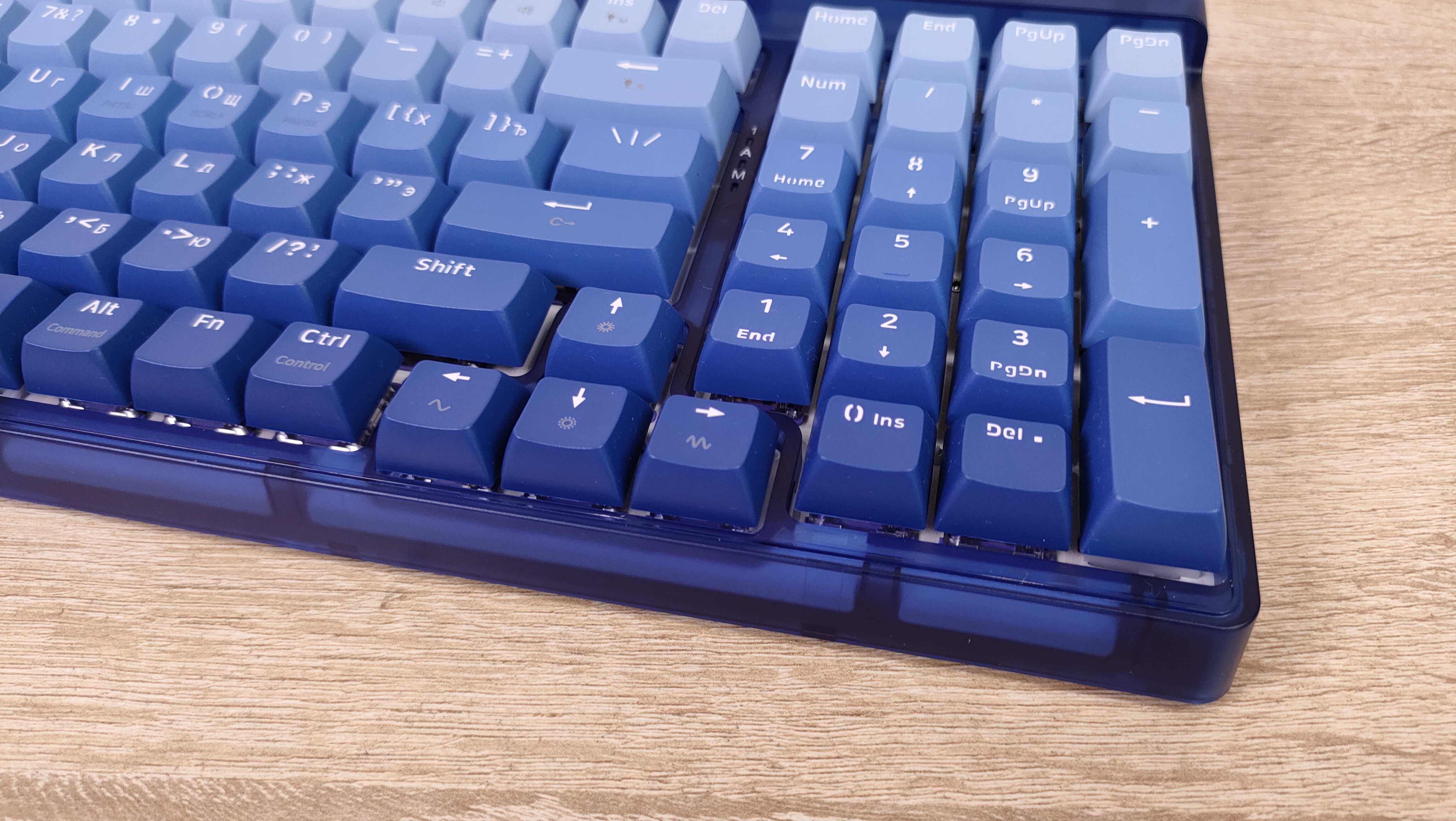 При взгляде на клавиатуру и её цвет, меня не покидало ощущение дежавю, мне даже пришла в голову фраза «небесная синева», именно её я поставил в названии обзора клавиатуры Machenike K600S. В данном случае, клавиатура является полным аналогом той, ну, или та является аналогом этой. Скорее всего, корни обоих устройств ведут на один завод, и в этом нет ничего плохого, реальных производителей не так много, поэтому не исключено что многие продукты делаются на одних и тех же заводах, кто-то со своими требованиями, кто-то без. В отличие от клавиатуры, протестированной ранее, в Garen Pro есть кириллица, а также совершенно не рядовые переключатели, ведь 80% производителей ставят линейные, а вот в данном случае тактильные, что уже придаёт определённый шарм данному манипулятору. Если отойти от этой лирики, то внешний вид клавиатуры мне нравится, как минимум, тем, что выбивается из общей бело-серо-чёрной массы. Во-первых, градиентная расцветка мне нравится практически в любых цветовых вариациях, во-вторых, здесь полупрозрачный корпус, в-третьих, очень многим понравится практически полный формат клавиатуры, в данном случае примерно 96%. К качеству изготовления и сборки у меня вопросов нет.