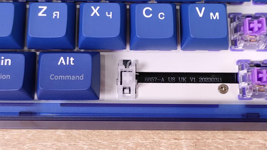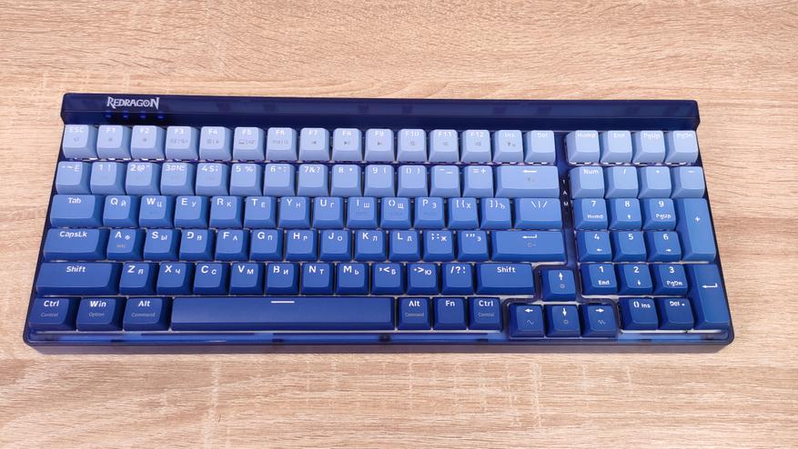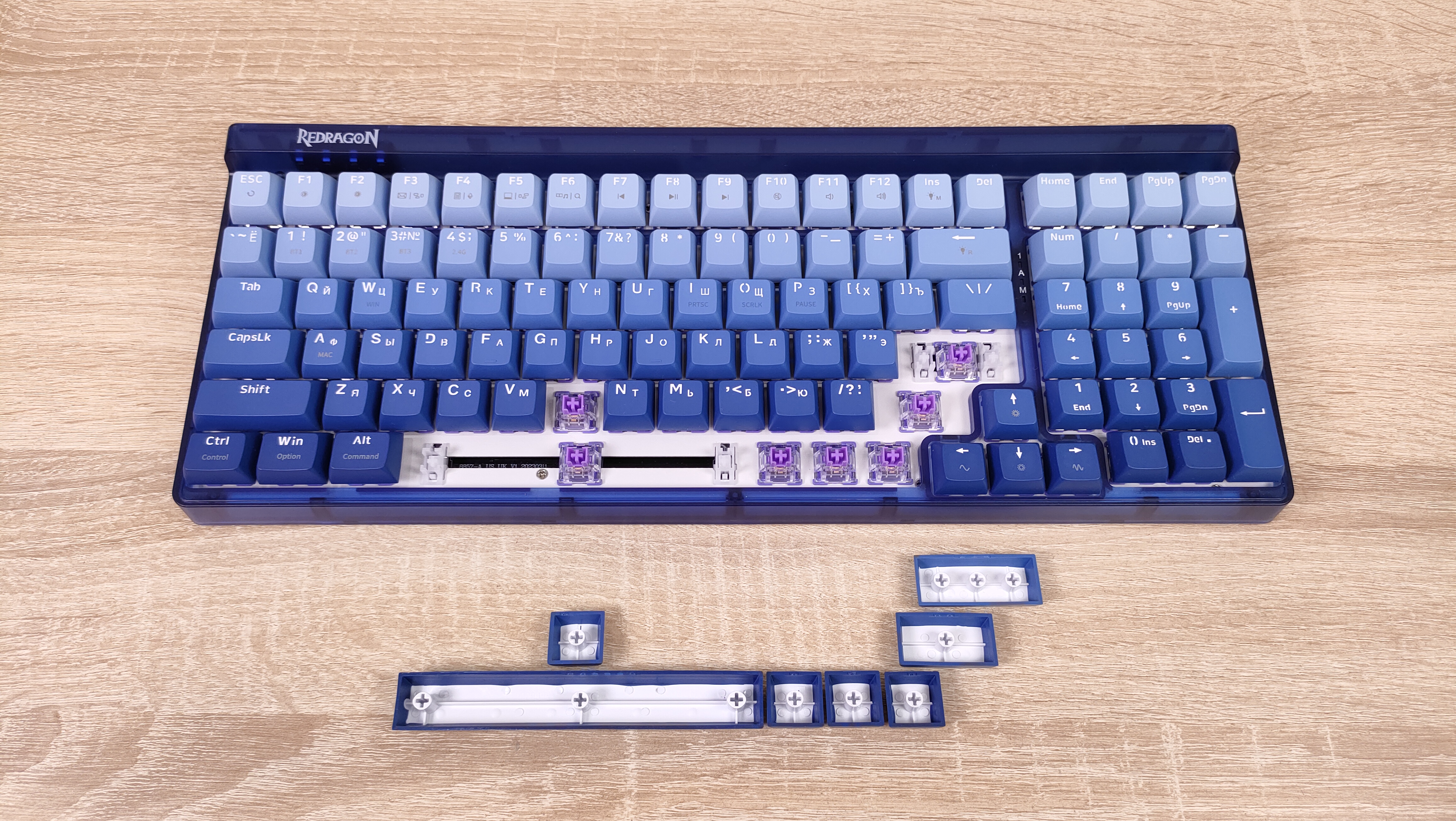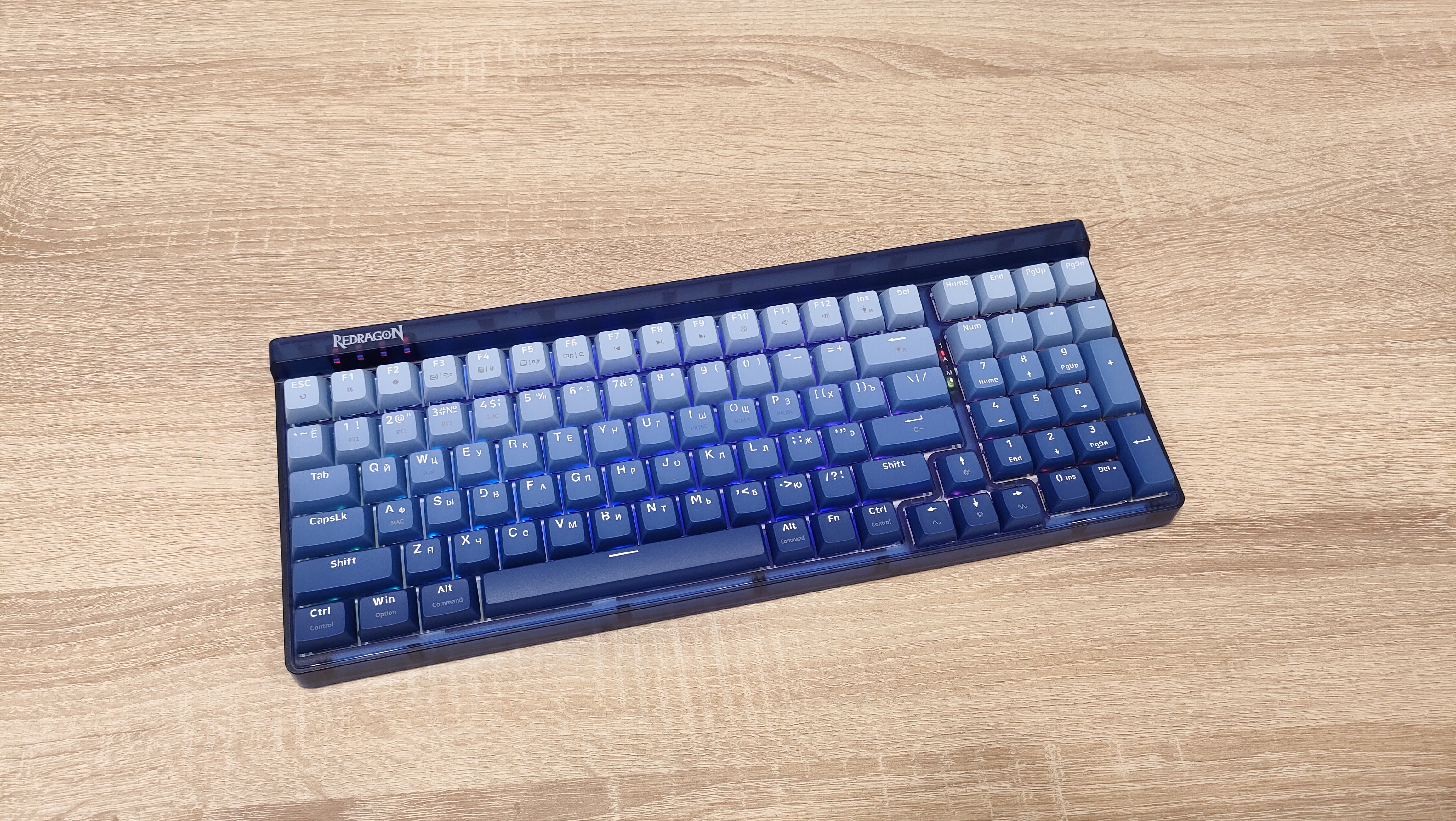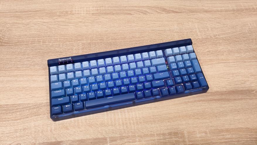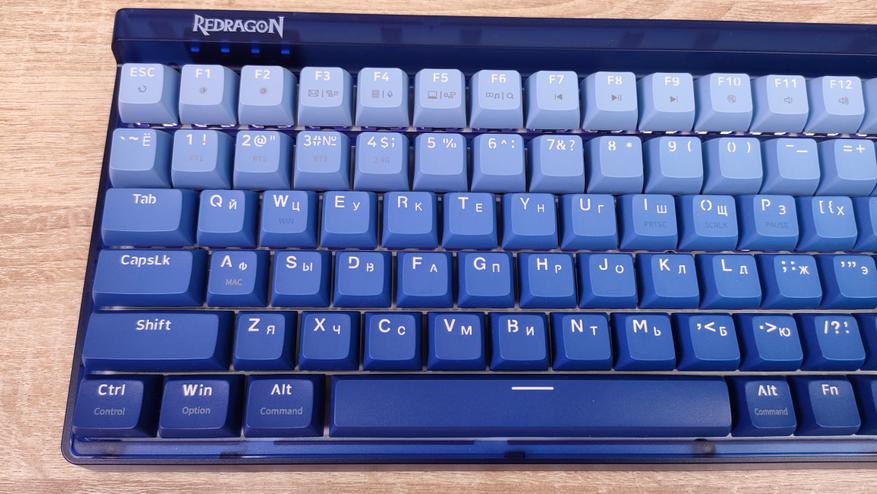 При взгляде на клавиатуру и её цвет, меня не покидало ощущение дежавю, мне даже пришла в голову фраза «небесная синева», именно её я поставил в названии обзора клавиатуры Machenike K600S. В данном случае, клавиатура является полным аналогом той, ну, или та является аналогом этой. Скорее всего, корни обоих устройств ведут на один завод, и в этом нет ничего плохого, реальных производителей не так много, поэтому не исключено что многие продукты делаются на одних и тех же заводах, кто-то со своими требованиями, кто-то без. В отличие от клавиатуры, протестированной ранее, в Garen Pro есть кириллица, а также совершенно не рядовые переключатели, ведь 80% производителей ставят линейные, а вот в данном случае тактильные, что уже придаёт определённый шарм данному манипулятору. Если отойти от этой лирики, то внешний вид клавиатуры мне нравится, как минимум, тем, что выбивается из общей бело-серо-чёрной массы. Во-первых, градиентная расцветка мне нравится практически в любых цветовых вариациях, во-вторых, здесь полупрозрачный корпус, в-третьих, очень многим понравится практически полный формат клавиатуры, в данном случае примерно 96%. К качеству изготовления и сборки у меня вопросов нет.