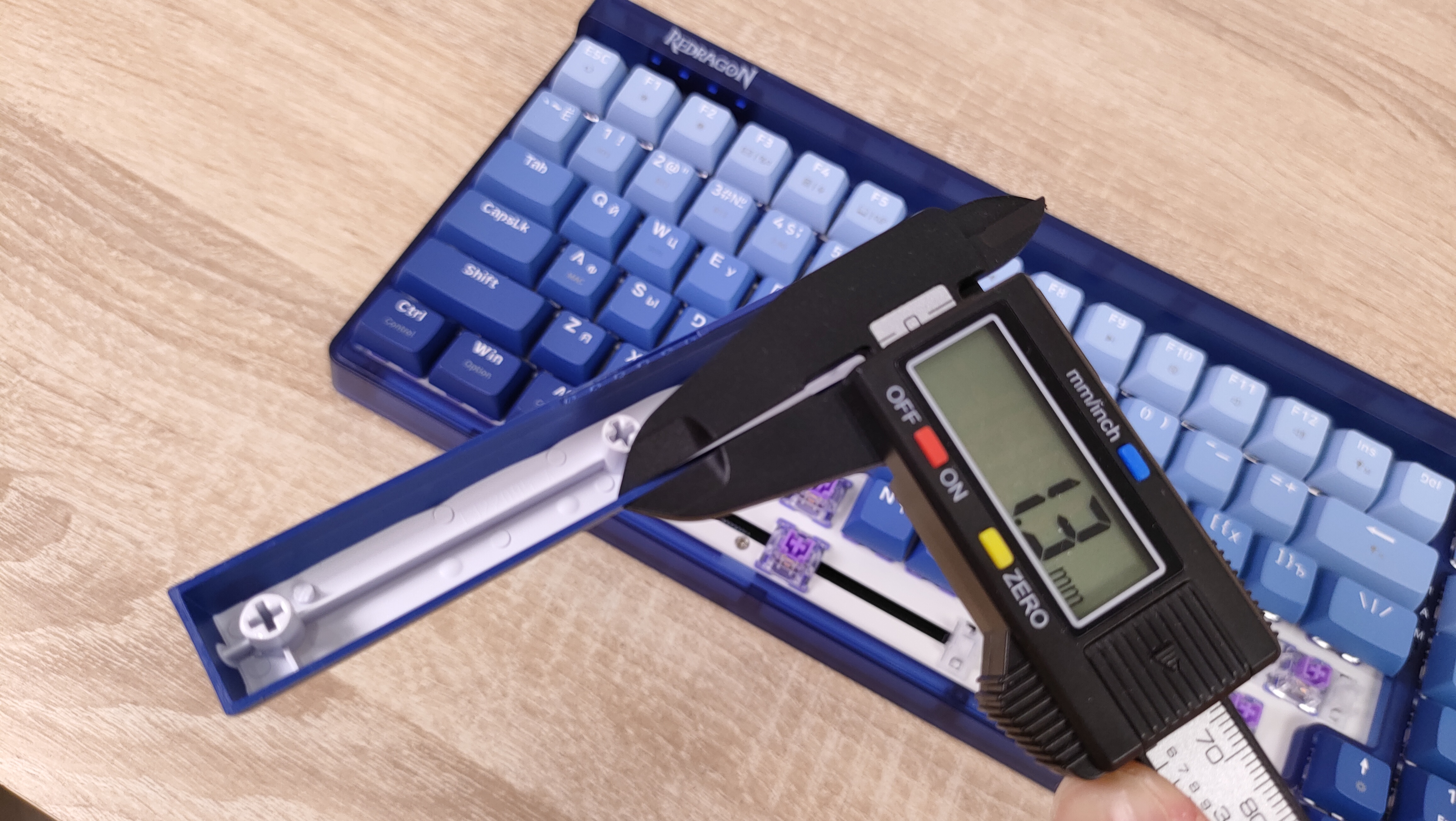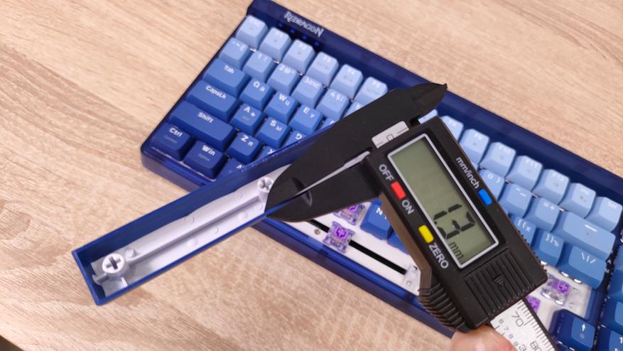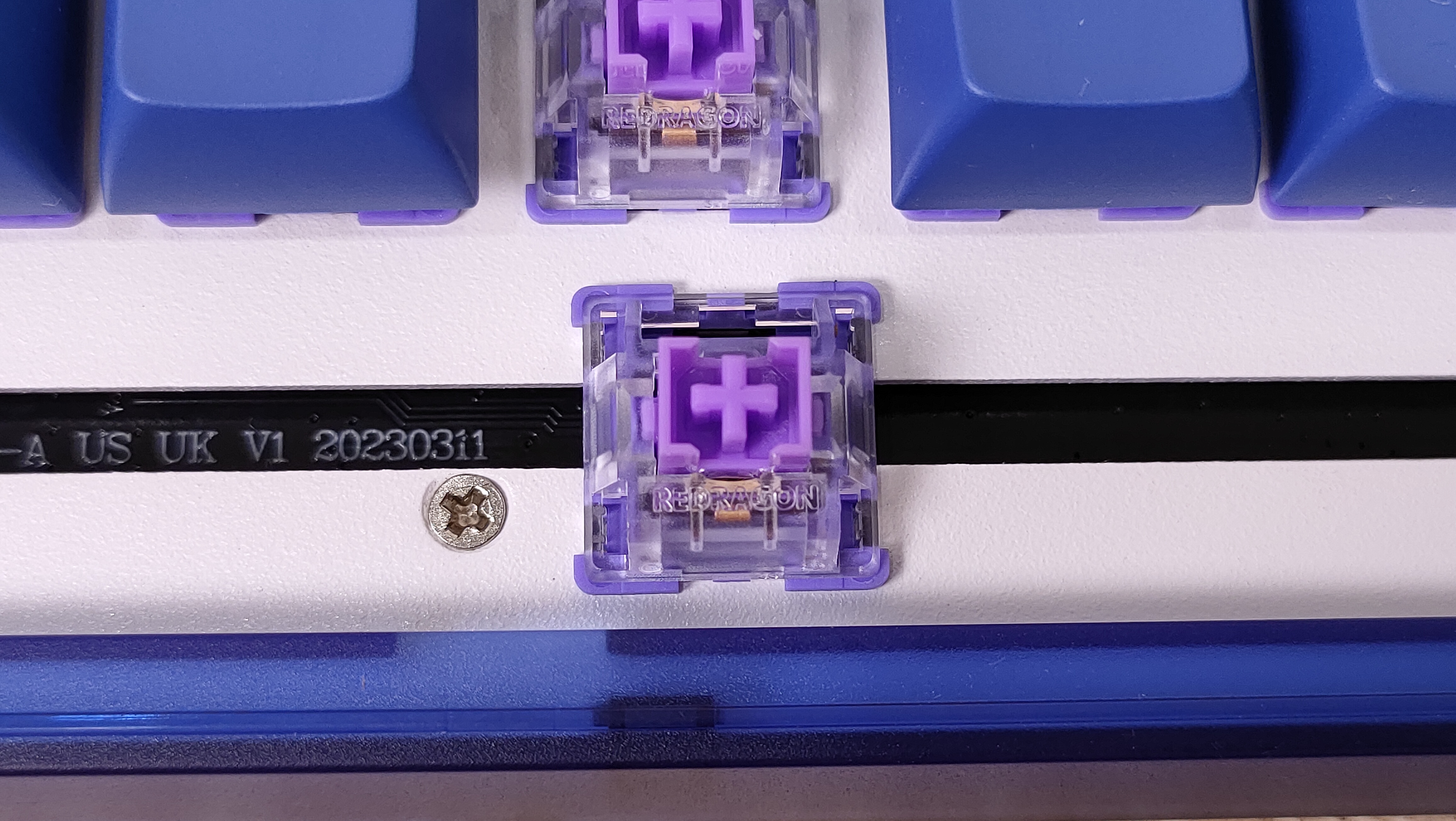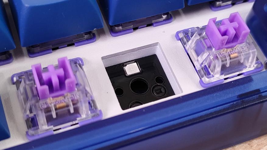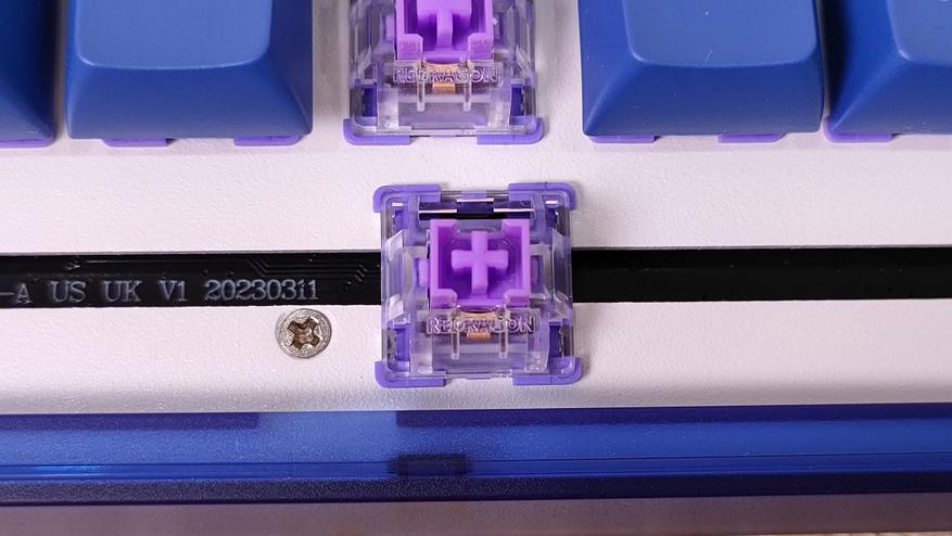 В клавиатуре установлены переключатели Redragon Purple: механический тактильный тип, 55 грамм на срабатывание, есть отчетливый порог срабатывания, ход срабатывания указан как 1.1 мм, хотя по ощущениям более менее стандартные 2 мм. Горячую замену поддерживают, с завода смазаны, причём смазано неплохо. Под пластиной позиционирования видны слои шумоизоляции в сочетании с северным светодиодом.